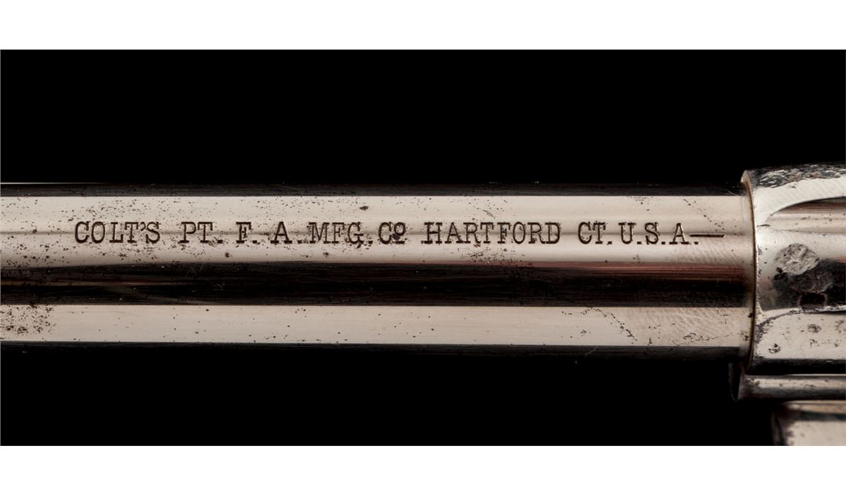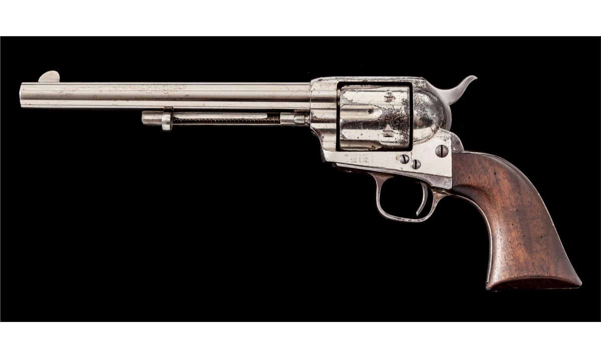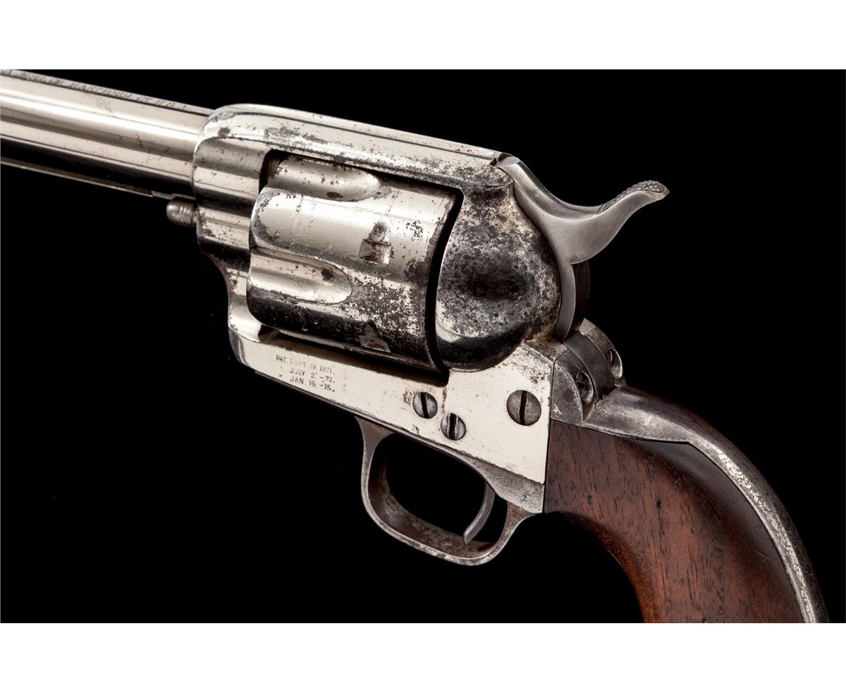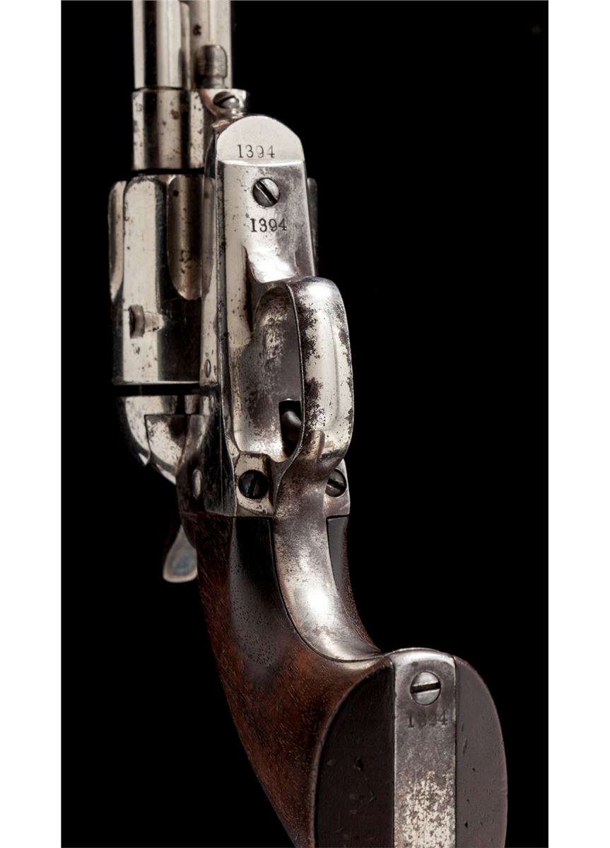 Scarce High Condition Colt Rimfire Single Action Revolver, #1394, .44 RF (Henry) cal., 7-1/2'' barrel, nickel finish, with one-piece walnut grips. These revolvers are considered scarce with only approx. 1863 mfg'd, with most mfg'd between 1875-1878. Revolvers in this caliber show hard use due to the fact that because the cartridge was obsolete, many were shipped to foreign countries where hard use and little care was the norm. Many were later converted to .22 LR prior to their shipment. Condition is near excellent. Barrel and ejector rod tube retain approx. 94% thinning nickel with small areas of lifting finish to top of ejector rod housing. Cylinder retains 85%-90% nickel with scuffs and scratches to forward edges, and minor erosion to rear portion. Left side recoil shield shows slightly more moderate pitting and cleaning, with only about 30% original nickel remaining in that area; backstrap and triggerguard retain approx. 70% original nickel as well. Vivid case colored hues in protected area of hammer. Cylinder pin may be a later replacement. Grips with fractional shrinkage but generally fit very well. Action is good, bore is very good to near fine and shows no evidence of later lengthening. Est.: $8,000-$12,000. (Antique)