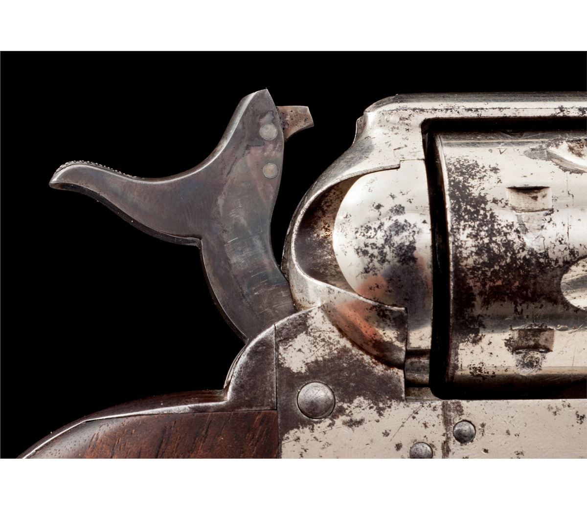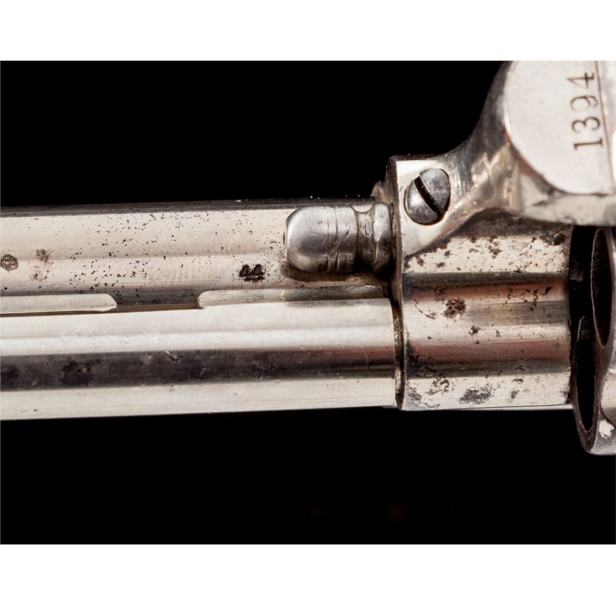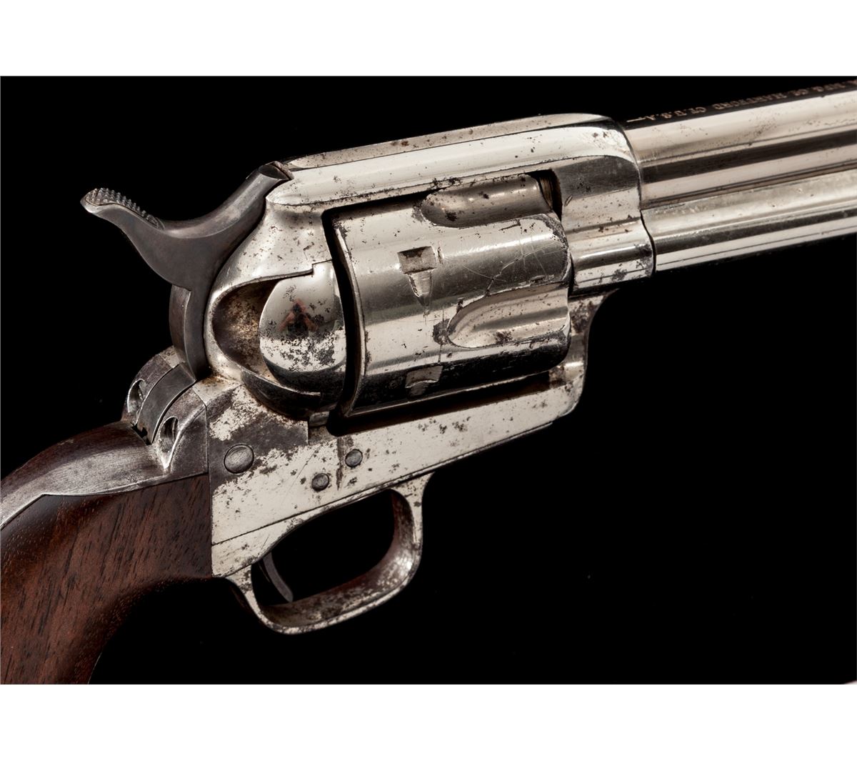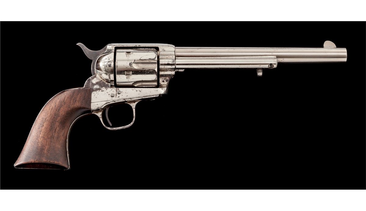 Scarce High Condition Colt Rimfire Single Action Revolver, #1394, .44 RF (Henry) cal., 7-1/2'' barrel, nickel finish, with one-piece walnut grips. These revolvers are considered scarce with only approx. 1863 mfg'd, with most mfg'd between 1875-1878. Revolvers in this caliber show hard use due to the fact that because the cartridge was obsolete, many were shipped to foreign countries where hard use and little care was the norm. Many were later converted to .22 LR prior to their shipment. Condition is near excellent. Barrel and ejector rod tube retain approx. 94% thinning nickel with small areas of lifting finish to top of ejector rod housing. Cylinder retains 85%-90% nickel with scuffs and scratches to forward edges, and minor erosion to rear portion. Left side recoil shield shows slightly more moderate pitting and cleaning, with only about 30% original nickel remaining in that area; backstrap and triggerguard retain approx. 70% original nickel as well. Vivid case colored hues in protected area of hammer. Cylinder pin may be a later replacement. Grips with fractional shrinkage but generally fit very well. Action is good, bore is very good to near fine and shows no evidence of later lengthening. Est.: $8,000-$12,000. (Antique)