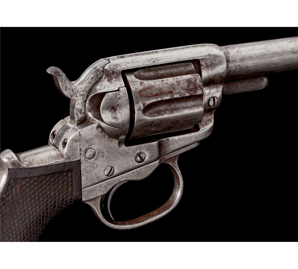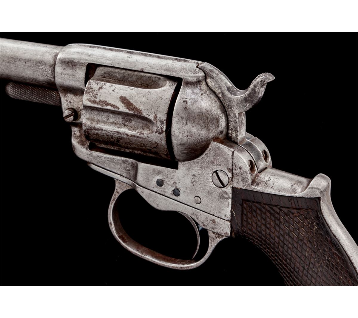 Early 1st Year of Production Colt Lightning Model 1877 Double Action Revolver, #417, .38 Colt cal., 3-1/2'' ejectorless barrel, originally with blue finish, checkered rosewood grips, and nickel silver front sight. Condition is good to very good with little original finish remaining. Grips with moderate flattening to both sides. Trigger return spring needs repair. Bore is fair and should clean a little. Est.: $450-$600. (Antique)