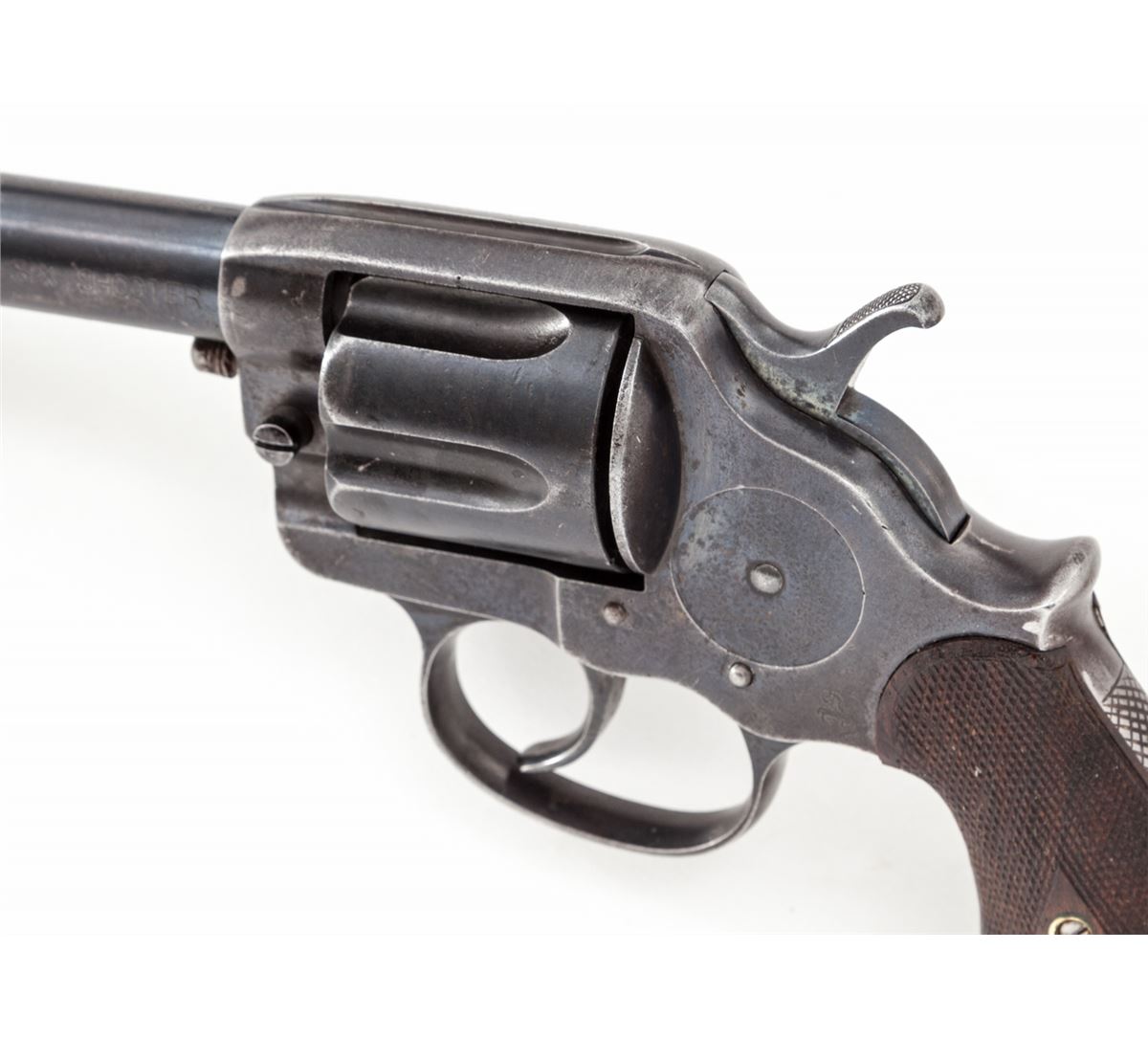 Colt Model 1878 Frontier Six Shooter Double Action Revolver, #32365, .44-40 cal., 7-1/2'' barrel, blue finish, checkered walnut grips, with lanyard loop in butt. Mfg'd 1893. Condition is very good retaining approx. 85% blue. Grips show evidence of recheckering; backstrap has been period checkered. Action is crisp, bore is very good. Est.: $1,200-$1,800. (Antique)