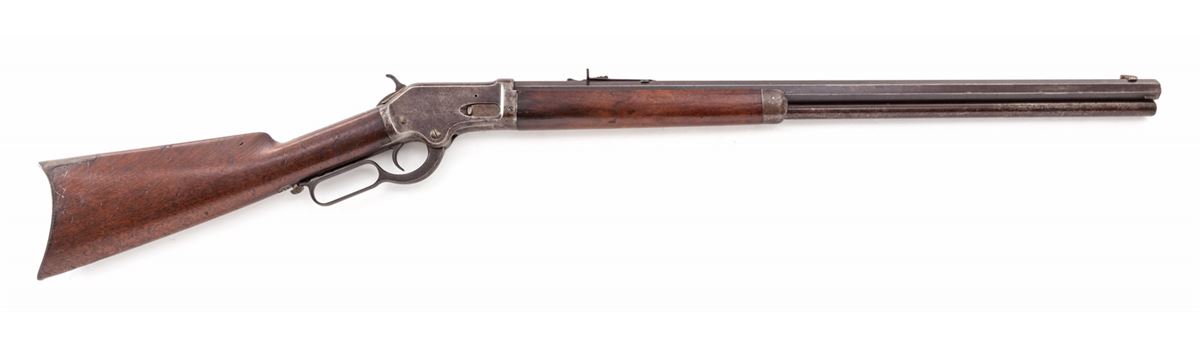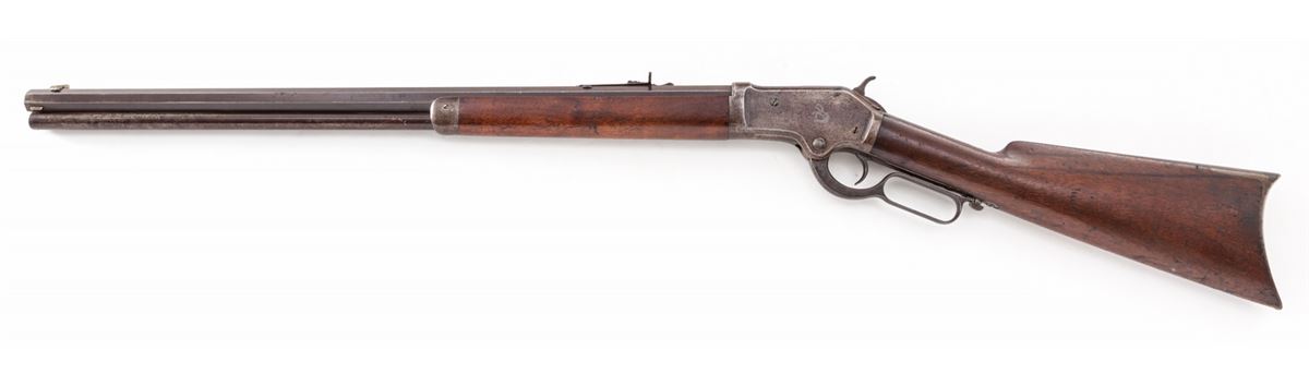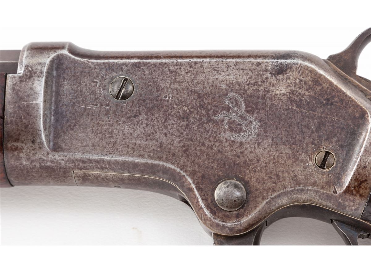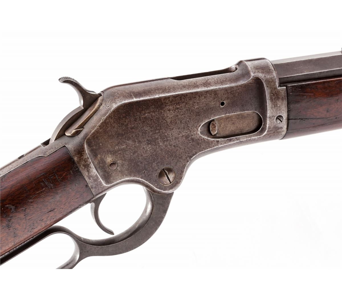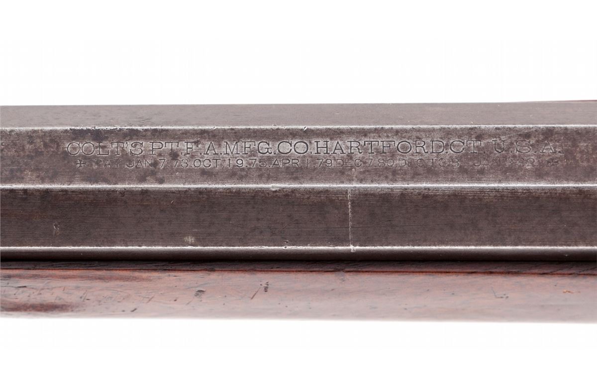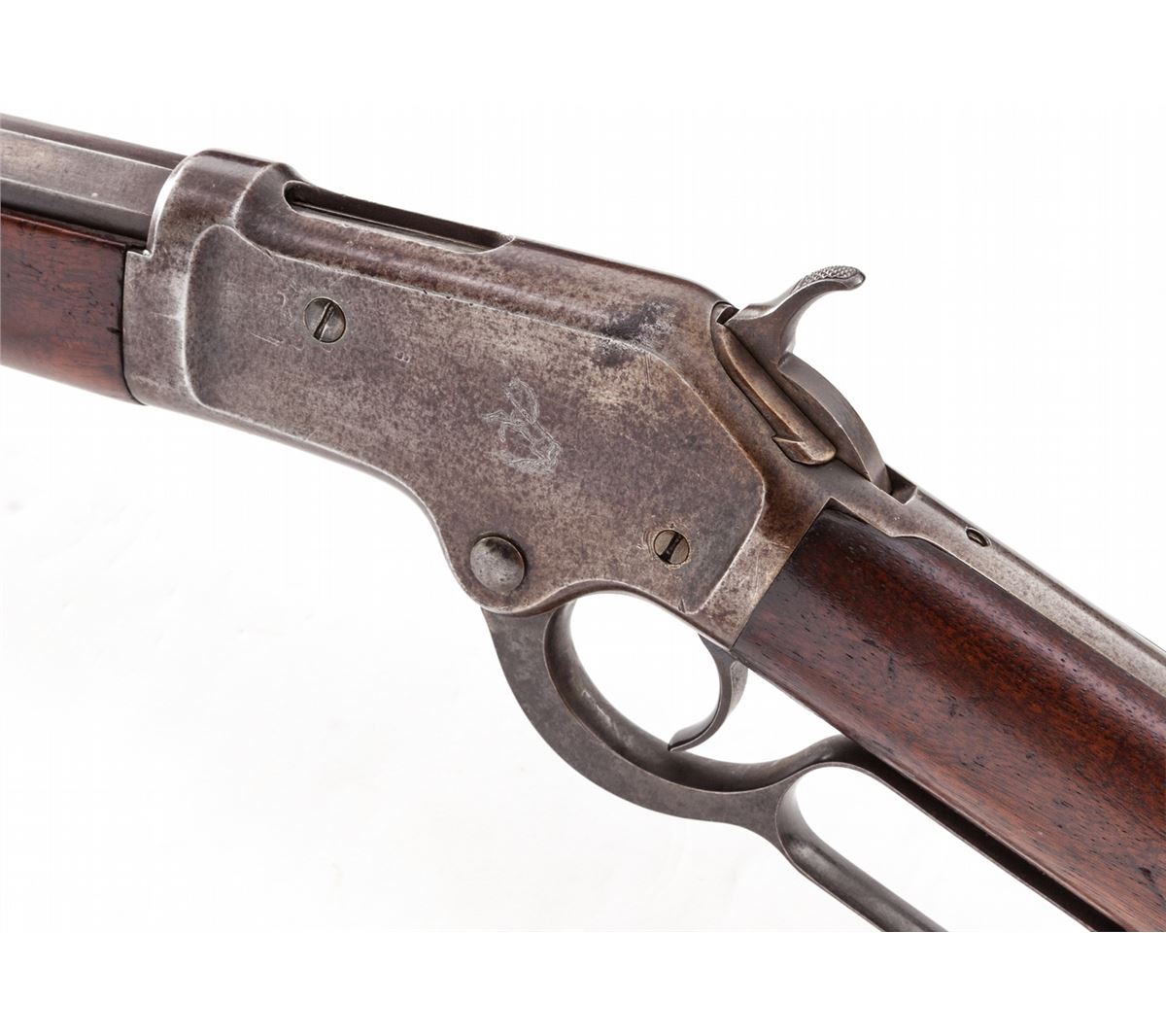 Colt Burgess Lever Action Rifle, #4207, .44-40 cal., 26'' octagonal barrel, blue finish, walnut stock. Mfg'd 1884. Condition is very good retaining approx. 75%-80% thinning and toning blue to barrel and mag tube. Receiver with approx. 40%-45% thinning finish. Walnut stock and forend show moderate scuffs and scratches; forend with several fissures to right side. Action is crisp, bore is very good to fine. Est.: $3,500-$5,000. (Antique)