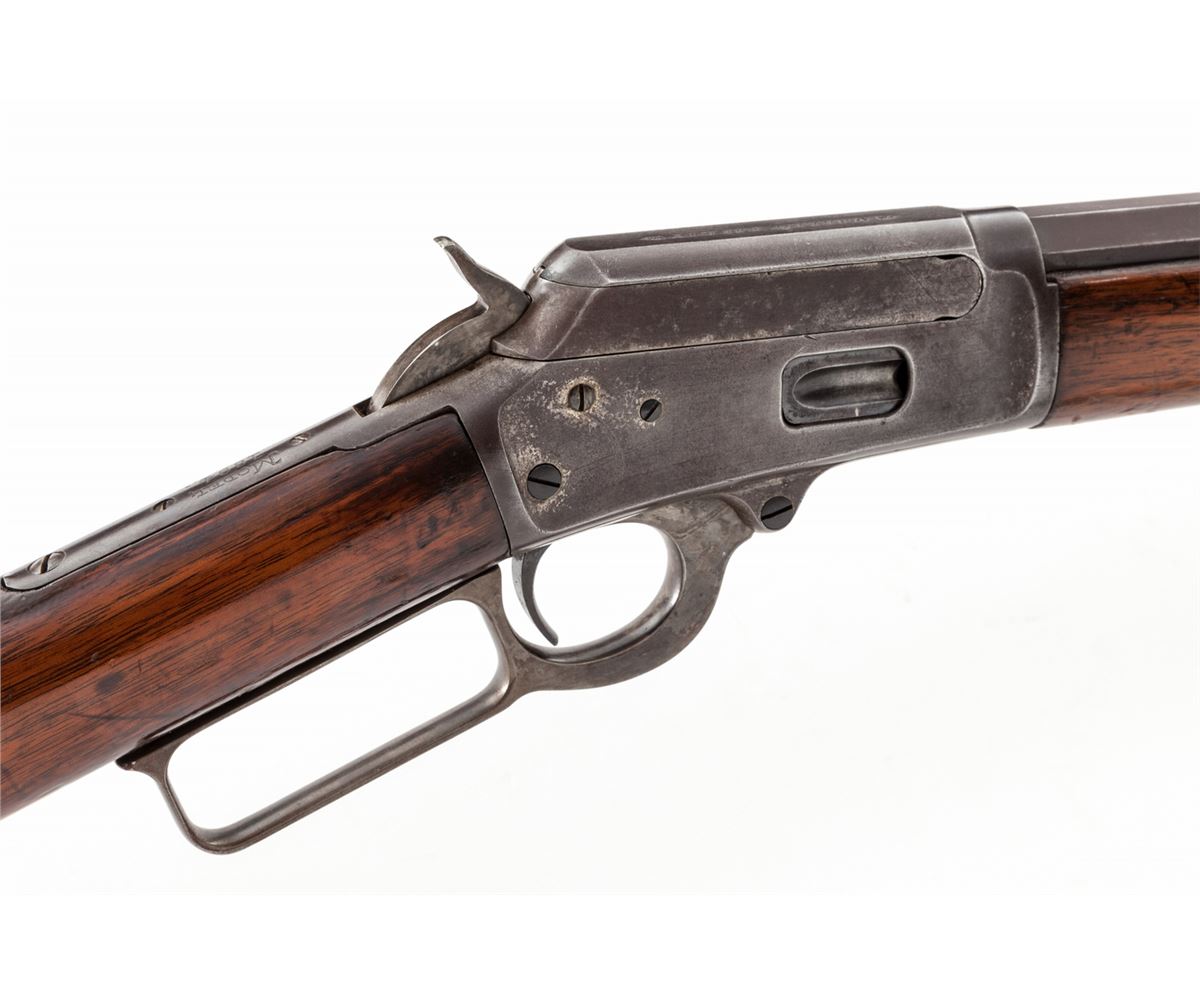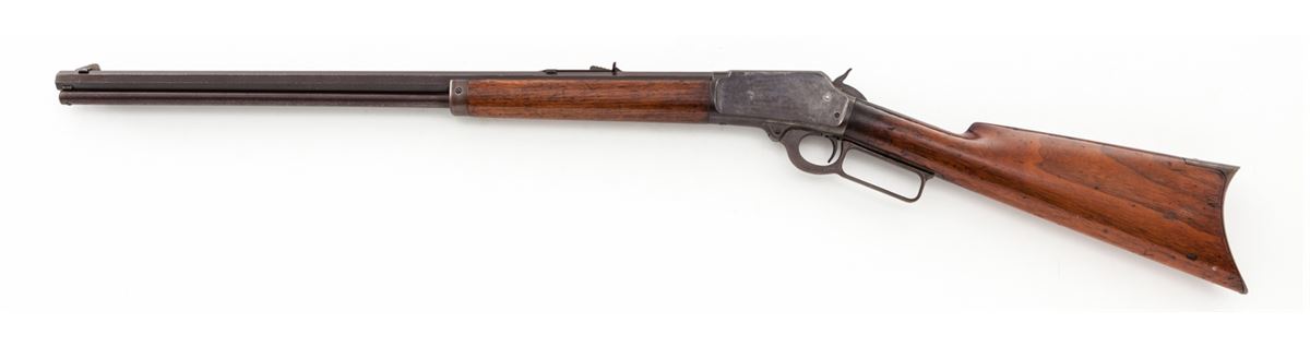 Antique Marlin Model 1894 Lever Action Rifle, #126779, .25-20 cal., 24'' octagonal barrel, blue and case hardened, with smooth walnut stock and forend. Condition is very good. Barrel and mag tube with 80% thinning and moderately darkening blue. Case hardened frame has turned a silvery brown with several replacement screws. Stock with oil darkening, scuffs and scratches, and light chips around upper tang. Good action and bore. Est.: $750-$1,000. (Antique)
