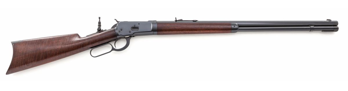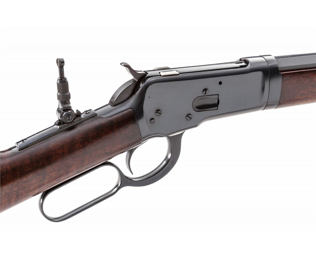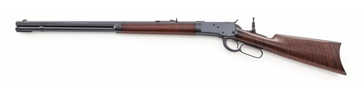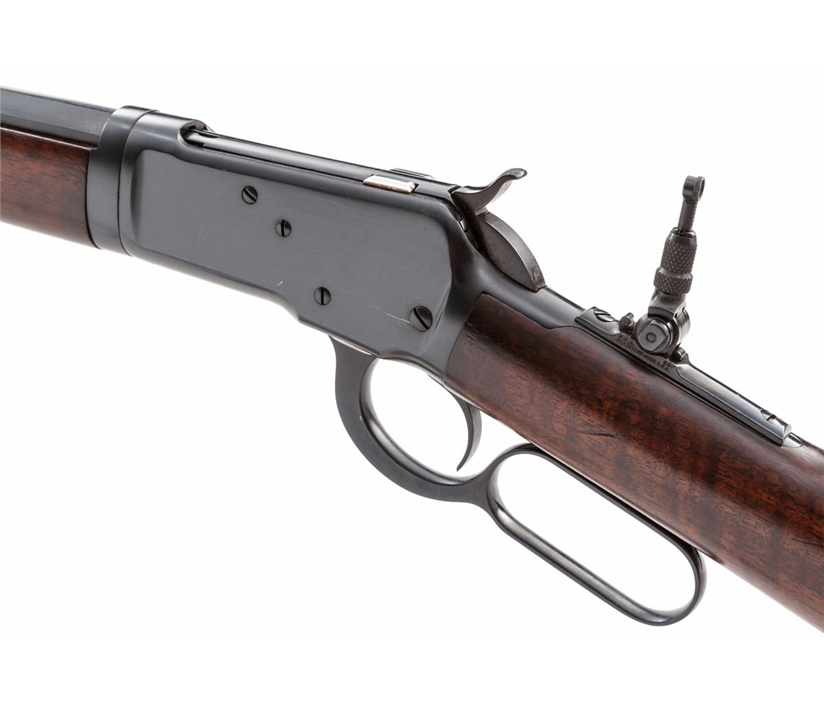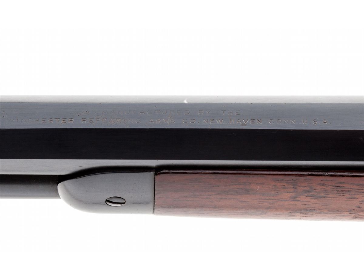 Winchester Takedown Model 92 Lever Action Rifle, #1X3651, .38-40 cal., 24'' octagonal barrel, blue finish, walnut stock and forend, with Marbles tang sight. Mfg'd 1897. Condition is excellent as immersion refinished, but with very strong edges and only minor thinning to Winchester address and caliber designation. Minor scratches to flat sides of frame. Good wood with light impressions and oil darkening near metal surfaces. Action remains crisp, bore is excellent. Est.: $800-$1,200. (Antique)