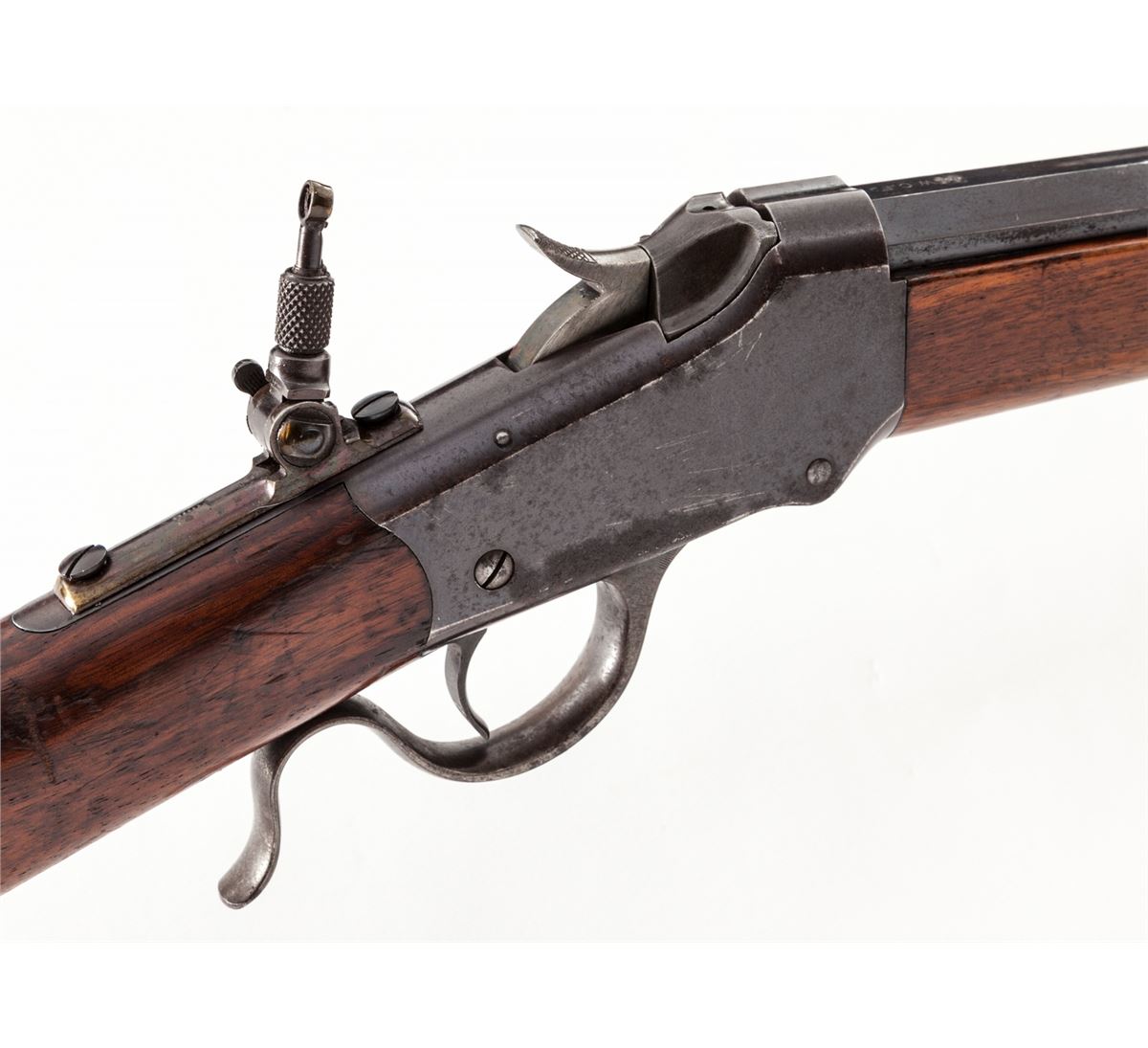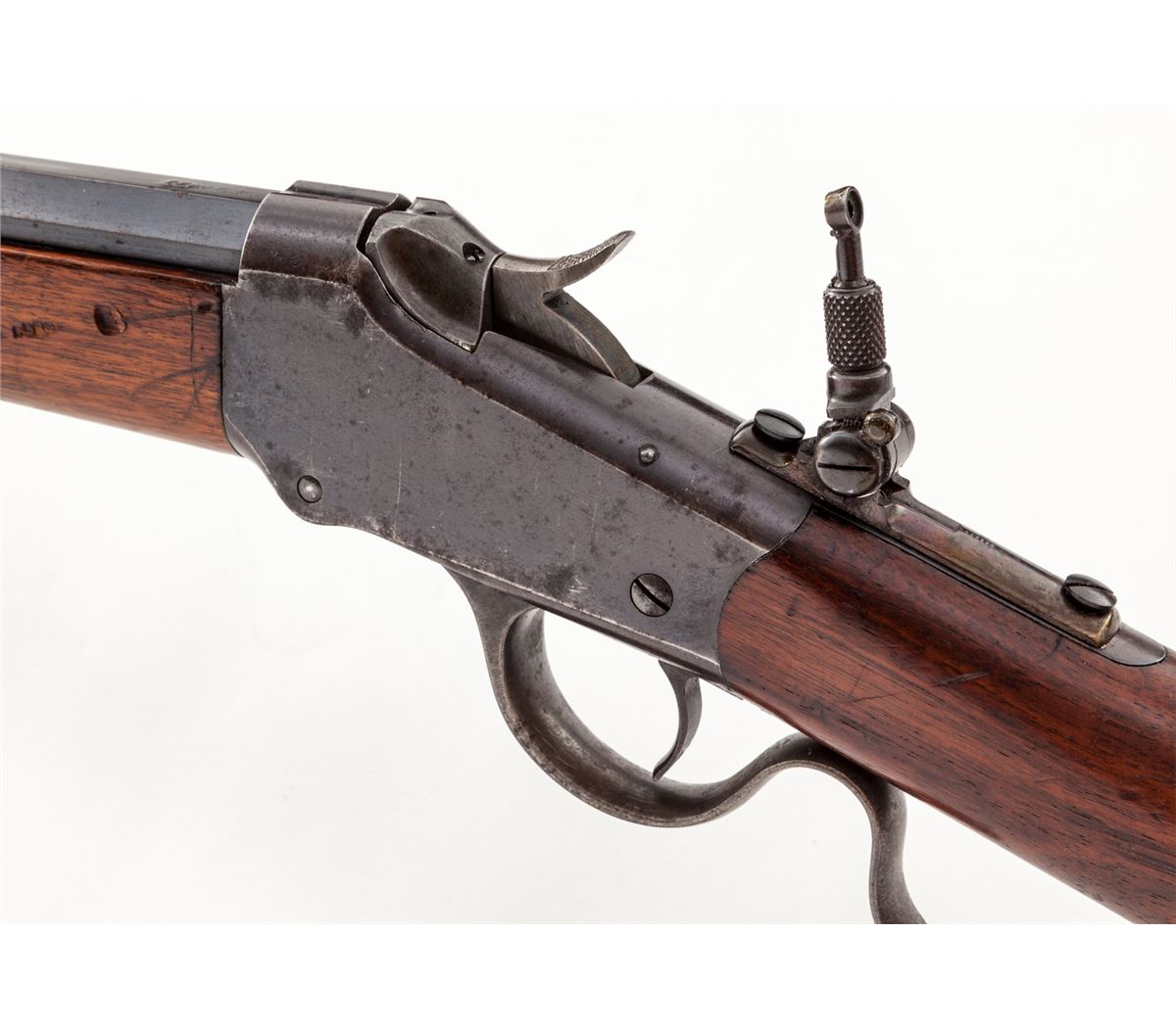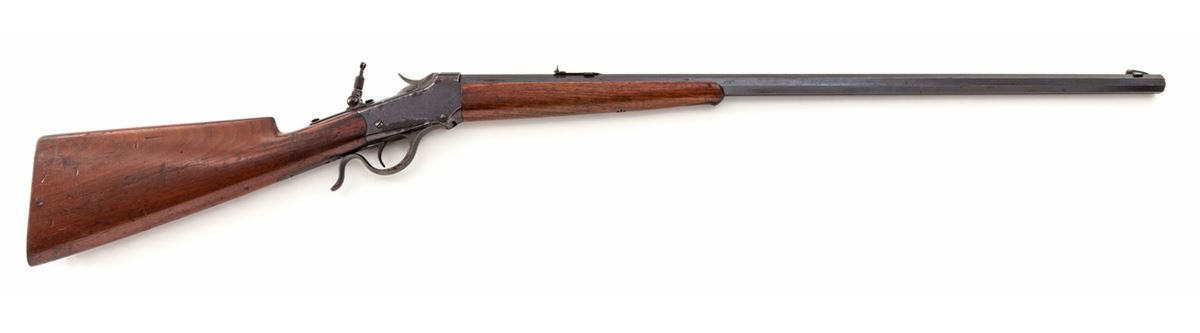 Winchester Low-Wall Single Shot Rifle, #90972, converted to .44-40 cal., 28'' octagonal barrel of No. 1 weight, blue finish, walnut stock with shotgun butt, with Rocky Mountain front and Lyman tang sight, and three-leaf Express rear sight. Mfg'd 1902. Condition is very good retaining approx. 80%-85% factory blue. Stock with moderate scuffs and scratches. Action is good, bore is bright. Caliber marking ''44'' appears to be an overstamp over original markings. Est.: $500-$750. (C&R)