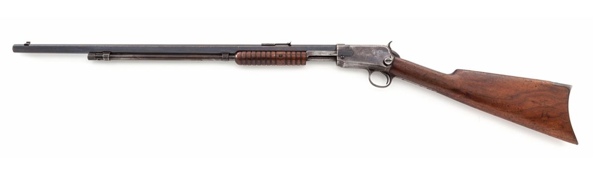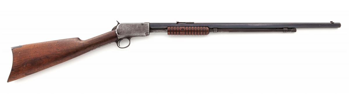 Winchester Model 90 Slide-Action Rifle, #654505, .22 Short cal., 24'' octagonal barrel, blue finish, walnut stock, with 12-groove handguard. Mfg'd 1922. Condition is very good retaining approx. 92% lightly toning blue to barrel. Mag tube retains about 40% thinning blue. Frame with approx. 40% thinning and flaking blue to left side; right side with approx. 10%-15%. Stock remains unsanded with moderate scuffs and oil darkening near frame and crescent steel buttplate. Action is crisp, bore is fair with moderate general frosting. Est.: $1,000-$1,500. (C&R)