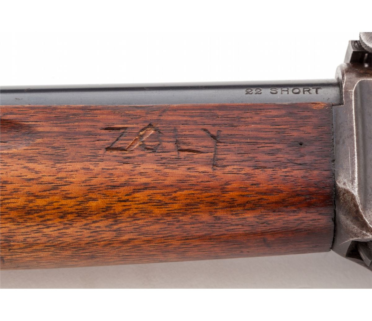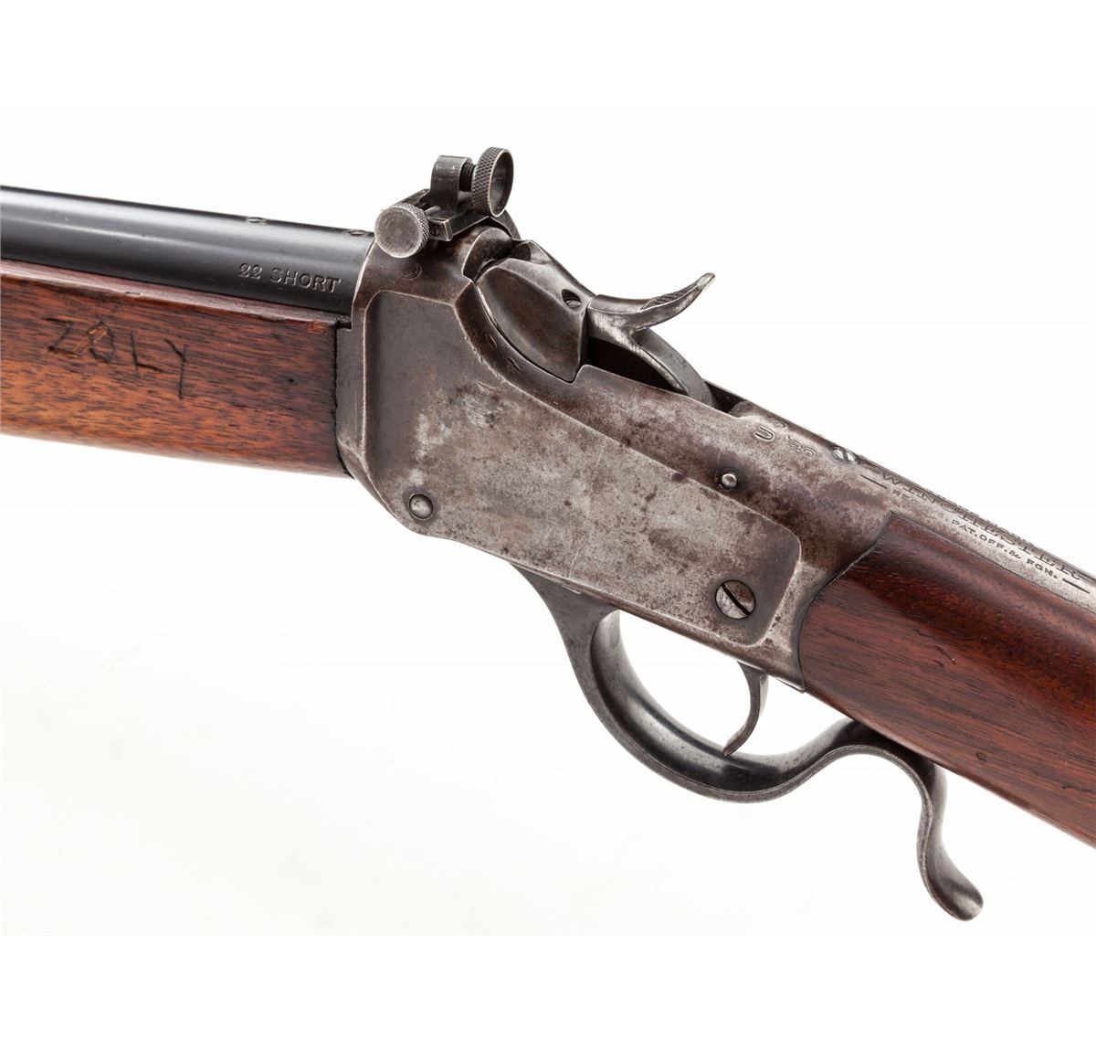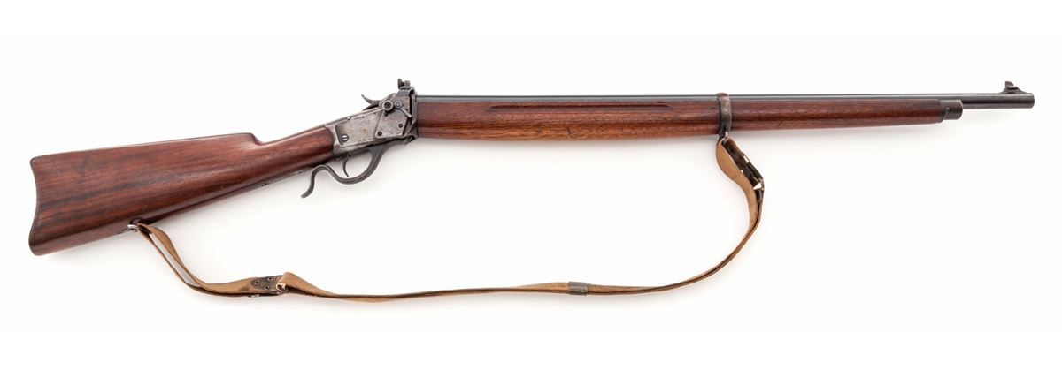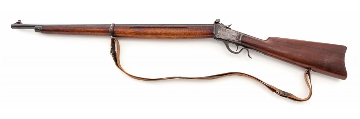 Winchester Winder 3rd type Musket, #123467, .22 Short cal., 28'' round barrel, blue finish, walnut stock, with fingergroove full-length forend and one barrel band, period 3/4'' Kerr sling, with standard front and Lyman No. 53 rear sight. Mfg'd after 1919. Condition is near fine. Barrel retains approx, 92% lightly thinning blue with scuffs and minor scratches near scope block mount holes. Frame has thinned to approx. 40% blue. Stock with light scuffs and scratches. Handguard at left side of frame marked with past owner's name ''Zoly''. Action is good, bore is bright. Est.: $750-$1,000. (C&R)