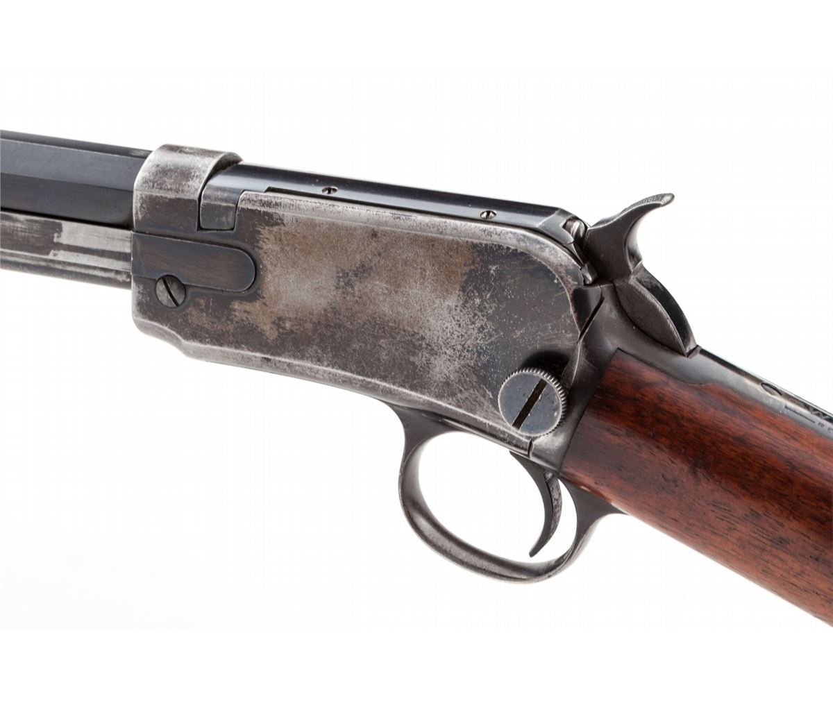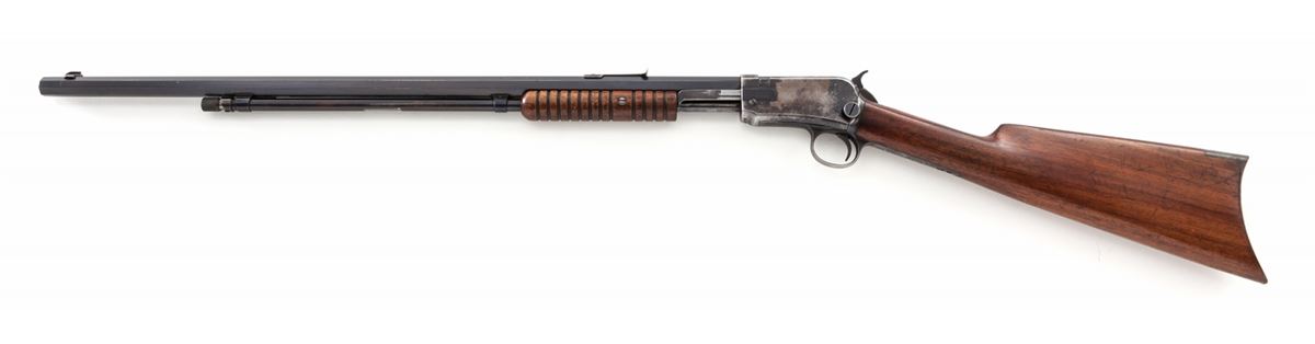 Winchester Model 90 Slide-Action Rifle, #686475, .22 WRF cal., 24'' octagonal barrel, blue finish, walnut stock, with 12-groove handguard, Marble Sheard brass front sight, and standard rifle rear sight (no elevator). Mfg'd 1925. Condition is very good retaining approx. 95% lightly toning blue to barrel. Mag tube retains about 80%-85% thinning blue. Frame with approx. 40%-50% thinning and flaking blue to left side; right side with approx. 30%. Stock remains unsanded with light scuffs and minor oil darkening near frame and crescent steel buttplate. Action is crisp, bore is mirror bright. Est.: $1,500-$2,000. (C&R)