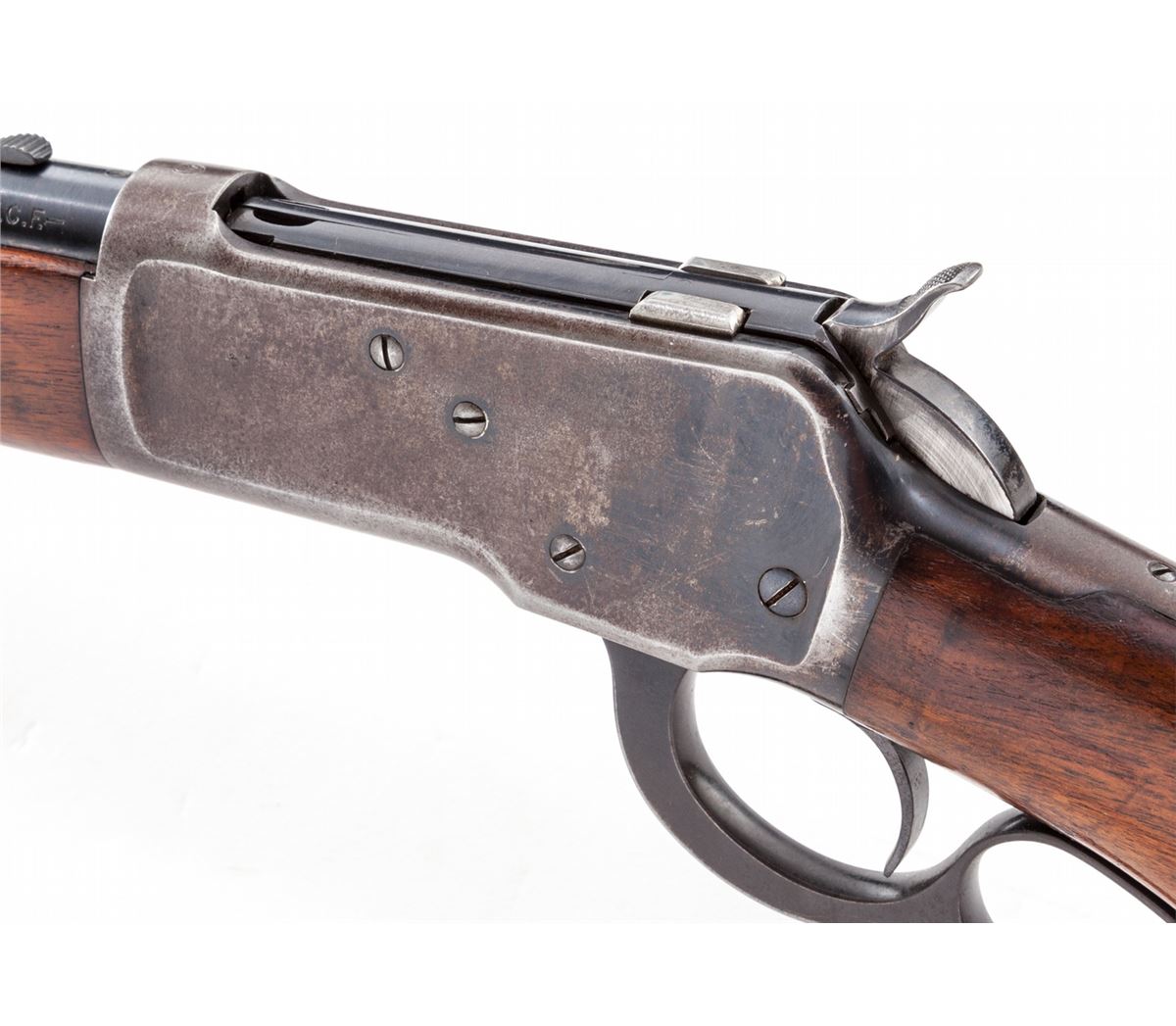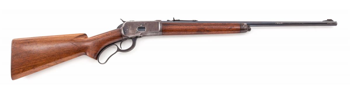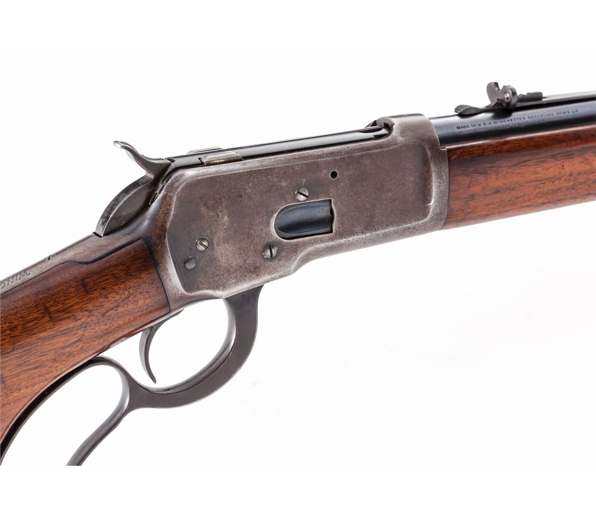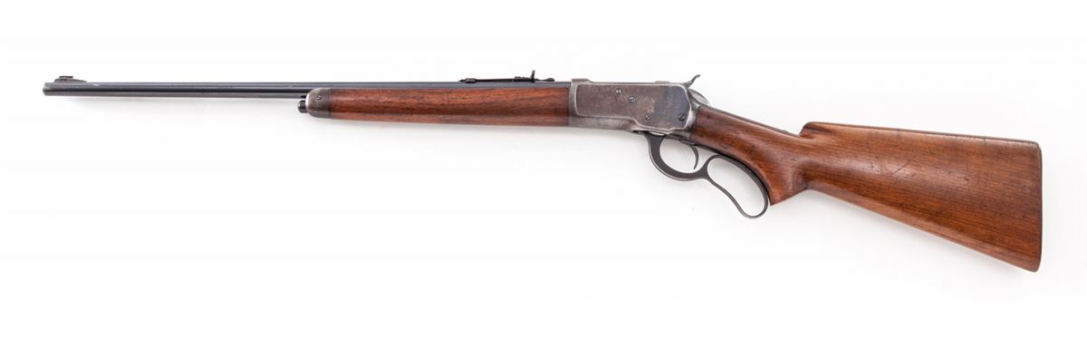 Winchester Model 65 Lever Action Rifle, #999644, .32 WCF cal., 22'' barrel, blue finish, smooth pistol-grip walnut stock and forend, button magazine, with checkered steel buttplate and original sights. Mfg'd 1930. Condition is near fine with 95% blue remaining to barrel; 25% to frame and lever. Stock with minor scuffs and scratches. Additional varnish added at some point. Good action, mirror bright bore. Est.: $750-$1,000. (C&R)