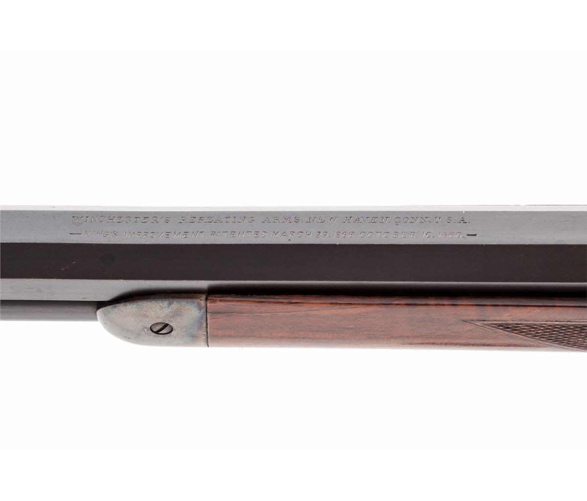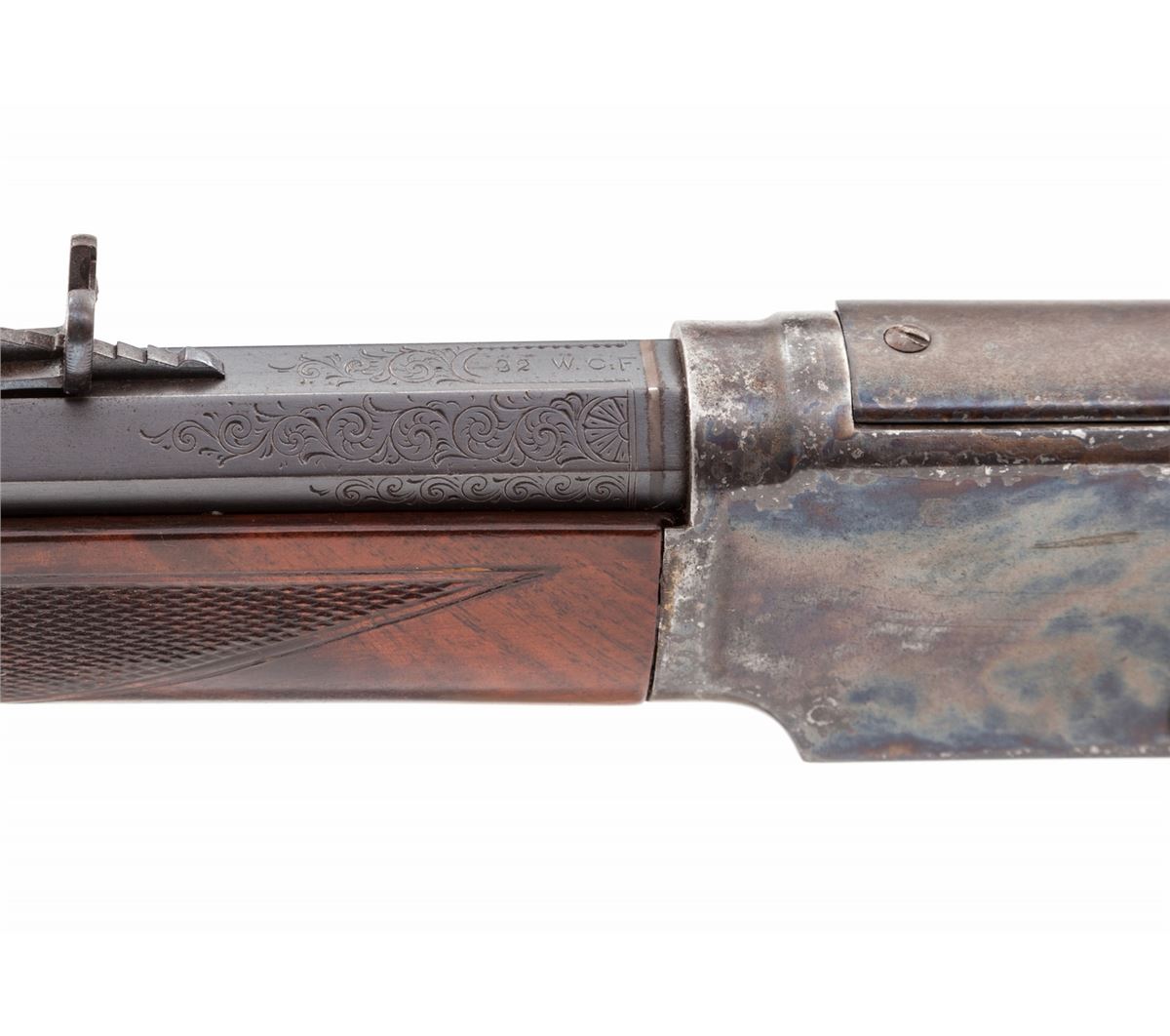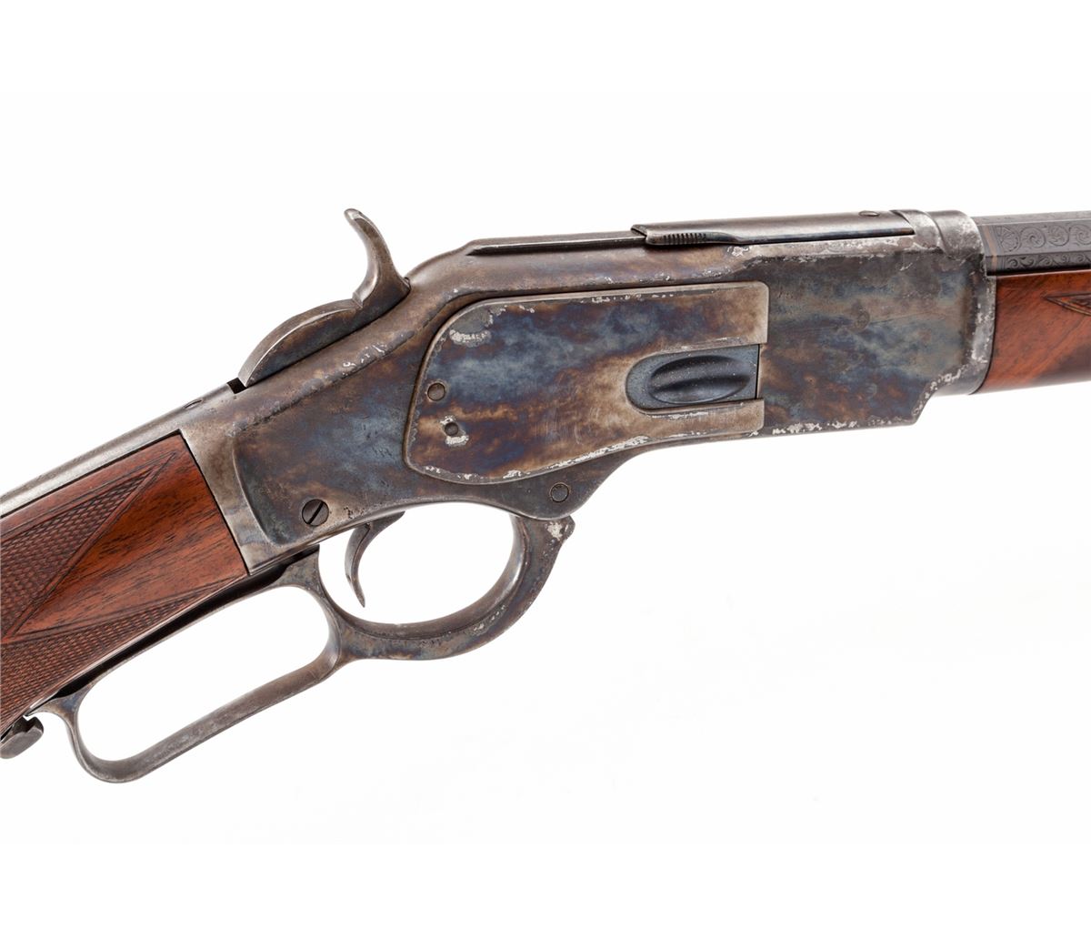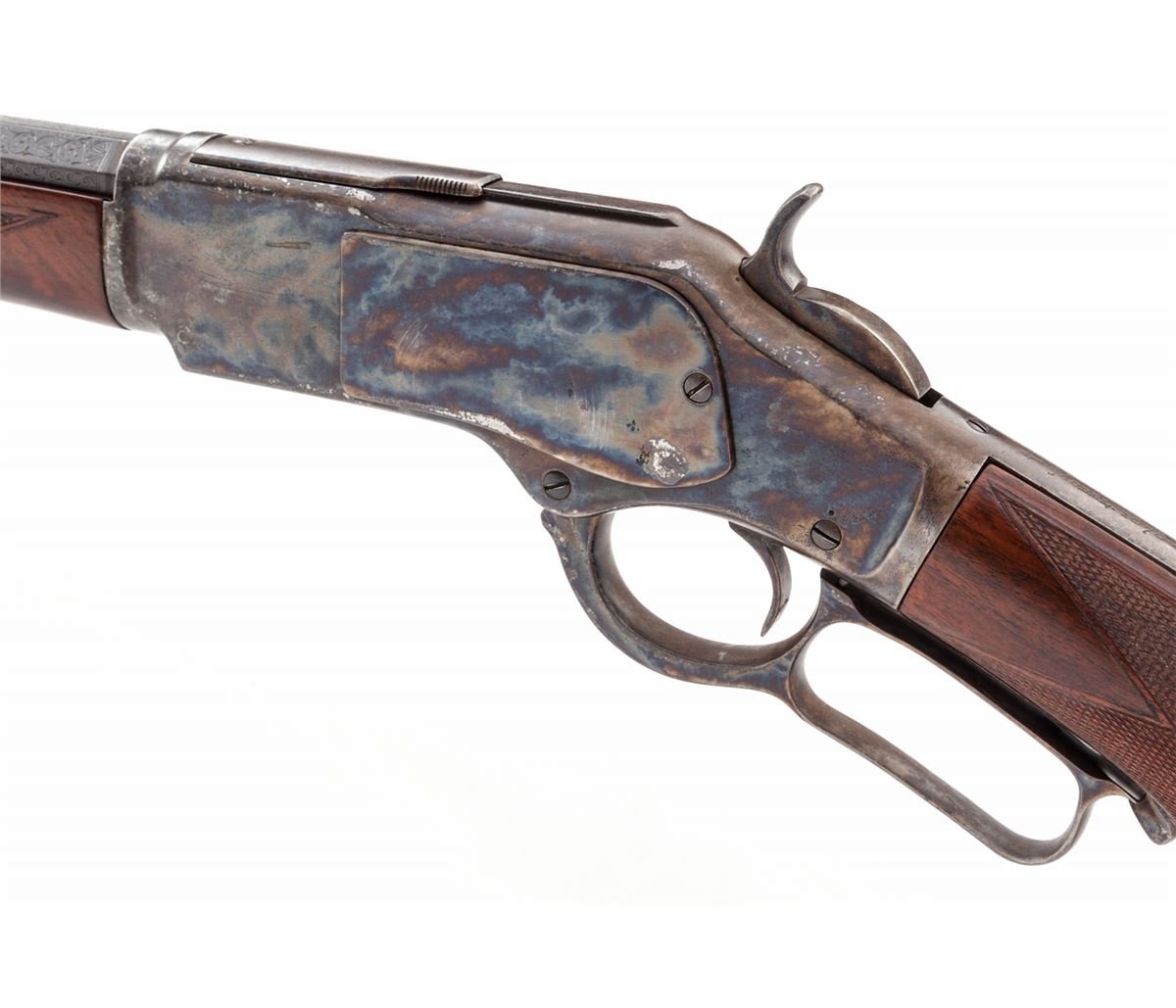 Deluxe Winchester Model 1873 Lever Action Rifle, NVSN, .32-20 cal., 24'' lightly engraved and banded blue barrel, case hardened frame, pistol-grip checkered walnut stock and forend. Condition is very good to fine as semi-professionally restored. Sides of both upper and lower tang show no additional markings when buttstock is removed. Barrel with immersion type bluing, some enhancements to address and patent dates. Front sight is a later replacement. Case hardened frame was done using the cyanide method, and high edges show wear-thru to bright metal. Serial number has been removed during polishing, therefore, we can make no claims as to the originality of any of its features. Buttstock and forend are nicely figured, and pistol grip cap features horn inlaid fleur d'lis detail. Action remains very good, bore is about fine. Est.: $1,200-$1,800. (Antique)