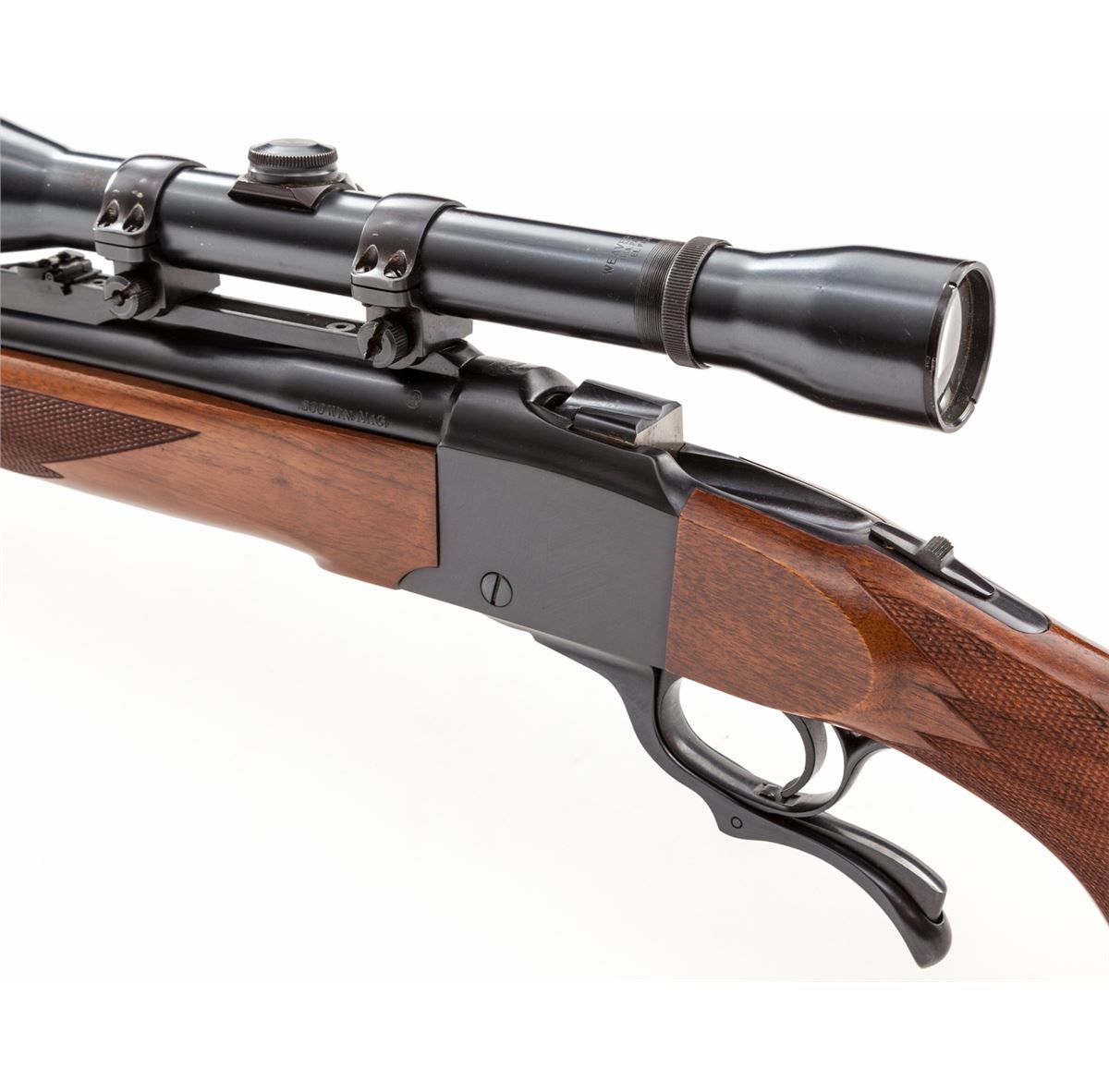 Ruger No. 1 Single Shot Rifle, #132-27012, .300 Win. mag. cal., 26'' barrel, blue finish, factory checkered walnut stock and forend, with Weaver K4 scope on Ruger rings. Original Express sights are retained. Condition is excellent showing light marks from handling and some scratches to upper portion of scope rings near screw holes. Stock is excellent. Action is crisp, bore is bright, scope optics are clear. Est.: $600-$800. (Modern)