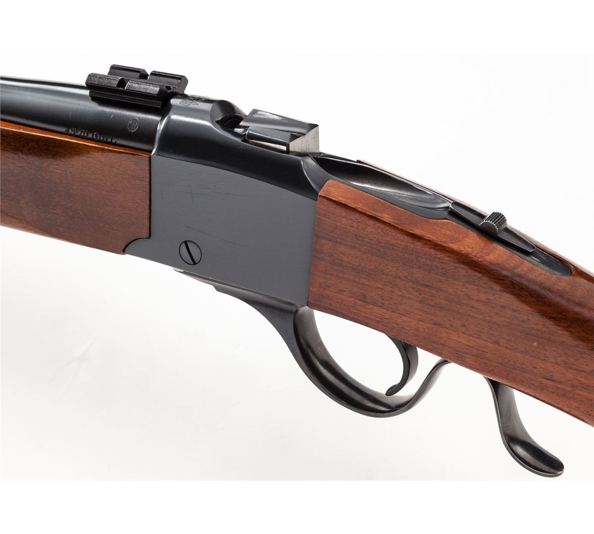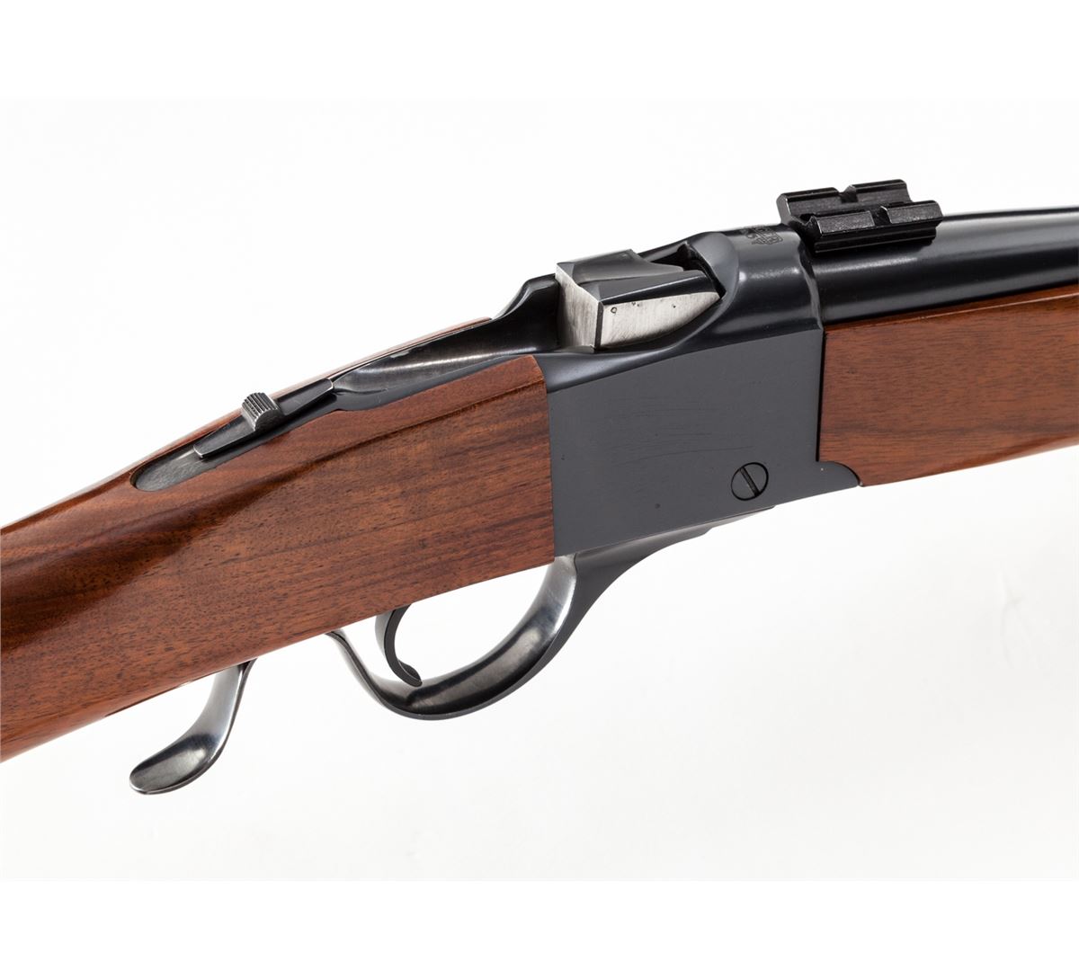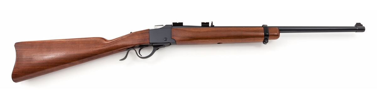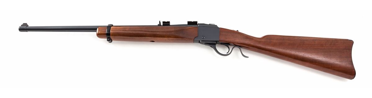 Ruger No. 3 Single Shot Rifle, #130-59639, .45-70 cal., 22'' barrel, blue finish, walnut stock, with iron sights and Weaver scope bases. Condition is near excellent showing just light marks from handling. Crisp action, bright bore. Est.: $450-$650. (Modern)