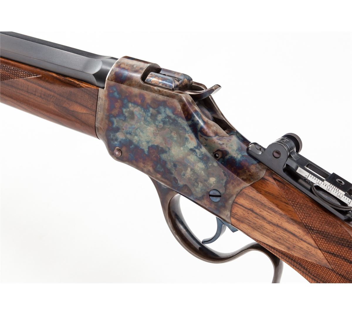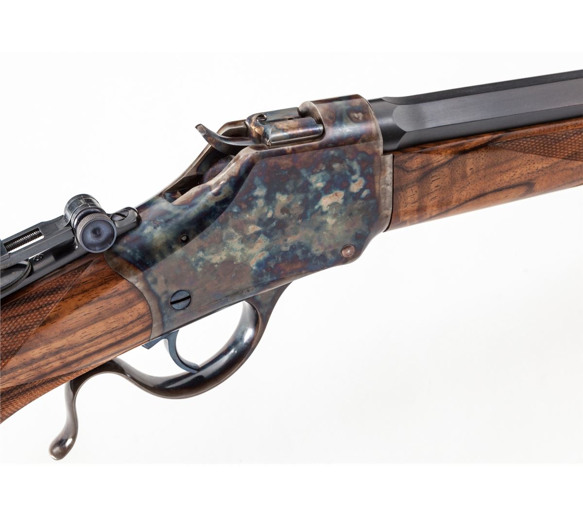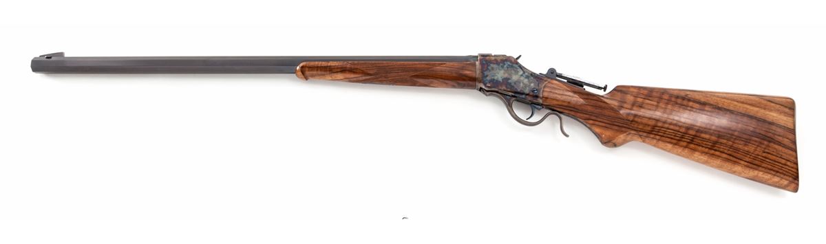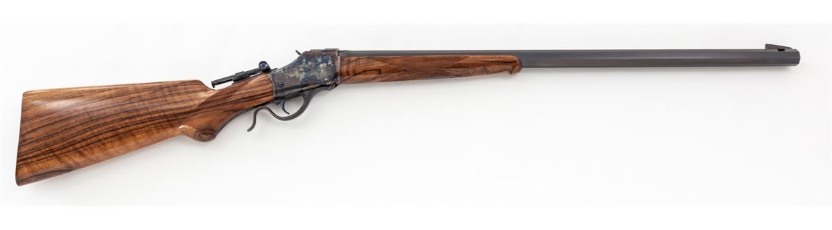 Custom High-Wall Single Shot Rifle, #1041, .45-70 cal., 25-1/2'' blue octagon barrel, case hardened frame and lever, mid-range vernier tang sight, high blade front sight, select finely checkered Mediterranean walnut stock and forend, with niter-blue screws and trigger; blue steel buttplate with long widow's peak upper tang. Condition is excellent showing only the slightest marks from handling. Est.: $2,000-$3,000. (Modern)