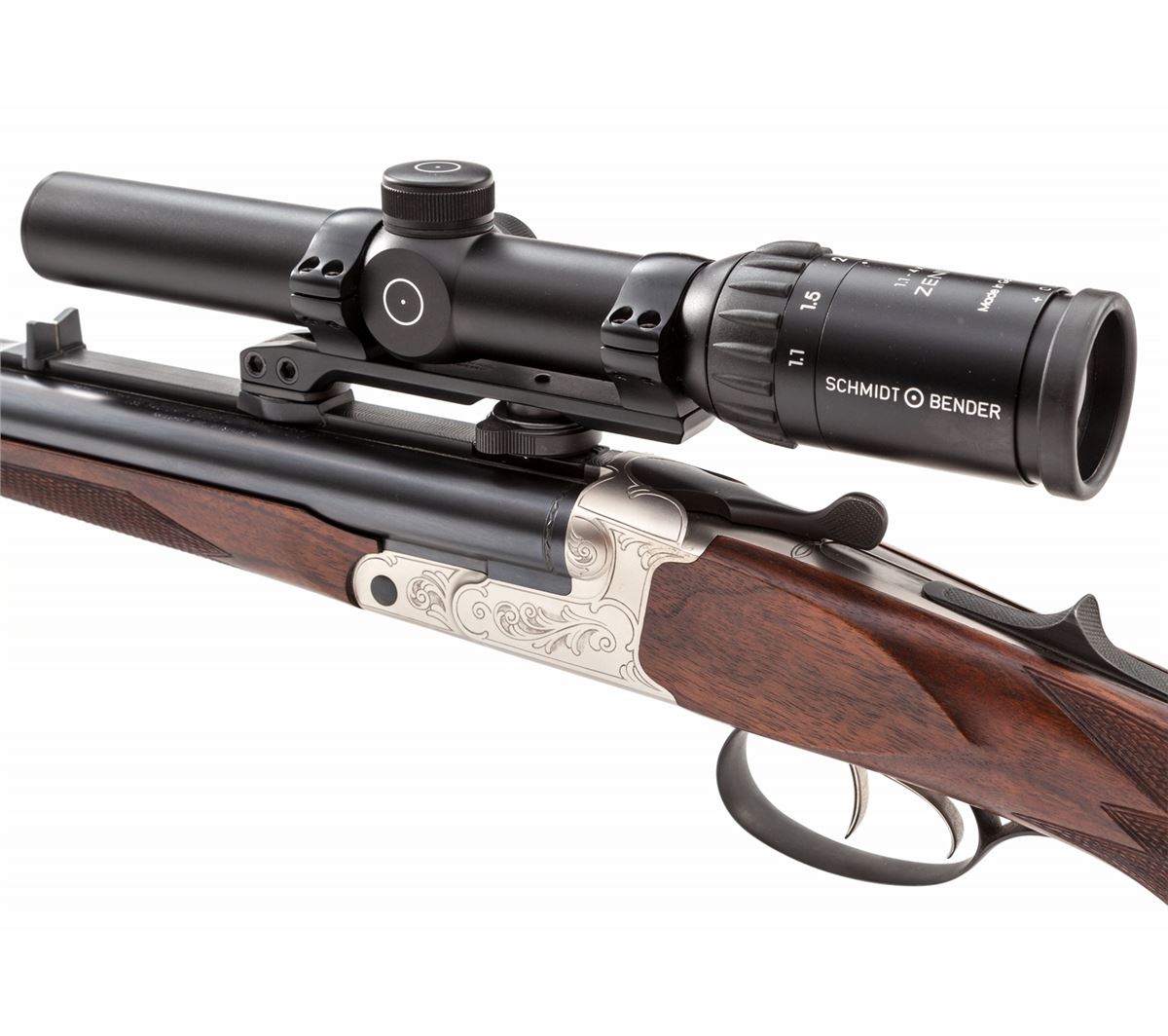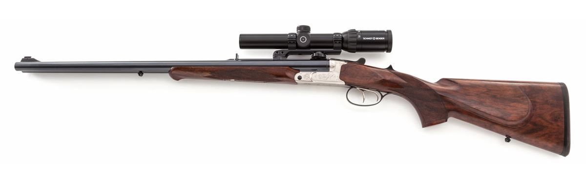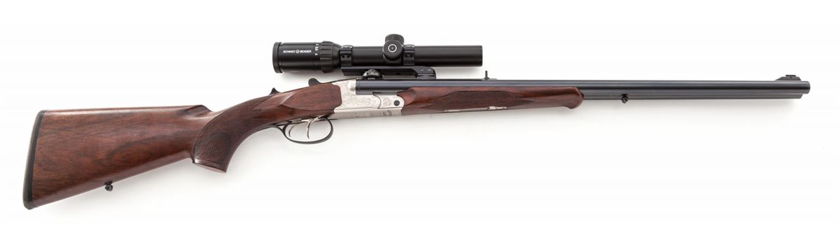 Kreighoff Big Five Classic Double Rifle, #98164, .470 Nitro Express cal., 23-5/8'' barrels, ''Classic'' engraved bright frame, checkered pistol-grip shadowline cheekpiece European walnut stock and forend. Topped with a Schmidt & Bender 1.1-4x24 Zenith scope and rings, on quick-detachable mounts. Condition is excellent with only the lightest marks from handling, and one small compression ding to edge of pistol grip. Scope is complete with leather carrying case and original box. (Scope alone retails for over $1,800, with an additional $300 for rings and mounts.) Est.: $8,000-$12,000. (Modern)