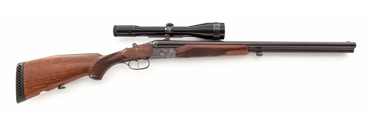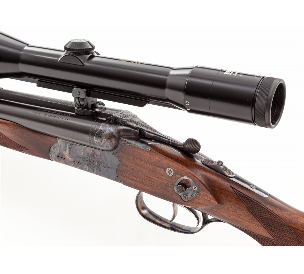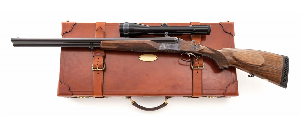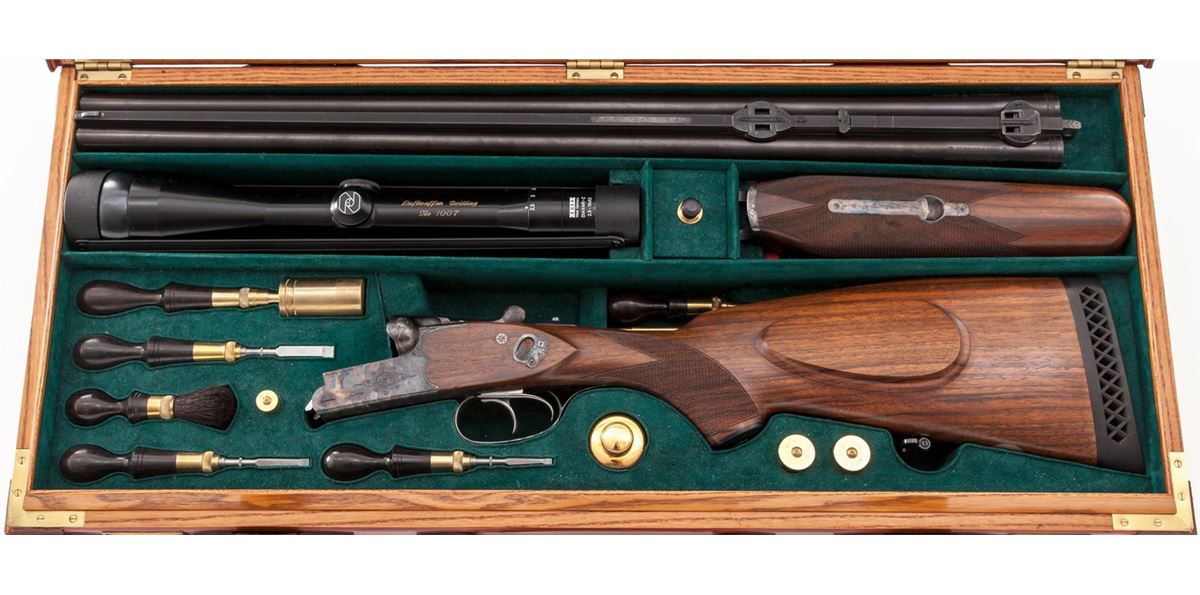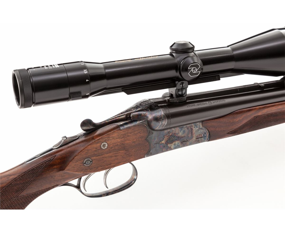 Elaborate Limited Edition Reproduction of a WWII Luftwaffe Issue M.30 Survival Drilling by J. P. Sauer & Sohn, #L1007, 12 ga.x12 ga. 2-3/4'' x 9.3x74R, 25'' bright blue finish barrels with 5/16'' matted solid rib, automatic 100 yd. square notch folding rear sight and wide blade front sight; European claw mount bases, full and half chokes, single crossbolt, double triggers with set front trigger, extractors and Greener style side safety. All chambers have eagle/N and Kiel proofmarks; the rib has a recessed panel with ''Luftwaffen Drilling M 30'' lightly etched in script. This circa 1980 limited edition version of the M.30 is based on a standard J. P. Sauer & Sohn scalloped-frame Model 3000 with a case-colored finish and light scroll engraving, side clips and locking top-tang barrel selector with cocking indicator pins. European comb pistol-grip stock and wide forend are dense straight-grained walnut with small shadow line cheekpiece and silver oval on toe line; checkering is 20 LPI and the finish is light oil, sling swivel loops are 3/4''. Length of pull is 14-7/8'' over a 1'' ventilated black recoil pad; weight is 8 lbs. The matching Zeiss scope is a DIAVARI-Z 2.5-10x52 T* in a gloss black finish with rail claw mounts; top of scope is etched in gold-filled script ''Luftwaffen Drilling No 1007''; scope is also individually serial numbered 1640994. The gun and accessories are highlighted in a matching luggage-style Huey gun case, numbered 1007, with a green faux suede French fit interior; accessories include an H. Krieghoff .22 WMR chamber insert, serial numbered 31107, ebony handle turnscrews and cleaning rods with brushes, gold plated snap-caps, a gold-plated Dixon oil bottle and unused single loop sling. Among the numbered matching documents accompanying the set is a reproduction of a 1941 M.30 instruction manual in German text, two test targets, the registration certificate and a 1996 dated Huey Gun Case registration card with two keys. Condition appears just off new with only a few minor indications of handling and assembly. Est.: $8,000-$12,000. (Modern)