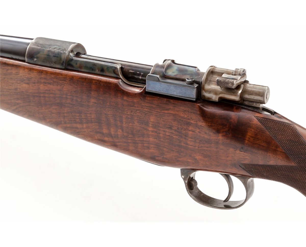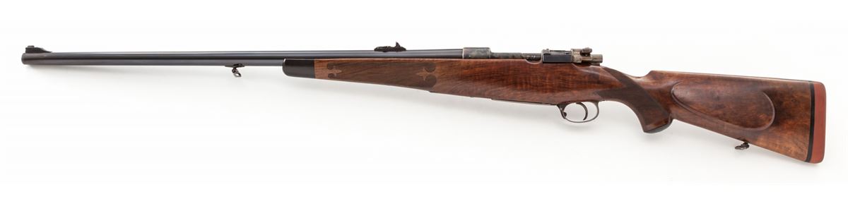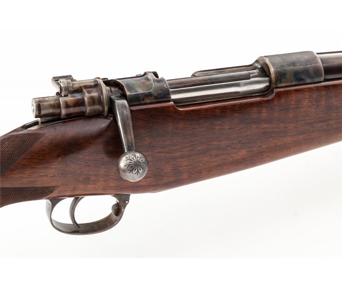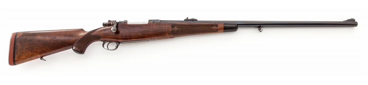 Large Frame Mauser Bolt Action Sporter, by Heinrich Krieghoff (Suhl), 11mm, 30'' heavy blue barrel made of Poldi Anticorro fine steel, case hardened receiver, bolt, triggerguard and engraved magazine floorplate with medium relief ''S'' to center in diamond-shaped lozenge; floorplate additionally adorned with fine English type banknote scrolls. Receiver ring with light scroll treatment and hand matted top area. Bolt knob decorated with standard style checkering to back portion, with daisy design to front portion. Magazine follower and internal rails, as well as extractor, are polished bright. Finely checkered cheekpiece walnut stock with red rubber butt pad. Three-leaf Express rear sight with platinum bead front and pop-up white bead. Condition is excellent and probably dating from the 1920s or '30s. Approx. 97% beautiful inky blue remains to barrel with only small losses to case colors on frame and bolt; floorplate has thinned to approx. 30%. Stock with mild flattening to checks and very small handling marks. Action is crisp, bore is bright with nice even flat crown at muzzle. Est.: $3,500-$5,000. (C&R)