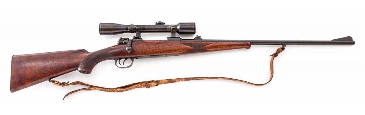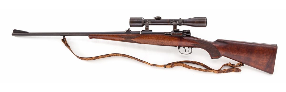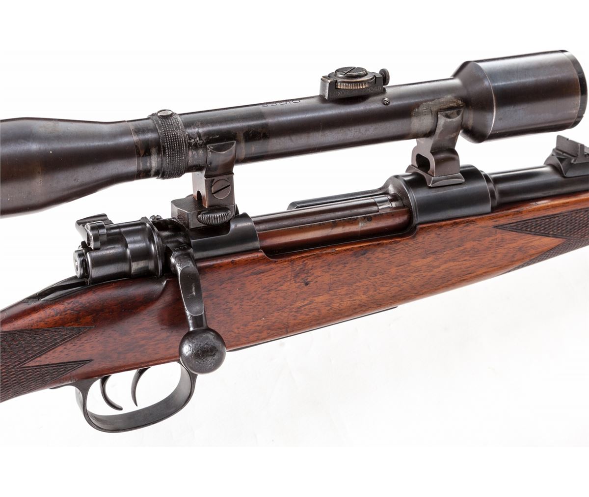 German M98 Sporter Bolt Action Rifle, #1026, 8x57mm, 24'' barrel, blue finish, checkered walnut Schnauble forend stock, double set triggers, and Oigee 4-power scope with double claw mounts. Receiver is unmarked; floorplate is numbered 1026 with ''(stick eagle)/214'' proofs. Two-leaf Express rear sight with ramp and gold bead front sight. Bolt assembly numbered #1441. Period leather sling is included. Condition is very good retaining approx. 92% blue with moderate blued-over corrosion to bolt release. Stock with mild flattening to checks, light scuffs and scratches, and some oil darkening. Action is good, working set triggers, very good bore, and clear scope optics with three-post reticule. Est.: $500-$750. (C&R)