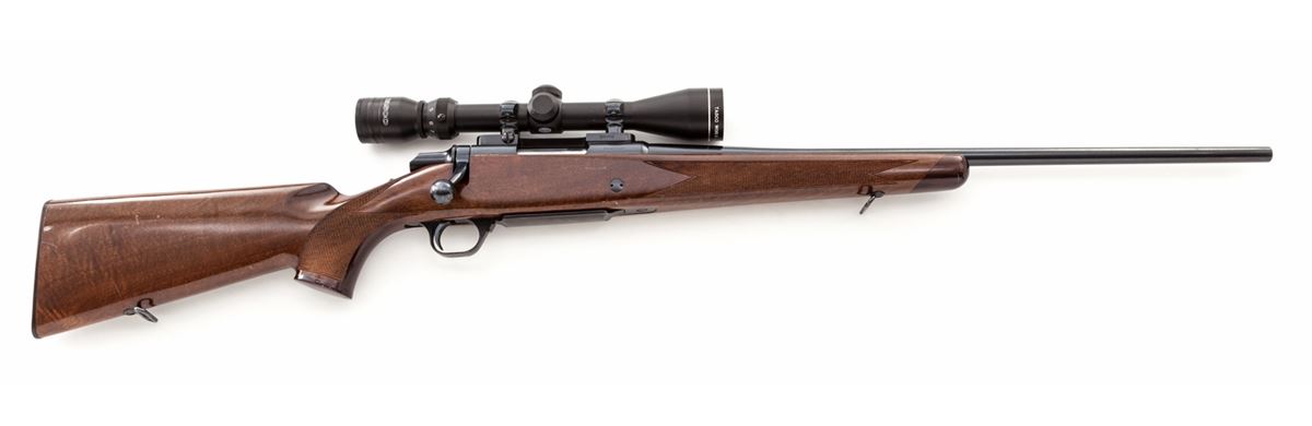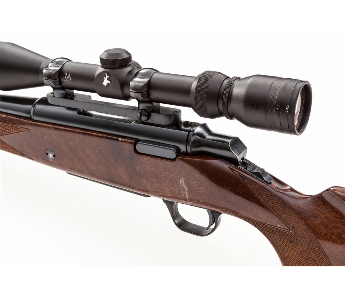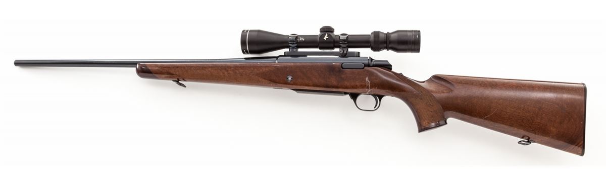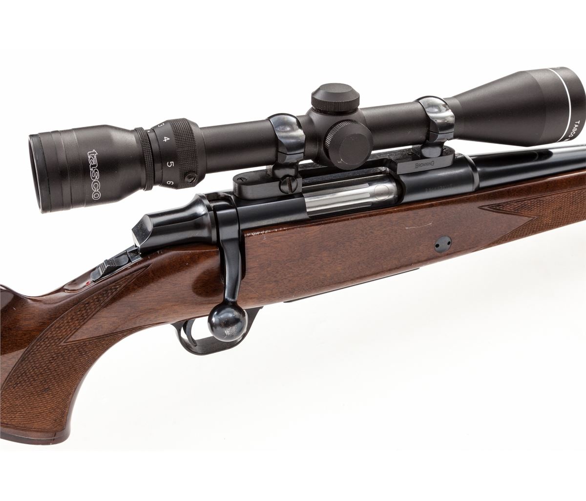 Browning BBR Bolt Action Rifle, #28453PX117, .308 cal., 22'' barrel, blue finish, checkered walnut stock. Topped with a Tasco 3-9x40 scope on Browning rings and mounts. Condition is fine. Metal surfaces retain approx. 96% blue. Stock with scuffs, minor scratches and impressions from field use. Good action and bore. Scope body with some external scuffs; clear optics. Est.: $500-$750. (Modern)
