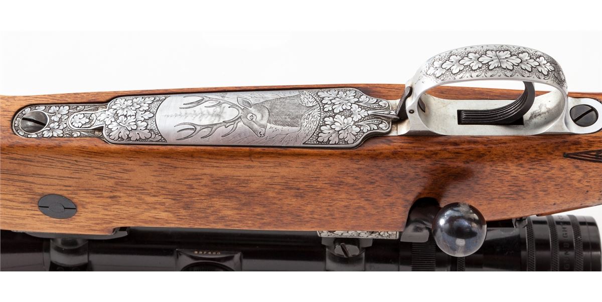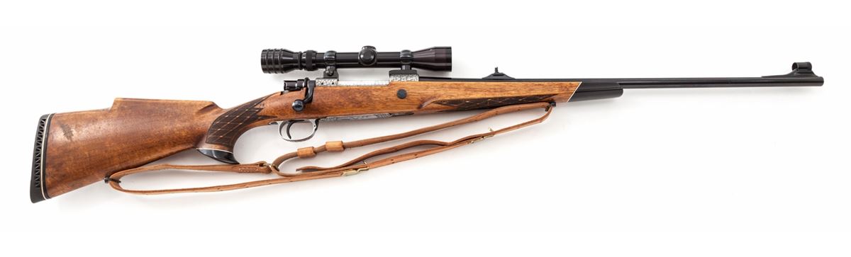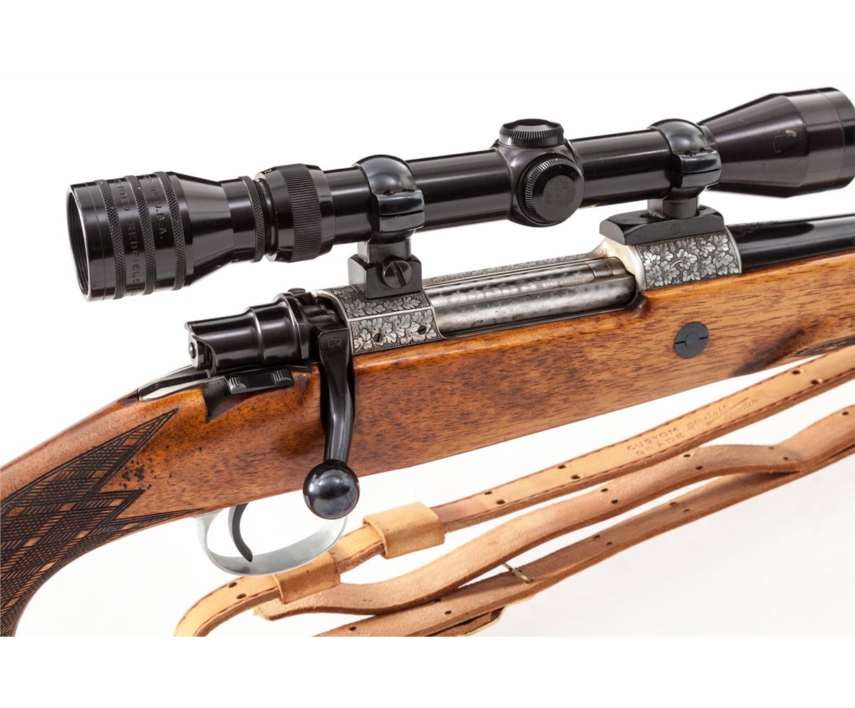 Henri Dumoulin Standard Caliber Grand Luxe Bolt Action Rifle, #5814, .30-06 cal., 24'' blue barrel by B. Blindee, oakleaf engraved French gray receiver with machine-turned bolt with blue bolt head and handle; turned follower and polished rails; skip checkered French walnut stock with cheekpiece, flared rosewood pistol-grip cap and forend tip, and black Whiteline butt pad. Topped with a Redfield 2-7x Variable scope. Top of barrel marked ''H. Dumoulin, Milmort-Liege''. Folding leaf rear sight, hooded front sight, and all early features. With period commercial brown leather sling. Condition is excellent as dating from the mid-1950s, showing just light marks to barrel from handling. Stock with minor pressure dings and light scuffing. Action remains crisp, bore is bright, scope optics remain clear. Est.: $2,500-$4,000. (C&R)
