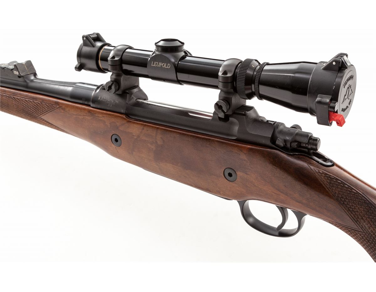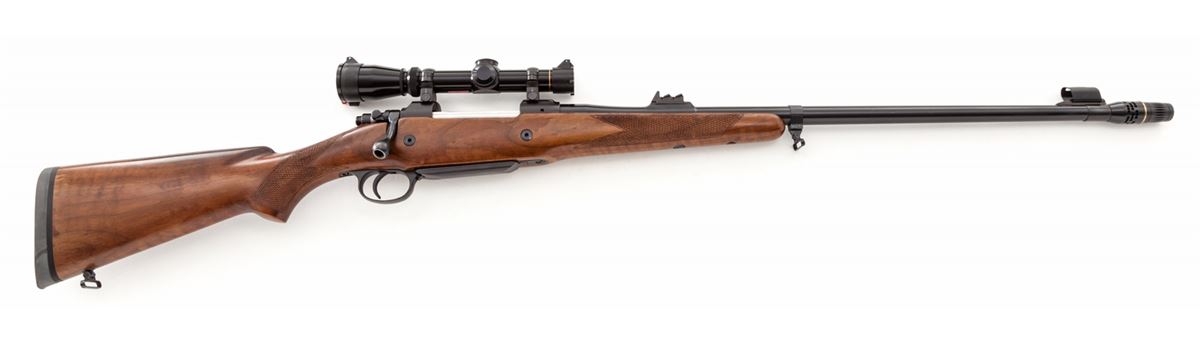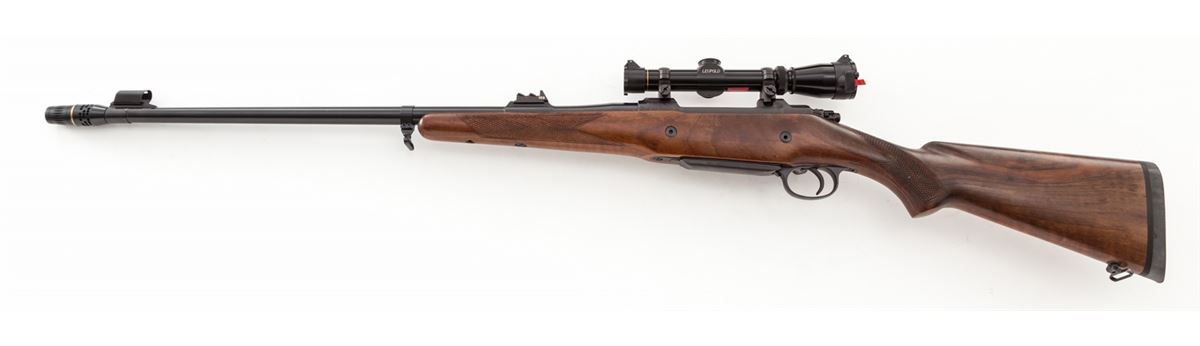 BRNO ZKK-602 Bolt Action Rifle, #18911, .458 Win. mag. cal., 25'' barrel with Kleingunther custom muzzlebrake, blue finish, coarse checkered walnut stock, with Pachmayr Decelorator butt pad. Rifle has had the front ramp machined, custom muzzlebrake added, trigger has been adjusted, action has been smoothed, and barrel band sling swivel has been added. Topped with a Leupold 1x4 Vari-X II scope. Condition is excellent, appearing near new, with only light marks from handling. Est.: $800-$1,200. (Modern)