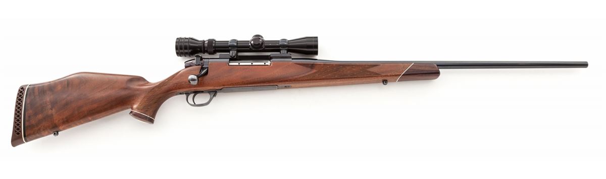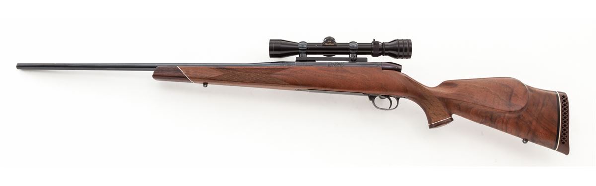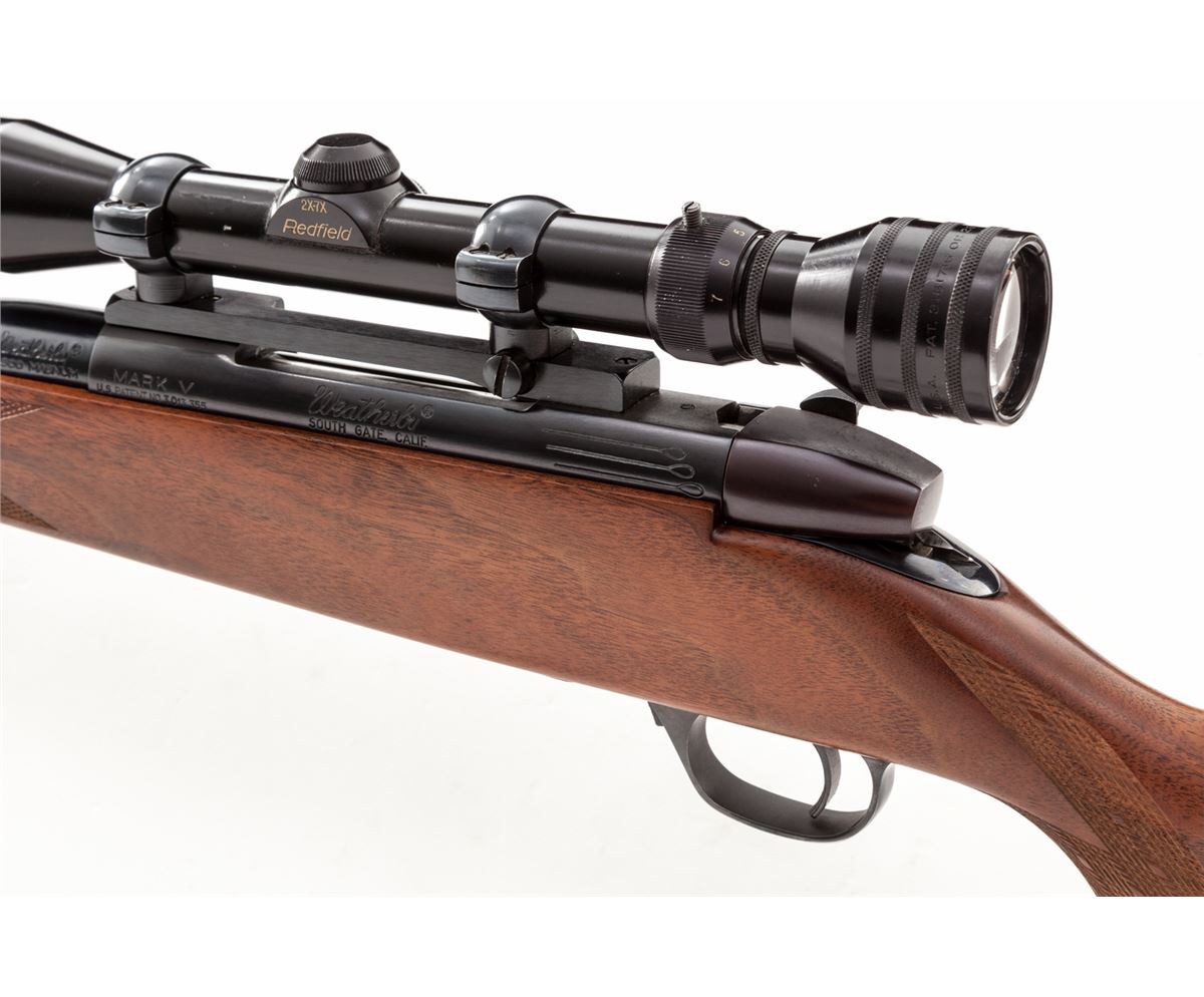 West German Weatherby MK V Bolt Action Rifle, #P39597, .300 Wea. mag. cal., 24'' barrel, royal blue finish, skipline checkered walnut cheekpiece stock, with rosewood forend and pistol-grip cap. Topped with a Redfield 2-7x36 scope. Condition is excellent showing light marks from handling. Est.: $750-$1,000. (Modern)