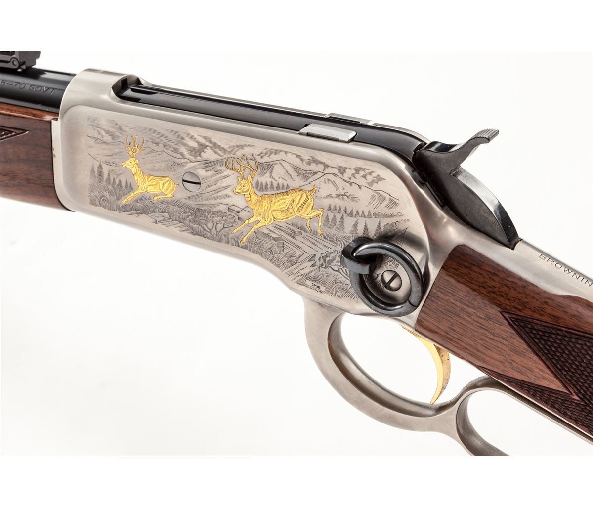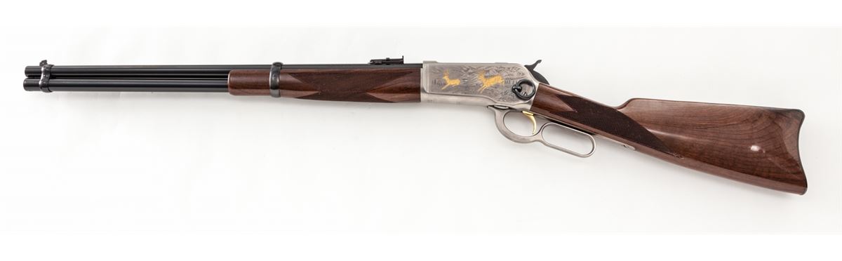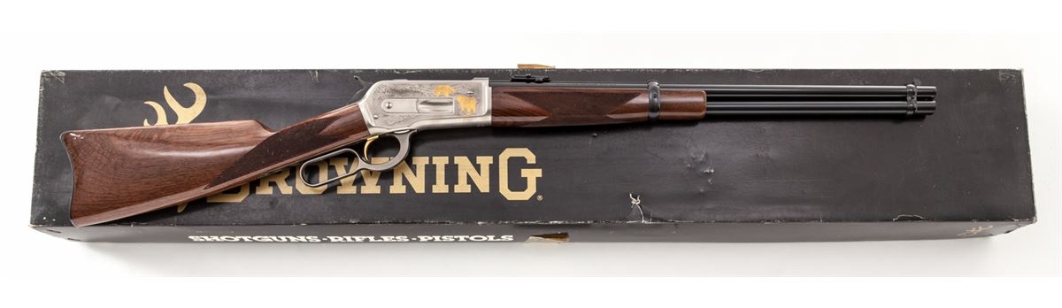 Browning Model 1886 High Grade Lever Action Carbine, #02361NY6C7, .45-70 cal., 22'' barrel, roll engraved coin-finished frame and lever, gold-plated trigger and animal scenes to receiver flat, with fancy checkered walnut stock. Condition is excellent, appearing as new, in original box. Est.: $1,000-$1,500. (Modern)