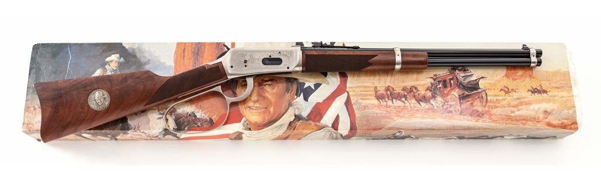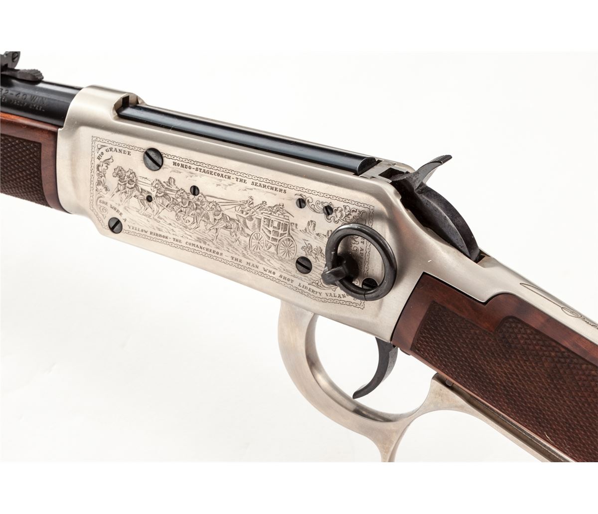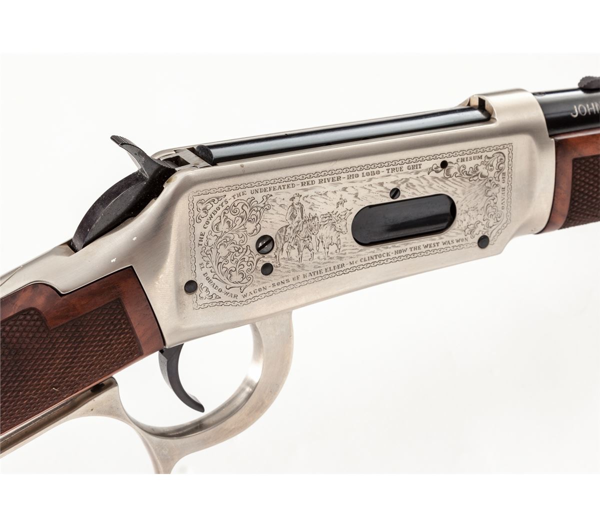 Winchester John Wayne Model 94 Lever Action Commemorative Carbine, #JW48505, .32-40 cal., 18'' blue barrel, roll engraved coin-finished frame with the name of John Wayne movies to right side and beautifully executed stagecoach scene to left side; fancy checkered walnut stock with John Wayne medallions, large lever loop, with some original paperwork, in polychrome slipcover. Carbine is in excellent condition, appearing new and unused, with light flaking of finish at apex of upper and lower tang. Exterior sleeve is crisp. Est.: $1,200-$1,800. (C&R)