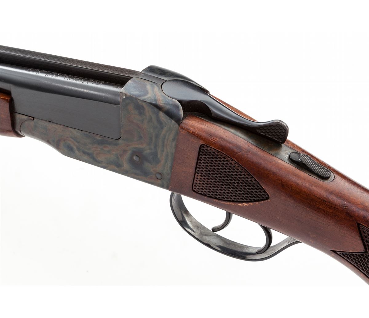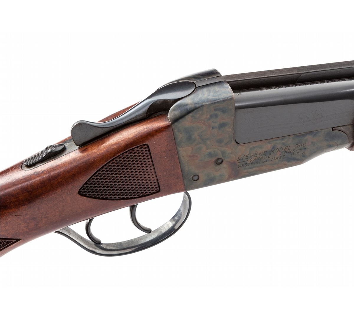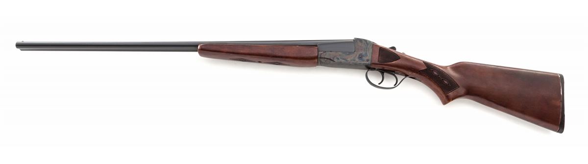 Stevens Model 311C Side-by-Side Shotgun, NVSN, .410 ga., 25'' game rib blue barrels choked Skeet/Skeet, case hardened frame, pressed checkered dark stained birch stock and forend. Condition is excellent retaining approx. 97% blue to barrels and vivid case colors. Stock with mild wear at high edges through finish. Action is crisp, bores are bright. Length of pull: 13''. Est.: $500-$750. (C&R)