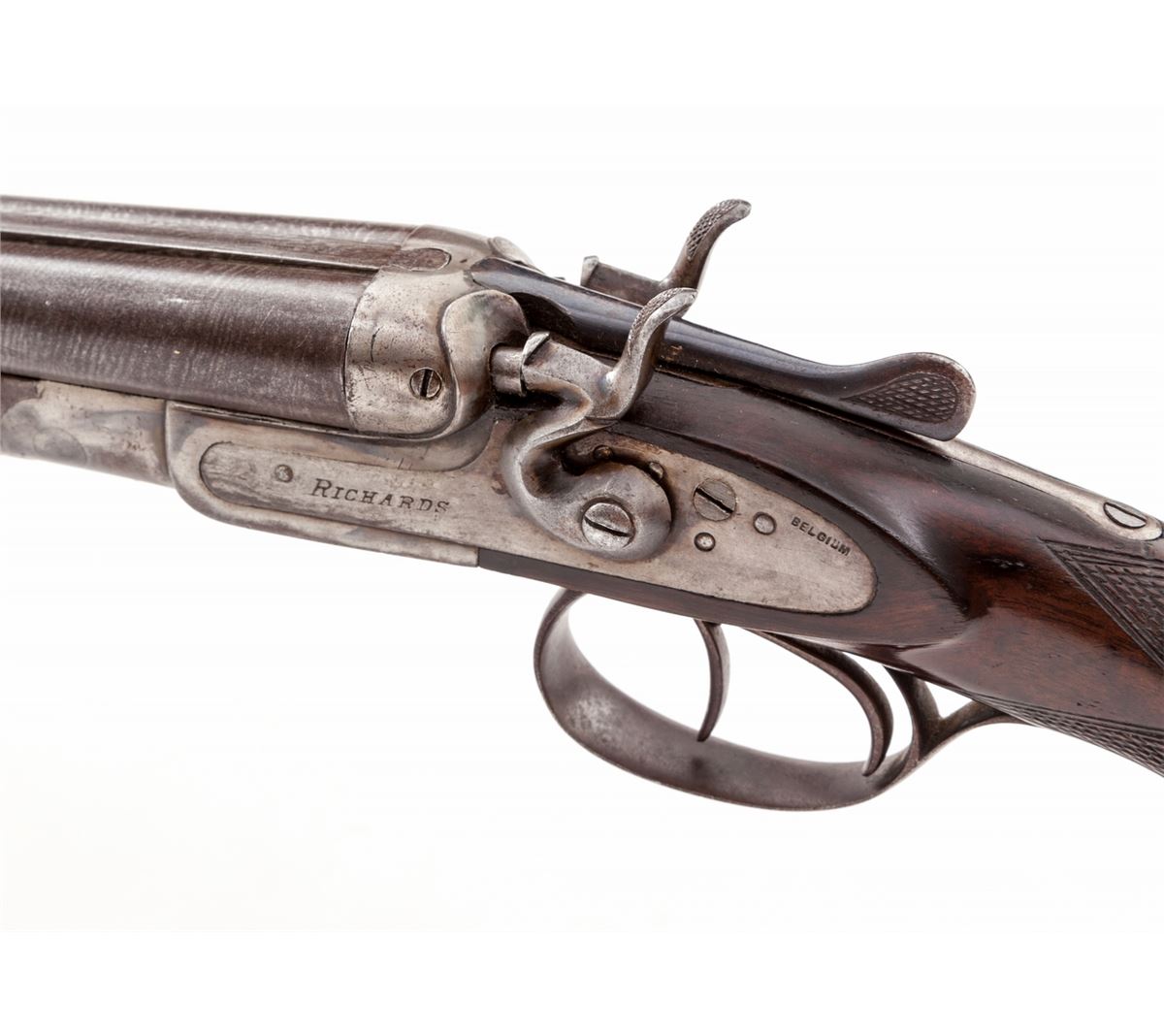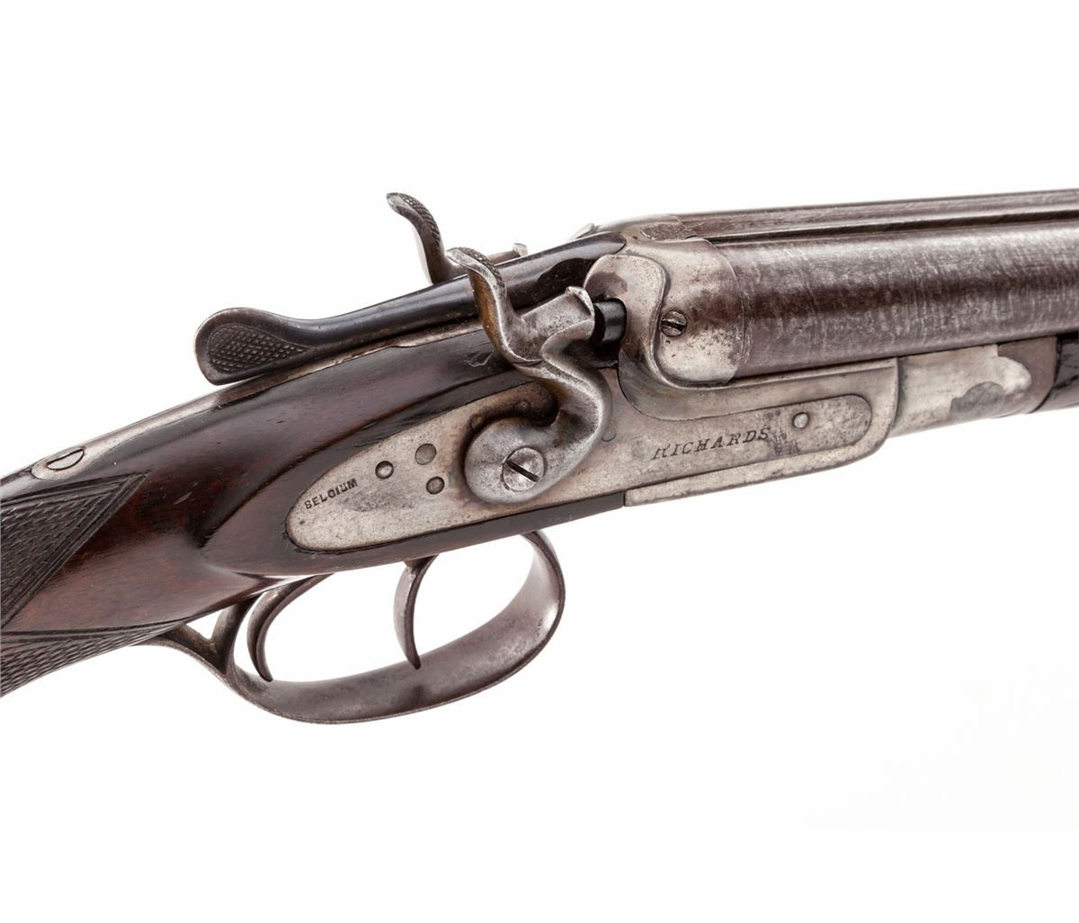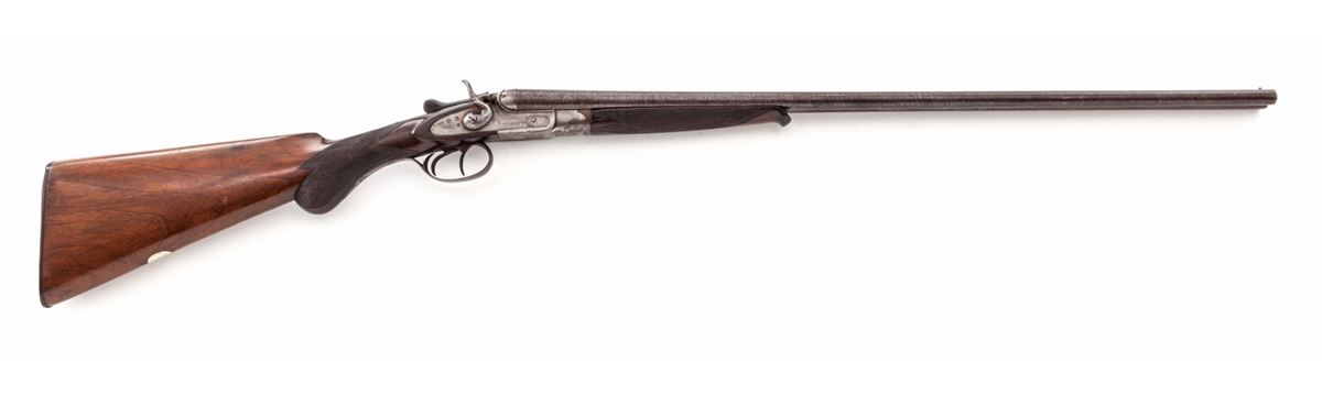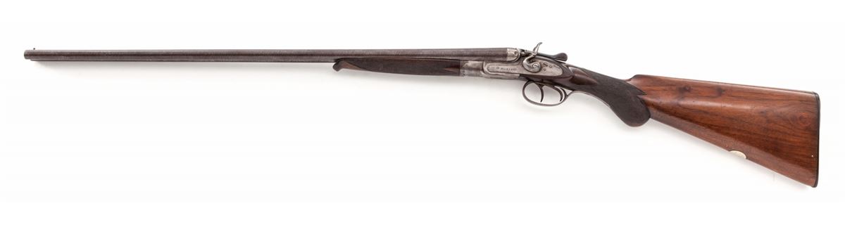 Richards Belgian Made Child's Side-by-Side Hammer Shotgun, #3916, .44-X.L.WCF shot cartridge, 24'' laminated steel barrels with a brass front bead and small doll's head top extension, double triggers with rebounding hammers and extractor; barrel flats have Belgian blackpowder proofmarks; small scale frame has a plain case-colored finish with simple detachable sidelocks and screw-in breech plugs; round knob stock and splinter forend are plain walnut with blank silver oval on the toe line. Length of pull is 13'' over a thin decorative Belgian hard rubber buttplate; weight is 4 lbs. Overall condition remains very good with working action and traces of remaining blue and case colors. Frame interior and bores are partially darkened and pitted with layers of oxidation in the chambers, screw heads are slightly marred, buttplate screws are oxidizing. Wood has light scuffing near the toe. Est.: $500-$750. (C&R)