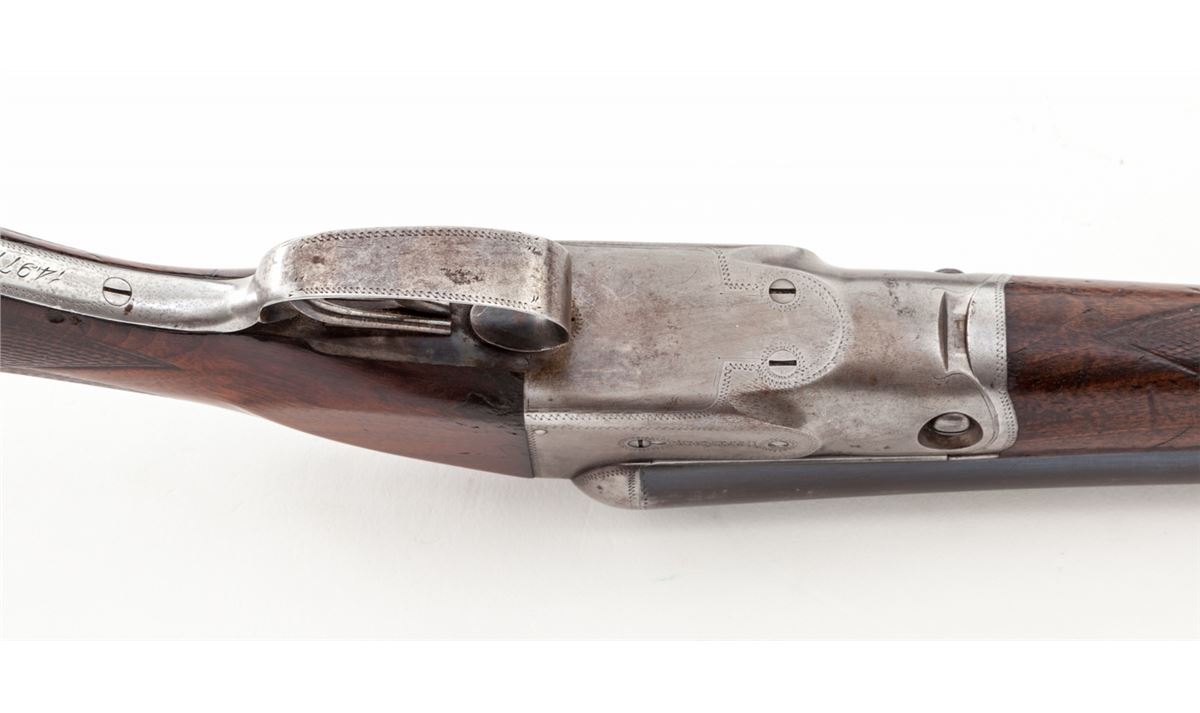 Parker Field Grade Side-by-Side Shotgun, #149777, 16 ga., 2-1/2'' chs., 28'' barrel choked Full/IC, blue and case hardened finish, double triggers, factory checkered walnut stock and forend, with Parker Bros. hard rubber butt pad. Extractors only. Mfg'd 1908. Condition is very good to fine. Frame retains approx. 20% toning case hardened colors; barrel with approx. 80% blue remaining. Stock shows light to moderate flattening to checks, light scuffs and scratches, more pronounced to forend. Action is tight, bores are bright. Standard 13-1/2'' length of pull. Est.: $1,200-$1,800. (C&R)