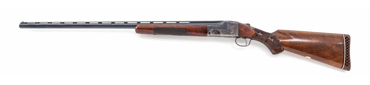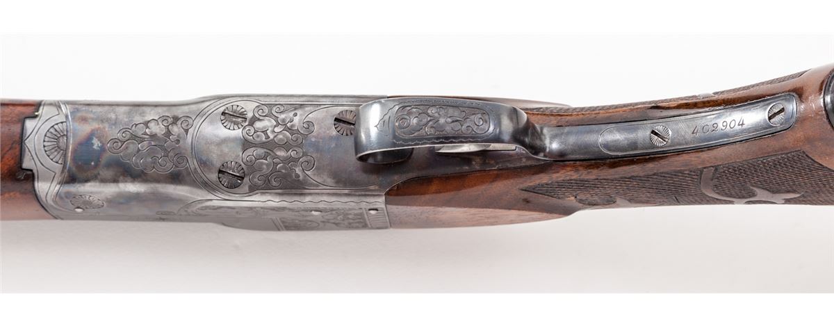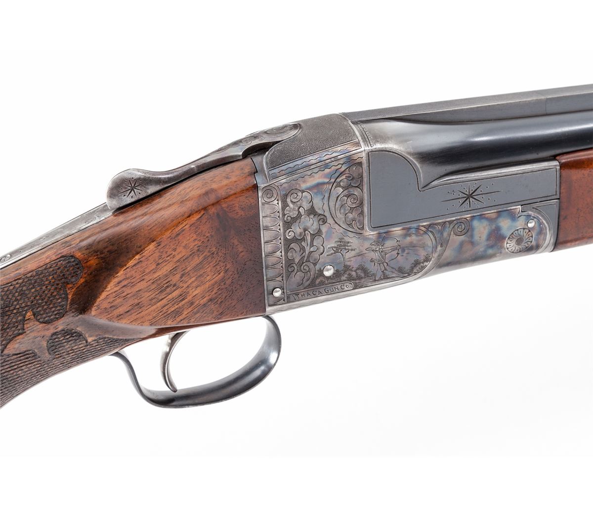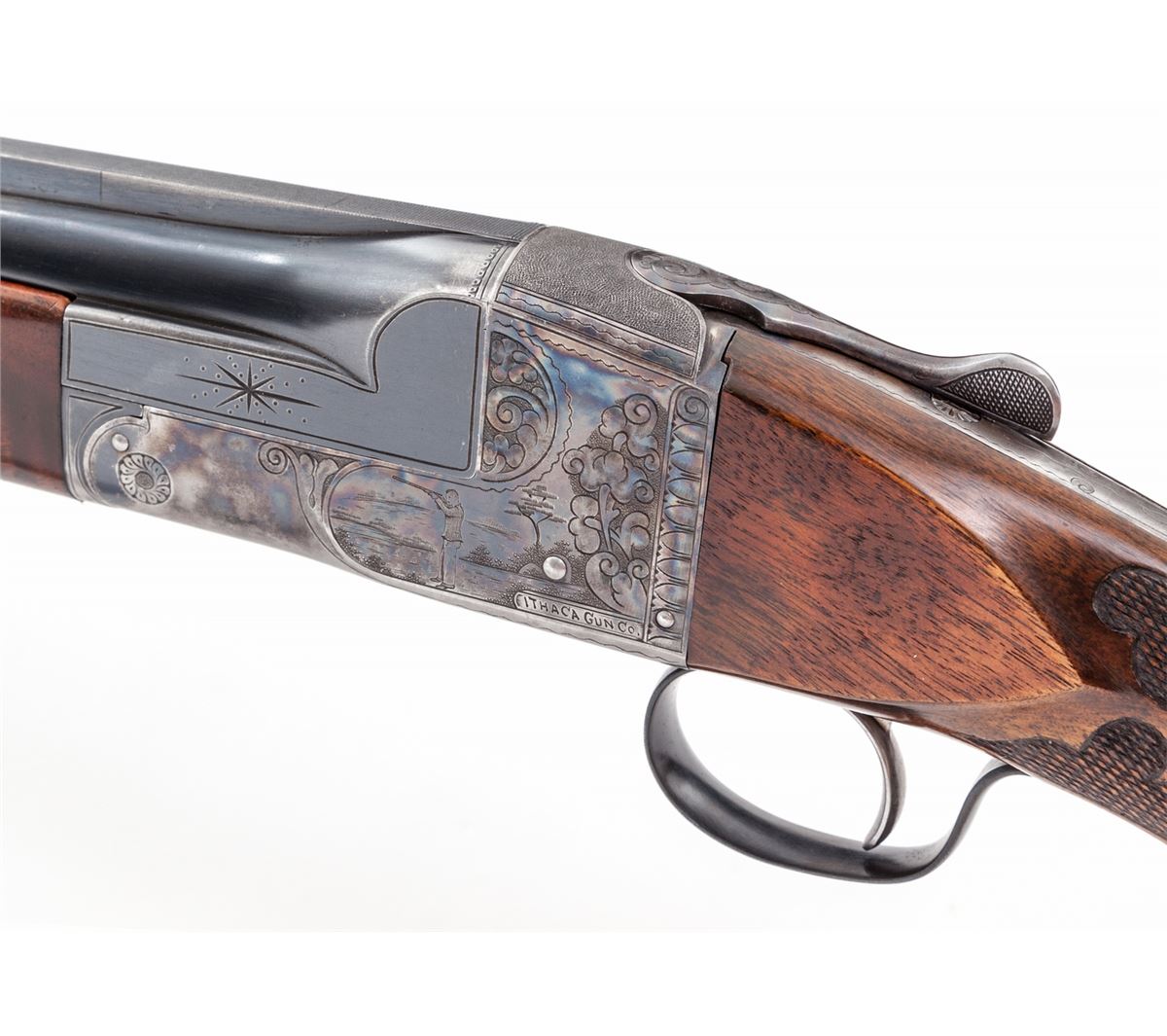 Ithaca Model 4E Single Barrel Trap Shotgun, #402904, 12 ga., 32'' Trap rib blue barrel choked Full, case hardened frame with trapshooter engraved to left side and archer to right, by long-time Ithaca engraver Bill McGraw, who worked for Ithaca for over 60 years; fleur d'lis checkered walnut stock and forend with ebony inlay near tip, and Pachmayr Whiteline brown rubber butt pad. Mfg'd 1948. Condition is excellent. Barrel retains approx. 97% blue with light marks and scuffs consistent with range use. Receiver is excellent with vivid case colors and crisp engraving. One screw at belly of frame shows mild distortion. Stock with mild flattening at wrist; original varnish shows light general crazing. Length of pull to end of wood: 13-1/2''; to end of pad: 14-1/2''. Action is crisp, bore is fine. Est.: $1,500-$2,000. (C&R)