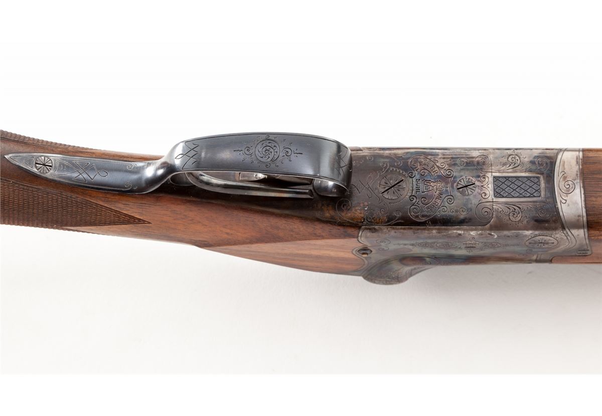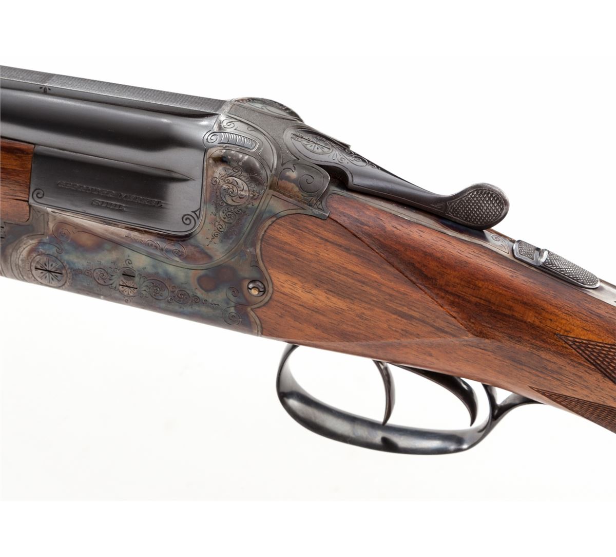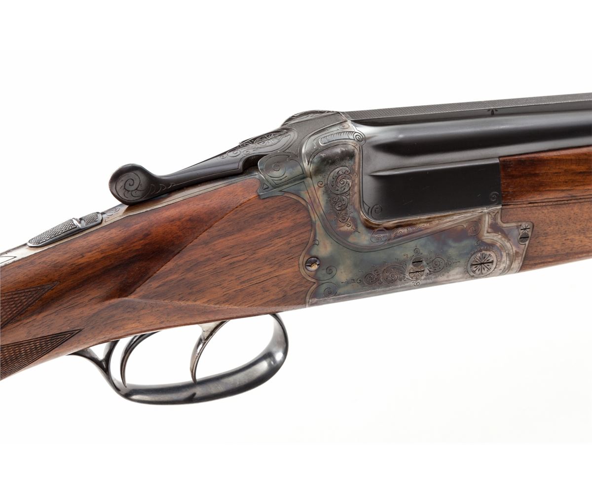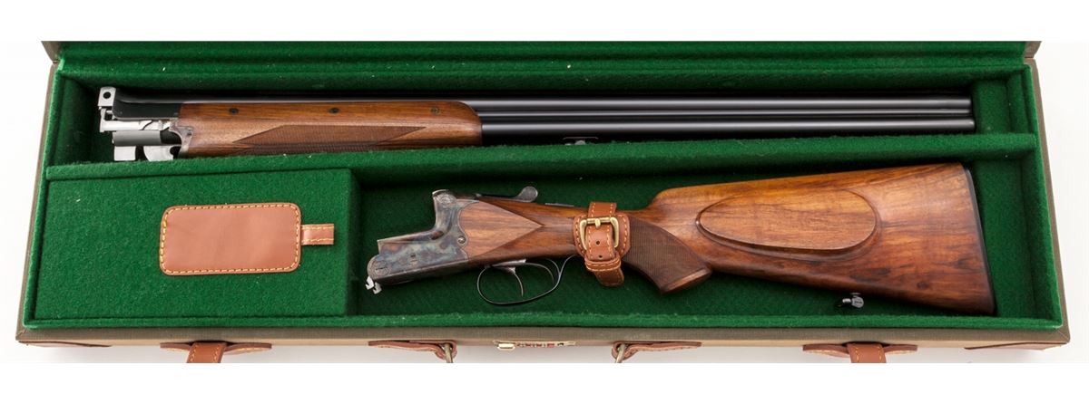 Merkel Model 200-E Over/Under Shotgun, #50513, 12 ga., 2-3/4'' chs., 28'' blue finish barrels with 8mm solid matted rib and brass front bead, fixed Mod. and I.C. chokes, double triggers with articulated front, ejectors, double crossbolts and manual top tang safety; chambers have a standard series of Suhl nitro-proof marks and a build date of 7/59. The traditional scalloped frame Merkel Blitz action is case colored and lightly engraved with bordered open scrolls and has side-mounted cocking indicator pins; finely grained French walnut swept pistol-grip stock and three-piece forend have a light oil finish, 24 LPI checkering, small shadow line cheekpiece and 3/4'' sling swivel loops. Length of pull is 14-3/8'' over 1/4'' checkered plastic buttplate, drop at comb is 1-1/2'', drop at heel is 2-3/4''; weight is 6-3/4 lbs. Included with the gun is a fabric and leather Italian luggage case lined in green felt with combination lock. Mechanical condition remains excellent with a tight action, bright bores, strong ejectors and crisp triggers; blue finish is better than 99%, case colors are 90% with losses on the forend latch and lower portions of the frame, the floorplate has a few small spots of oxidation. Stock and forend have minor fading with light scratches. Est.: $1,500-$2,000. (C&R)