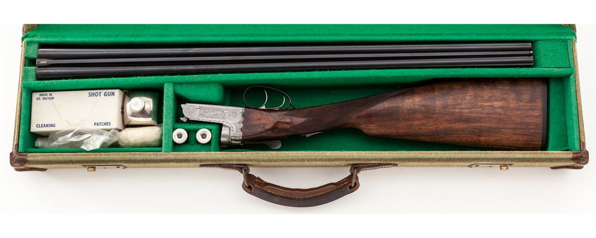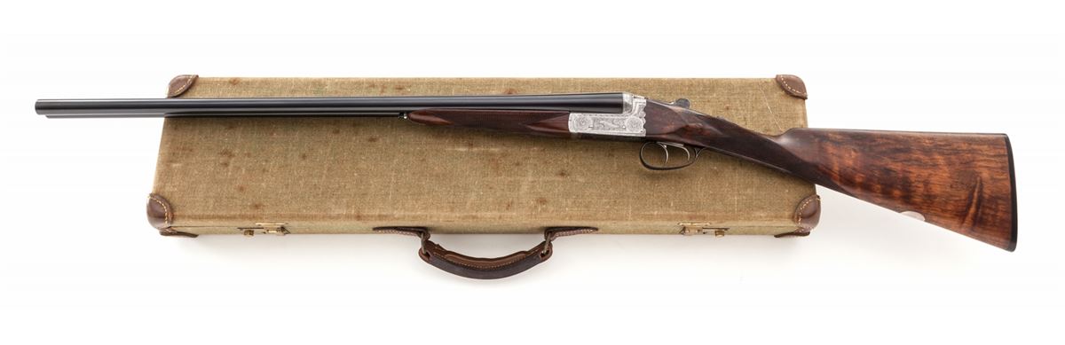 Churchill, Ltd. ''The Regal Model XXV'' Scalloped Frame Side-by-Side Boxlock Shotgun, #23877, 20 ga., 2-3/4'' chs., 25'' blue barrels with matted Churchill high-tapered ''Quick Sighting Rib'' and brass front bead, choke constrictions are .032''/.012'' with double triggers, ejectors and automatic top tang sliding safety. The action has a bright coin finish with standard rose and scroll engraving patterns extending along the upper and lower tangs and forend iron. The barrels are stamped with an A&F, Houston, TX import mark. Mfg'd approx. 1979. The French walnut straight-hand stock and Anson release splinter forend have a light oil finish and 20 LPI checkering with drop points and a silver oval on the toe line. Length of pull is 14-3/8'' over a checkered black composition buttplate, drop at comb is 1-1/2'', drop at heel 1-3/4'', cast off 1/4'' and weight of 5 lbs., 2 ozs. Overall appearance remains nearly new with only a few minor handling marks. The gun is fitted in a Churchill, Ltd. felt lined, green canvas and leather V.C. case with a complete set of unused cleaning accessories; the case exterior has scattered oil stains and scuffs. Included with gun are original Churchill, Ltd. papers and a 1981 dated Certificate of Authentication, along with a catalog from the 1981 Christie's-Abercrombie & Fitch Auction in Dallas with this particular gun listed and sold as Lot 69. (Note: Further in-depth information and additional research details on the gun and 1981 auction can be found in the book ''The House of Churchill'' by Don Masters.) Est.: $5,000-$8,000. (Modern)