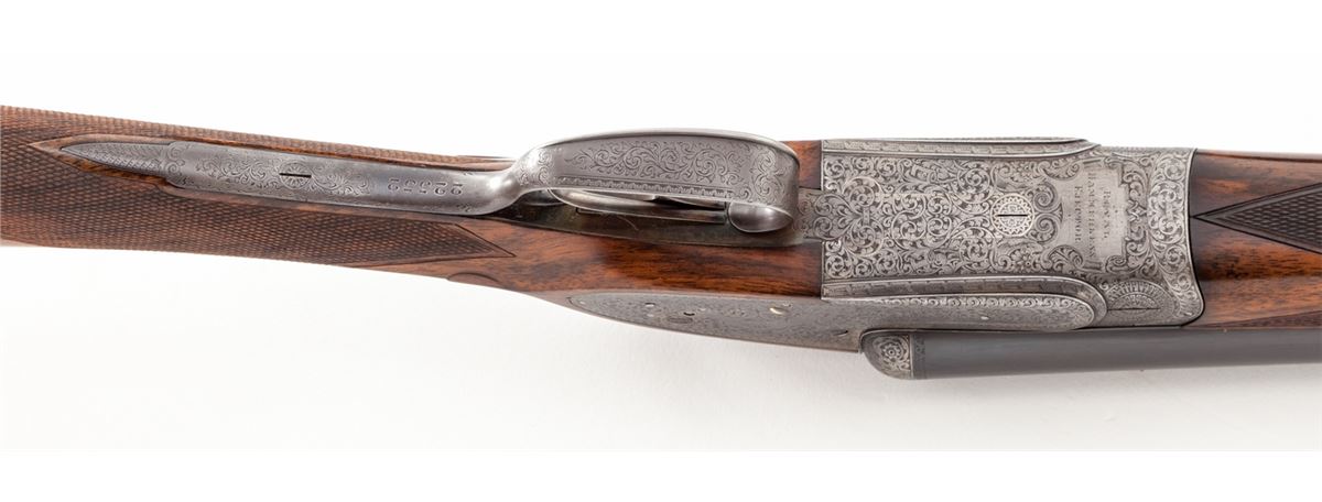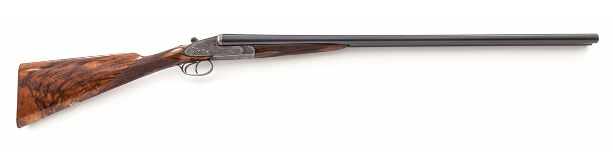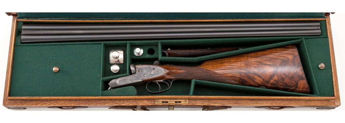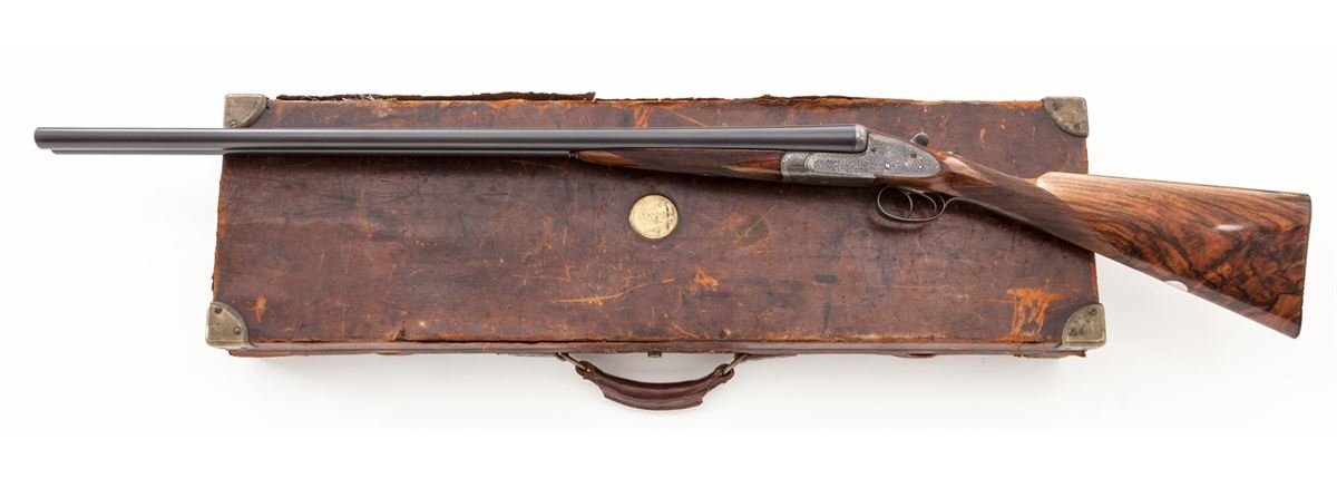 Holland & Holland ''Royal Hammerless Ejector'' Side-by-Side Sidelock Shotgun, #22352, 12 ga., 2-3/4'' chs., 30'' blue finish barrels with 3/8''smooth concave rib and front silver bead, .730'' bores without choke constrictions, standard London nitro proofs on barrel flats for 1-1/8 oz. shot, barrel wall thickness is approx .028'', with double triggers, ejectors and a manual sliding top tang safety. Case-hardened action has full coverage banded foliate scroll and geometric border engraving executed in a traditional Holland & Holland Royal pattern; locks have gold-line cocking indicators and the triggerguard has a right hand rolled edge. Records indicate a build date of 1899-1900. The straight-hand stock and Anson release forend are semi-deluxe marble-figured English walnut having a polished finish and 24 LPI bordered checkering with drop points and a vacant silver oval on the toe line. Length of pull is 14-1/2''over a 1/4'' ribbed horn buttplate, drop at comb is 1-5/8'', drop at heel is 2-1/2'', cast off is 1/4''; weight is 6-1/2 lbs. Fitted in a period oak and leather, brass reinforced luggage case with maker's label attached, along with an assortment of unused maintenance and cleaning accessories including a set of three ebony handle turnscrews, an ebony two-piece cleaning rod with attachments, a stuck case remover, two silver-plated oil bottles and silver-plated striker bottle. Mechanical condition is fine showing light wear mostly from handling and assembly. Right lock screw head is slightly deformed from removal. Action is tight, triggers are crisp, ejectors are strong and bores are bright; chambers have been lengthened from 2-1/2'' without re-proofs, chokes have been polished out leaving .735'' bores near the muzzles, The lightly refreshed barrel blue is better than 99% with slight oxidation at the muzzles. Overall case colors have thinned to 40% and are drifting to silver-gray. Refinished stock and forend have a few small areas of lightly flattened checkering, mostly along the wrist; there are two 1-1/2'' repaired splits to the wood along the left and right sides of the forend tip. Rear portion of top rib has lifted from the barrels and has been re-laid with a liquid weld; buttplate has light chipping. Luggage case leather exterior is scuffed and peeling along the edges exposing the wood, no securing straps are present; latch button is missing its escutcheon and key, handle assembly remains intact and is firmly attached; case interior has a recent green felt relining of the partitions and compartments. Est.: $12,000-$15,000. (C&R)