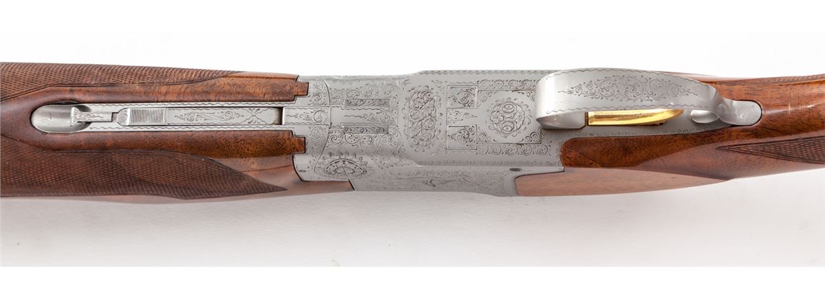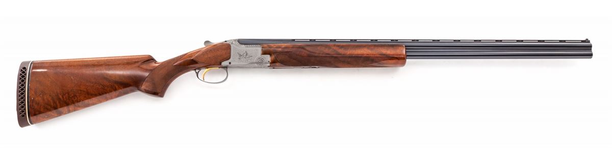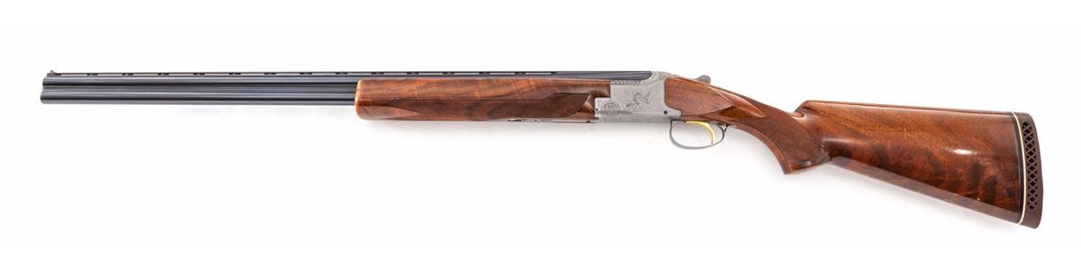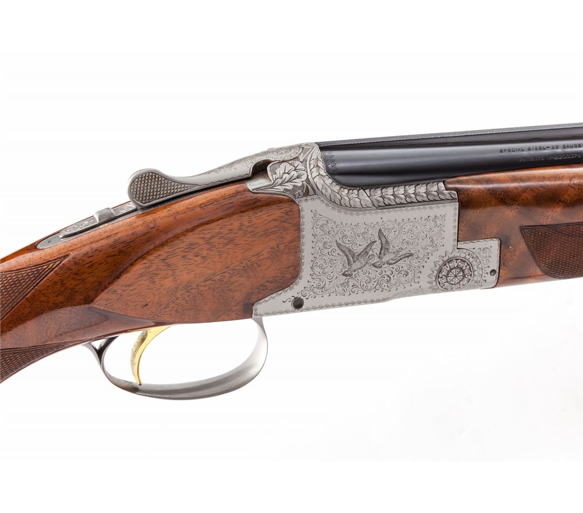 Browning Superposed Pigeon Grade Over/Under Skeet Shotgun, #2901F70, 28 ga., 2-3/4'', 28'' blue finish 1/4'' ventilated rib barrels with front and middle white beads, both barrels with Skeet chokes, combination sliding top tang safety and barrel selector, gold-plated trigger and ejectors. The French Gray finish frame is engraved with standard Browning Pigeon Grade full coverage scroll and game scenes. The flat knob pistol-grip stock and target forearm are medium figure walnut with a high gloss finish and 24 LPI checkering. Length of pull is 14-3/8'' over a 1'' Browning ventilated recoil pad. Mechanical condition remains excellent showing only occasional use with bright bores, tight lockup and strong ejectors; frame and barrel finish remain better than 99% with a few small scuffs along the rib, wood finish is 90% with overall vertical crazing in the buttstock urethane; no visible evidence of salt wood along the inletting. One of the rarest Browning Superposed models in this configuration. Est.: $4,000-$6,000. (Modern)