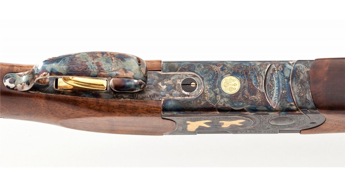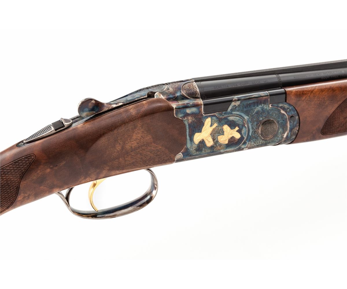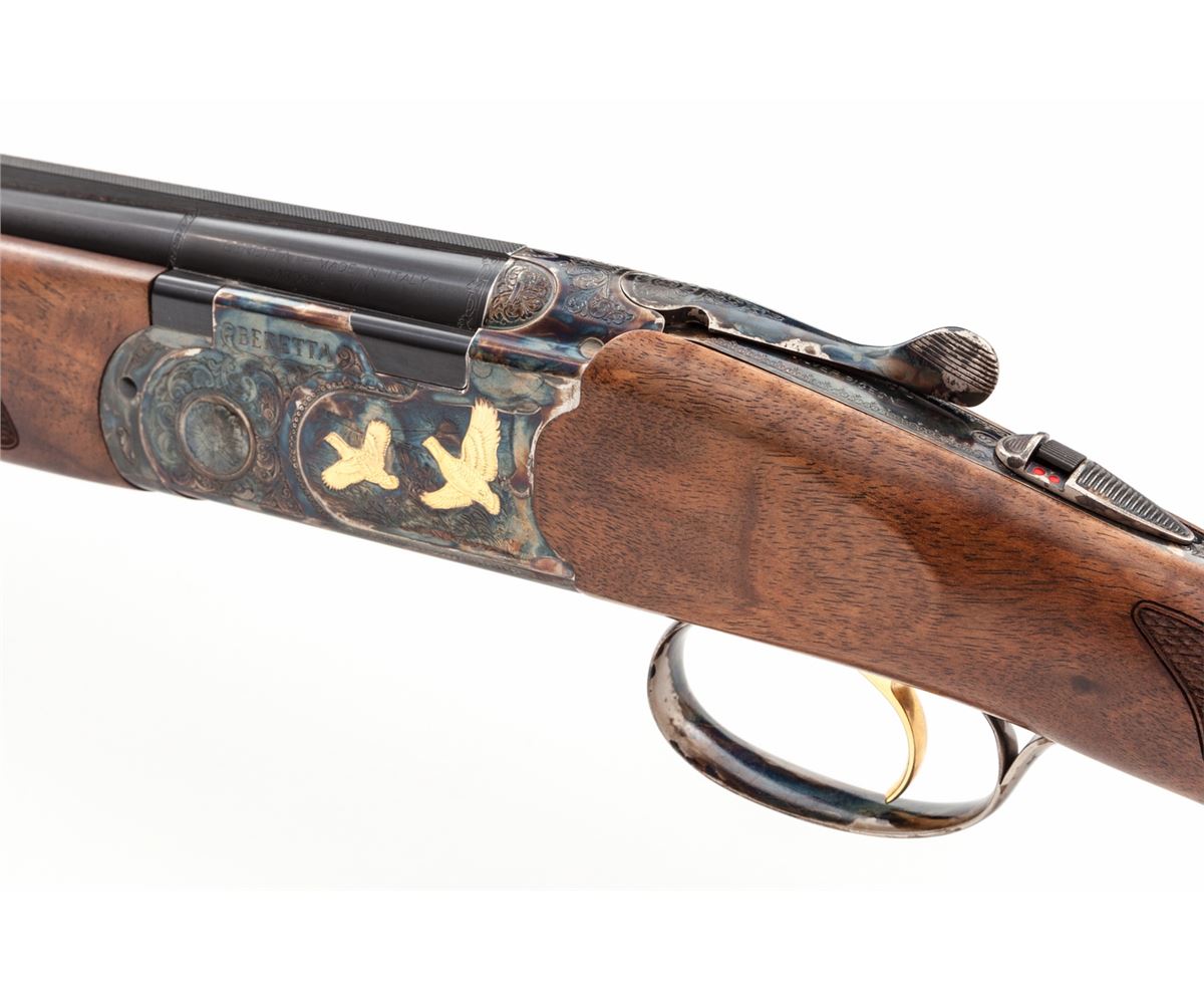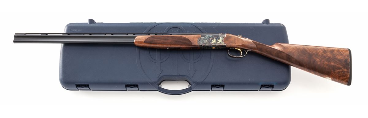Beretta Model 687 Silver Pigeon V Over/Under Boxlock Shotgun, #N02718S, .410 bore, 3'' chs., 28'' blue finish barrels with 6mm matted ventilated rib and silver front bead, Beretta Mobilchoke set (F,IM,M,IC,C), ejectors, single gold-plated trigger, combination top tang automatic safety and barrel selector. Case-colored small gauge frame has full coverage floral scroll engraving with punch dot backgrounds bordering applied gold pheasants and grouse; engraving pattern carries to the triggerguard and forend iron; frame has an Italian date code of 2006. The straight grip stock and slim forend are well matched highly figured deluxe walnut displaying an exceptional open grain feather pattern with an oil finish, 20 LPI checkering and a silver oval on the toe line. Length of pull is 14-3/8'' over a 3/8'' Beretta soft black recoil pad, weight is 6-1/2 lbs. The gun is complete in its original blue Beretta ABS case with Beretta accessories including a choke wrench, sling swivels, oil bottle, warranty and instructions and an extra Gel Tek green recoil pad with adapter rings. Overall condition remains near excellent with faint signs of field use. Case colors are slightly diminished around the edges and the upper barrel chamber and face have residual powder oxidation. Est.: $1,800-$2,400. (Modern)