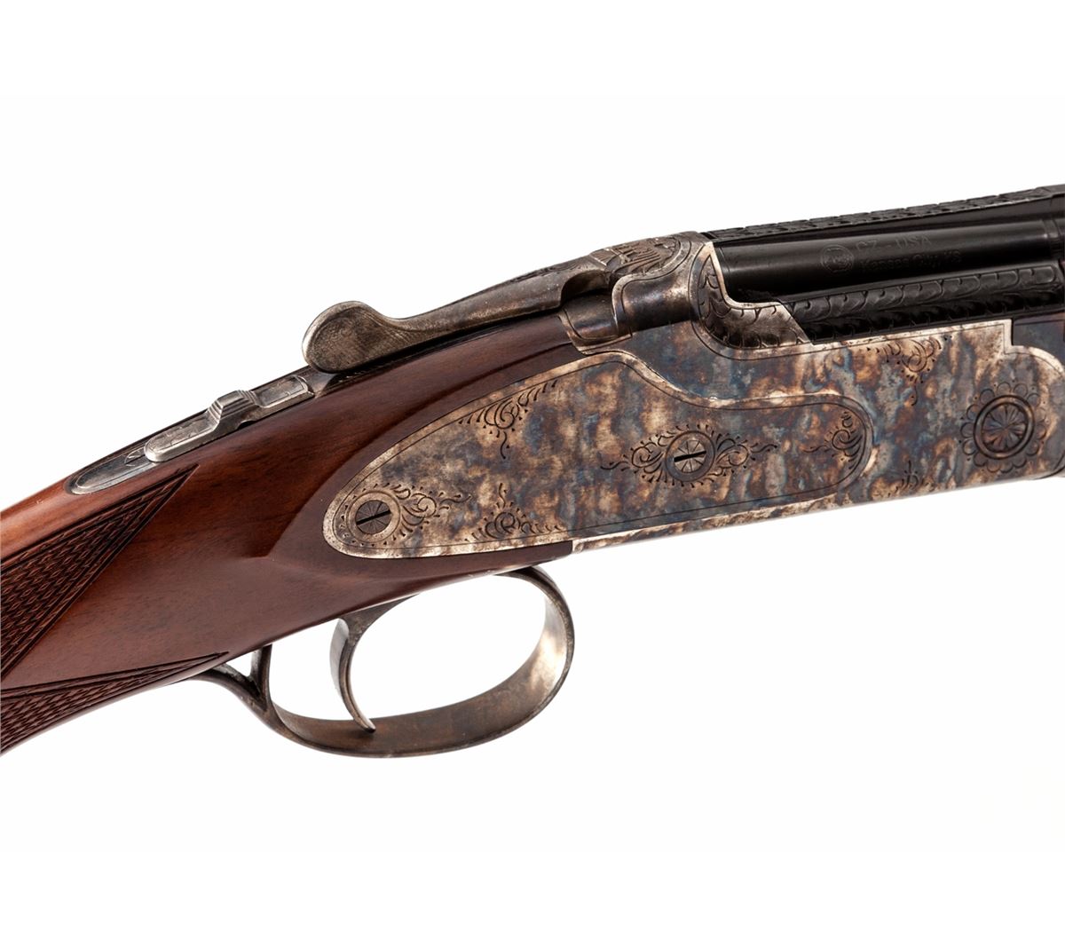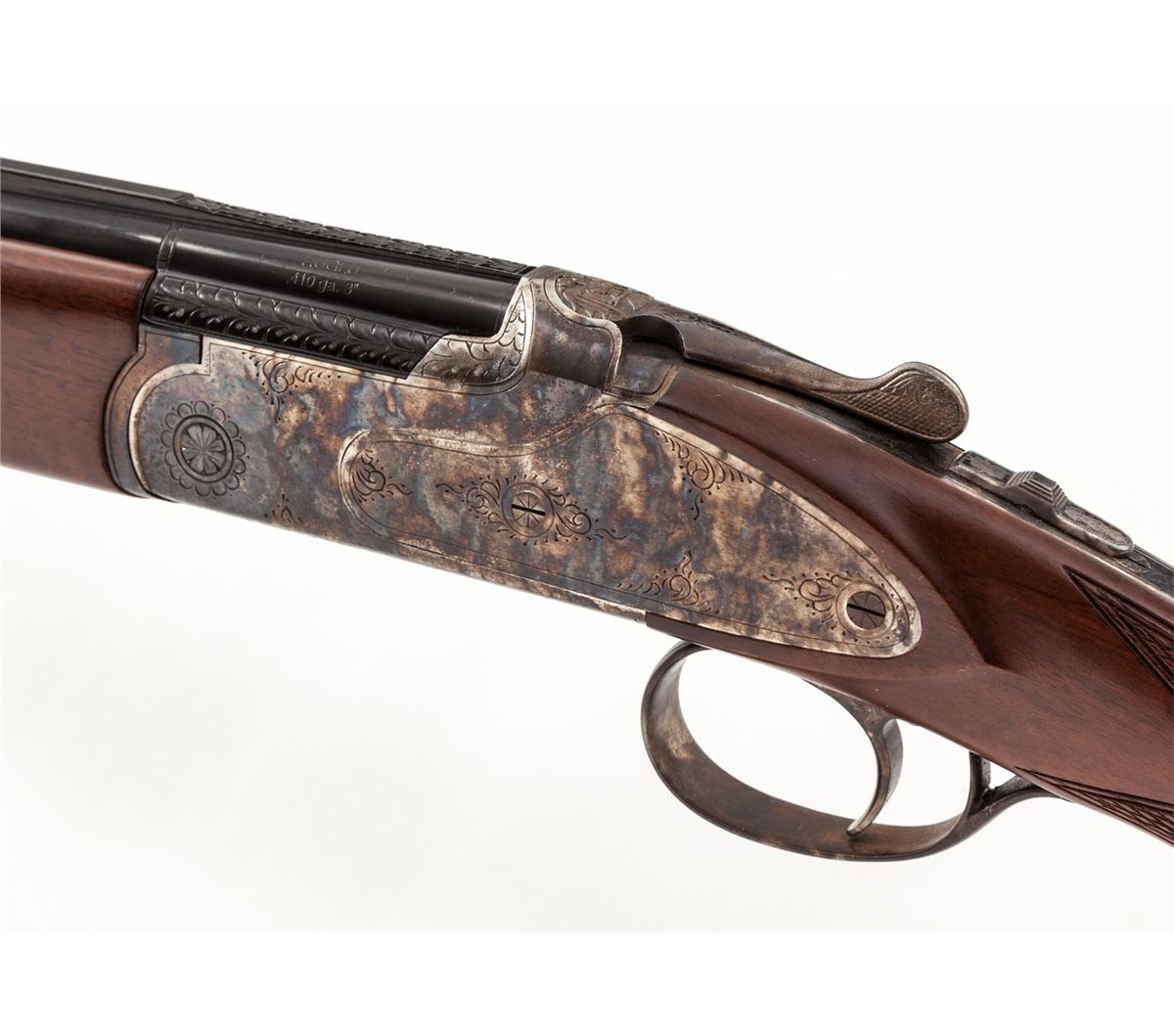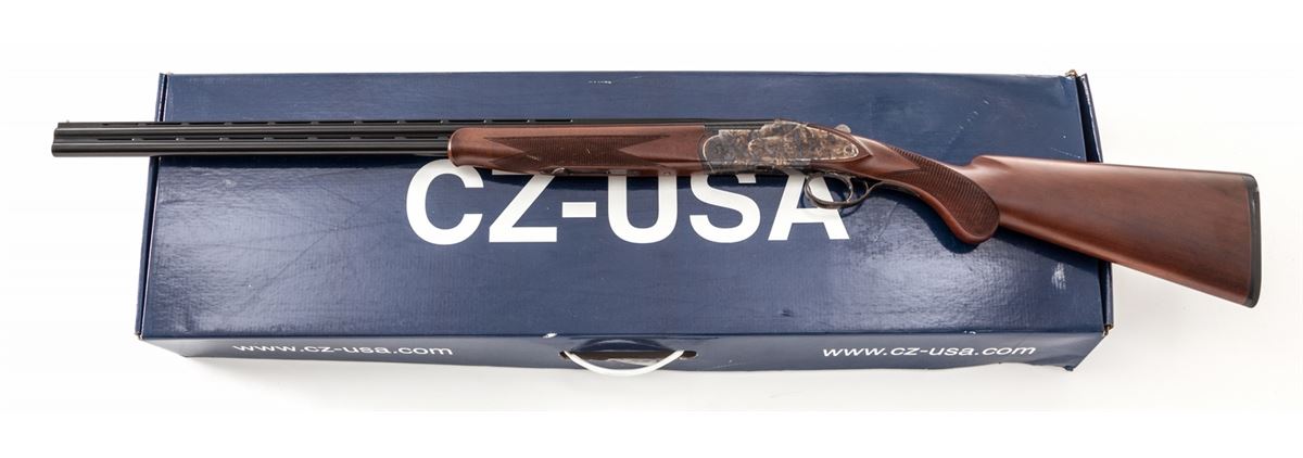 CZ Woodcock 103F Mini Over/Under Shotgun, #05S2510, .410 ga., 26'' vent rib barrels choked Full/Imp., blue and case colored, with dark stained checkered round knob pistol-grip stock. Condition is excellent, appearing as new and unfired, in original box. Est.: $800-$1,200. (Modern)