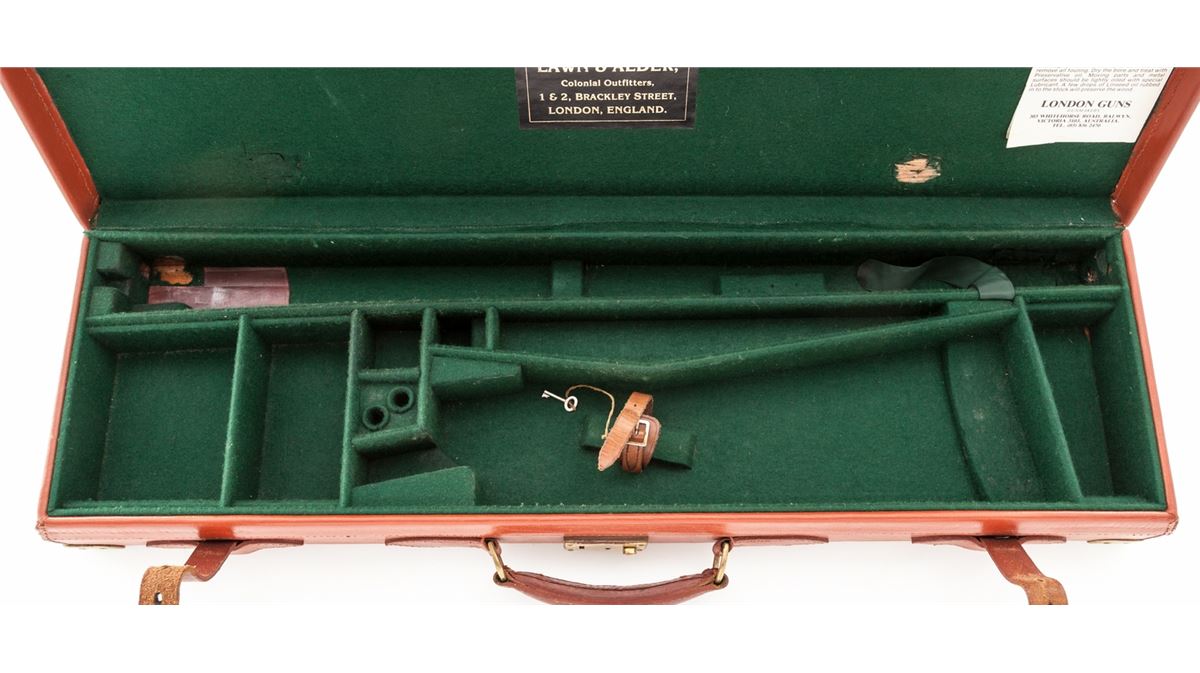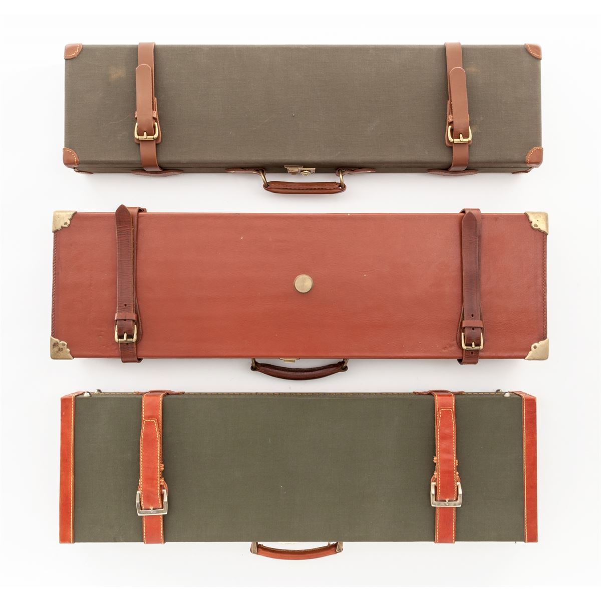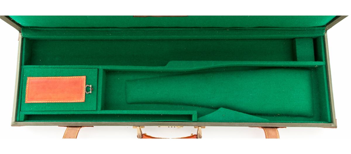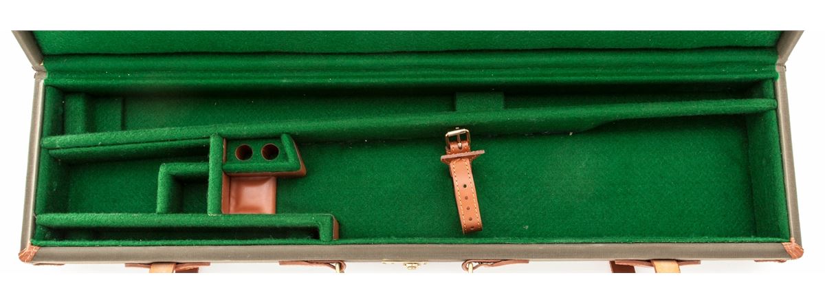 Three (3) Italian Gun Cases: 1) Leather luggage case with Lawn & Alder trade label for a side-by-side double rifle with 29'' or shorter barrels, brass reinforced corners, green felt lining, and one key. Condition remains very good with light scuffing in the exterior leather and a spot of fabric wear from the front sight. Missing two barrel blocks. 2) Canvas and leather luggage case with a Griffin & Howe trade label for an over/under shotgun with 29'' or shorter barrels, green felt interior and combination lock. Case appears unused with a few storage marks. 3) Canvas and leather luggage case for a 20 ga. side-by-side shotgun with 29'' or shorter barrels, green felt interior, key lock with two keys. Case appears unused with a few storage marks and fading. Est.: $300-$500/lot.