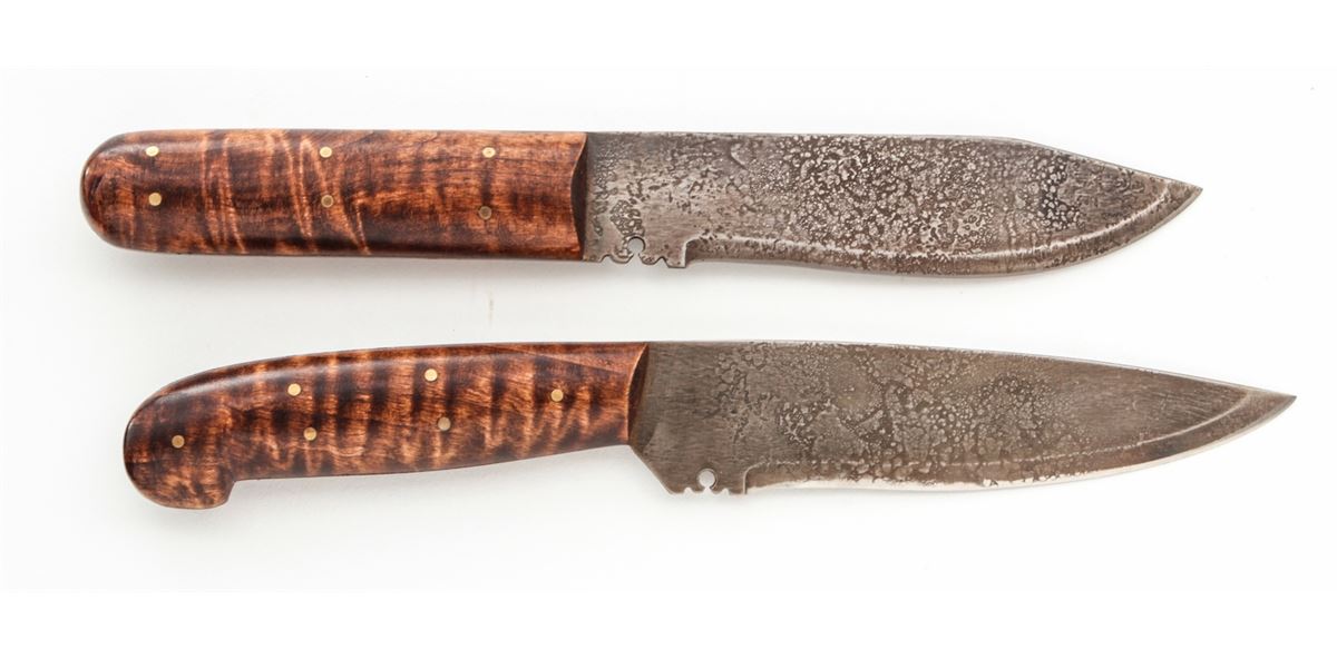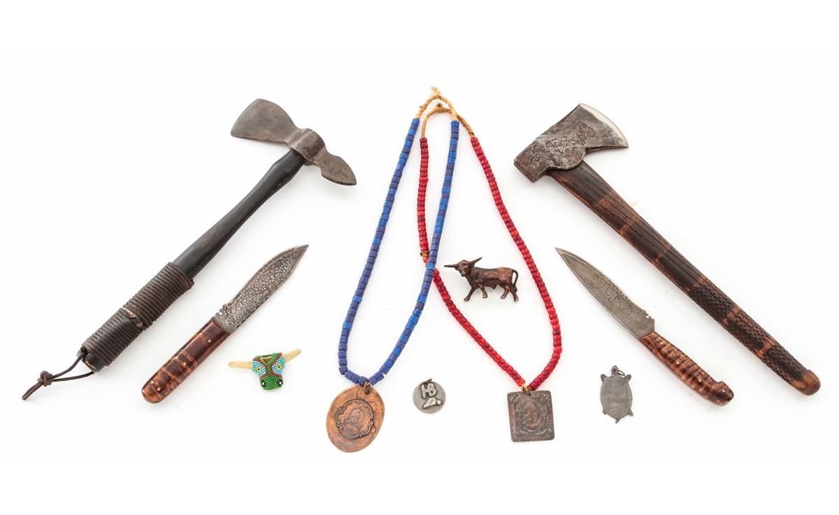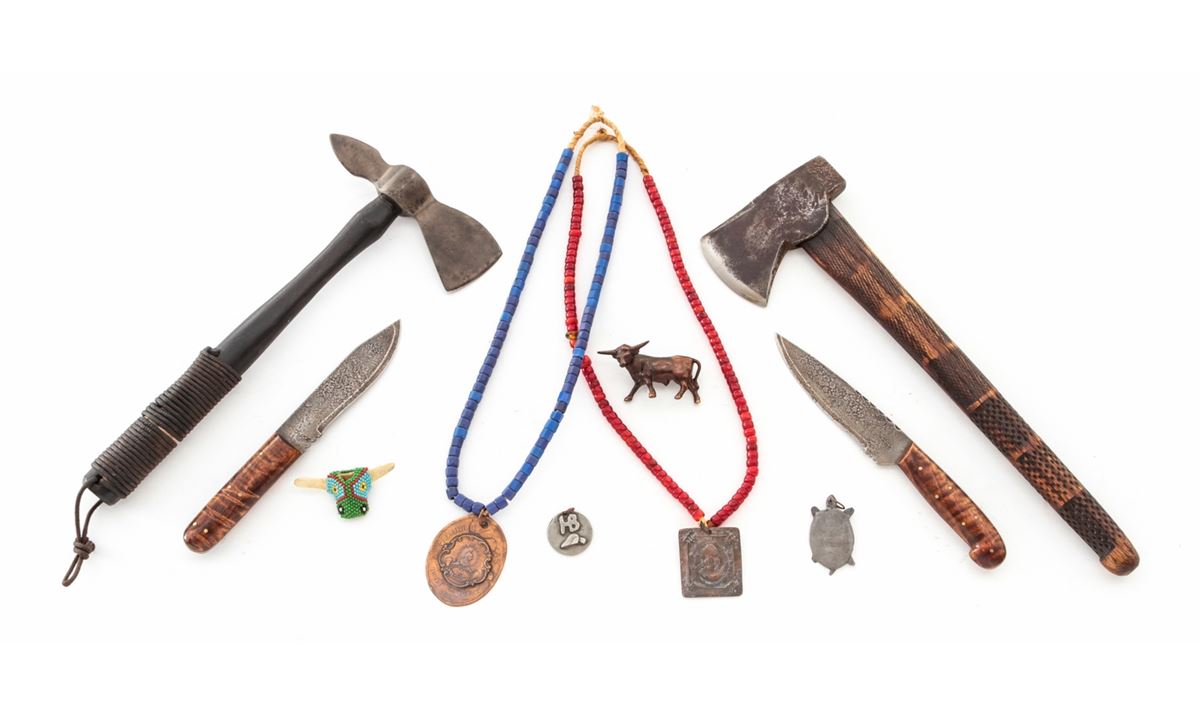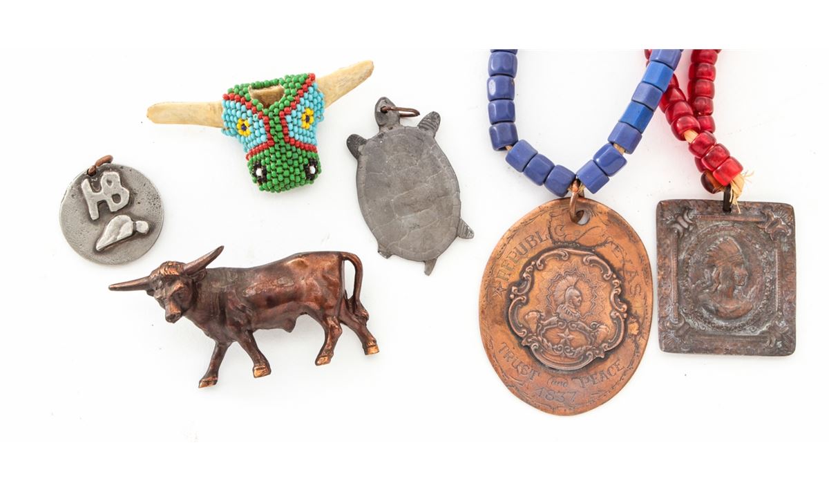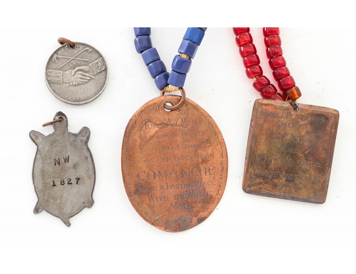 Frontierman's Lot: (1) Blue beaded necklace with old reproduction medal that reads on front ''Republic of Texas/Trust and Peace/1837'', and on back, ''Know All Men to Whom the Bearer Shall Come Our Red Brethren the Comanche Have a Lasting Peace with the White Man''. (2) Red beaded necklace with bronze Indian medal that reads ''United States of America/Peace and Friendship/Trade and Trust 1798''. (3) Two pendants, one turtle shaped marked ''NWA 1827'' and one hand-forged with ''HB'' on front and ''Peace and Friendship'' on the back. (4) Approx. 15'' hand-forged axe with decorated wooden shaft. (5) Indian tomahawk with wooden shaft. (6) Two hand-forged skinning knives with more modern grips. Est.: $250-$350/lot.