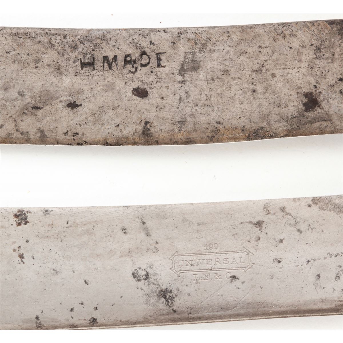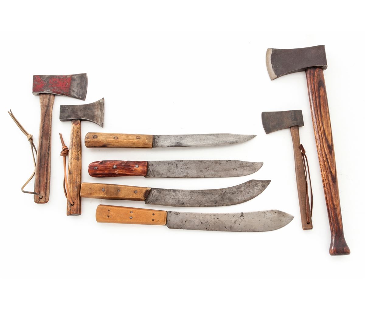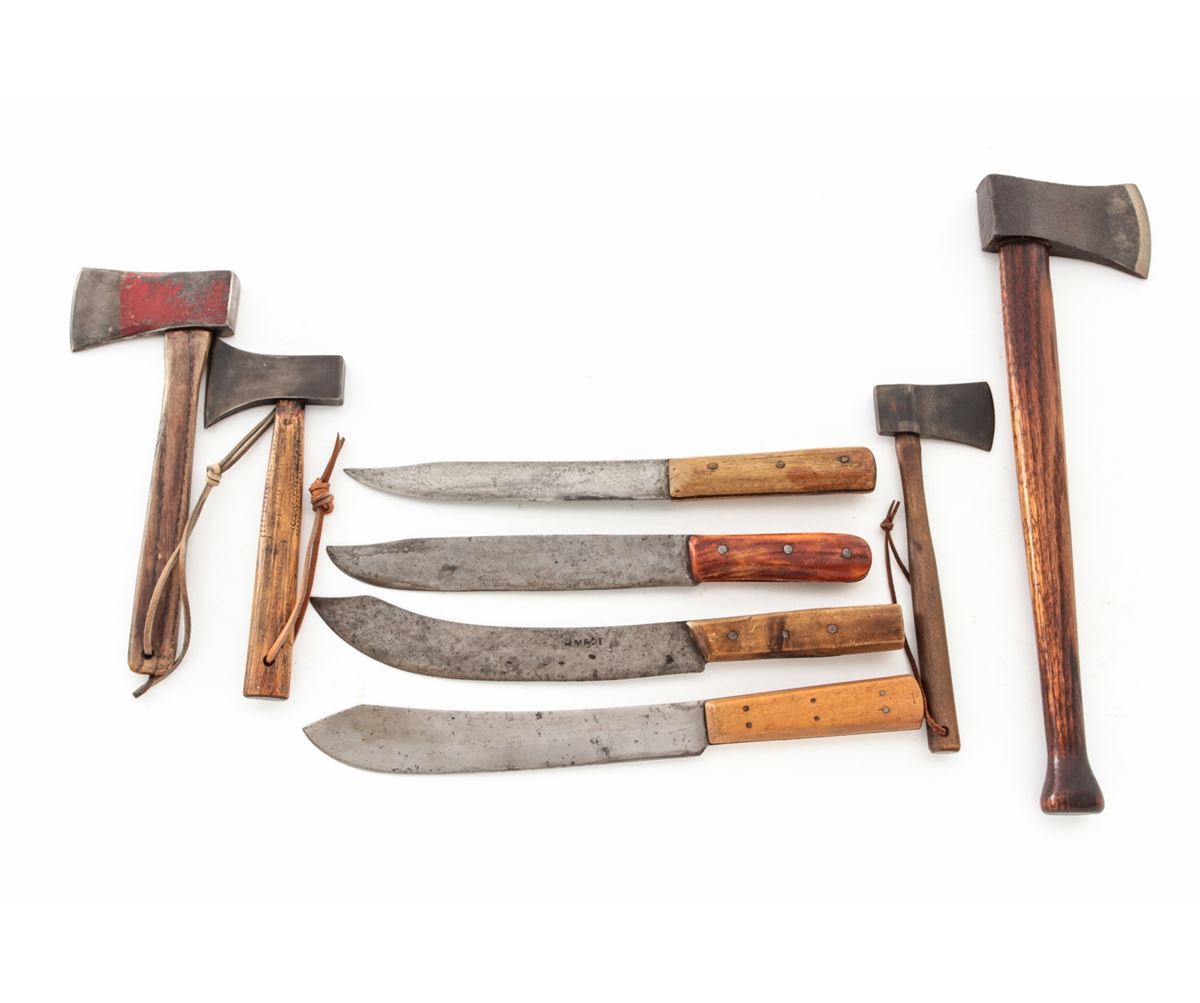 Lot of Eight (8) Vintage Hand-Forged Knives and Axes, with blades measuring approx. 9'' each, one marked ''199/Universal/L.F.&C.'' (Landers Frary & Clark), and one marked ''HMADE'', all with wooden handles. Axes measure from 9'' to 17'' in overall length, with wooden handles. Condition to all is good appearing to be gunsmith made. Est.: $200-$300/lot.