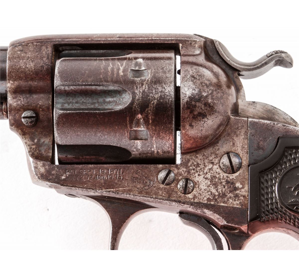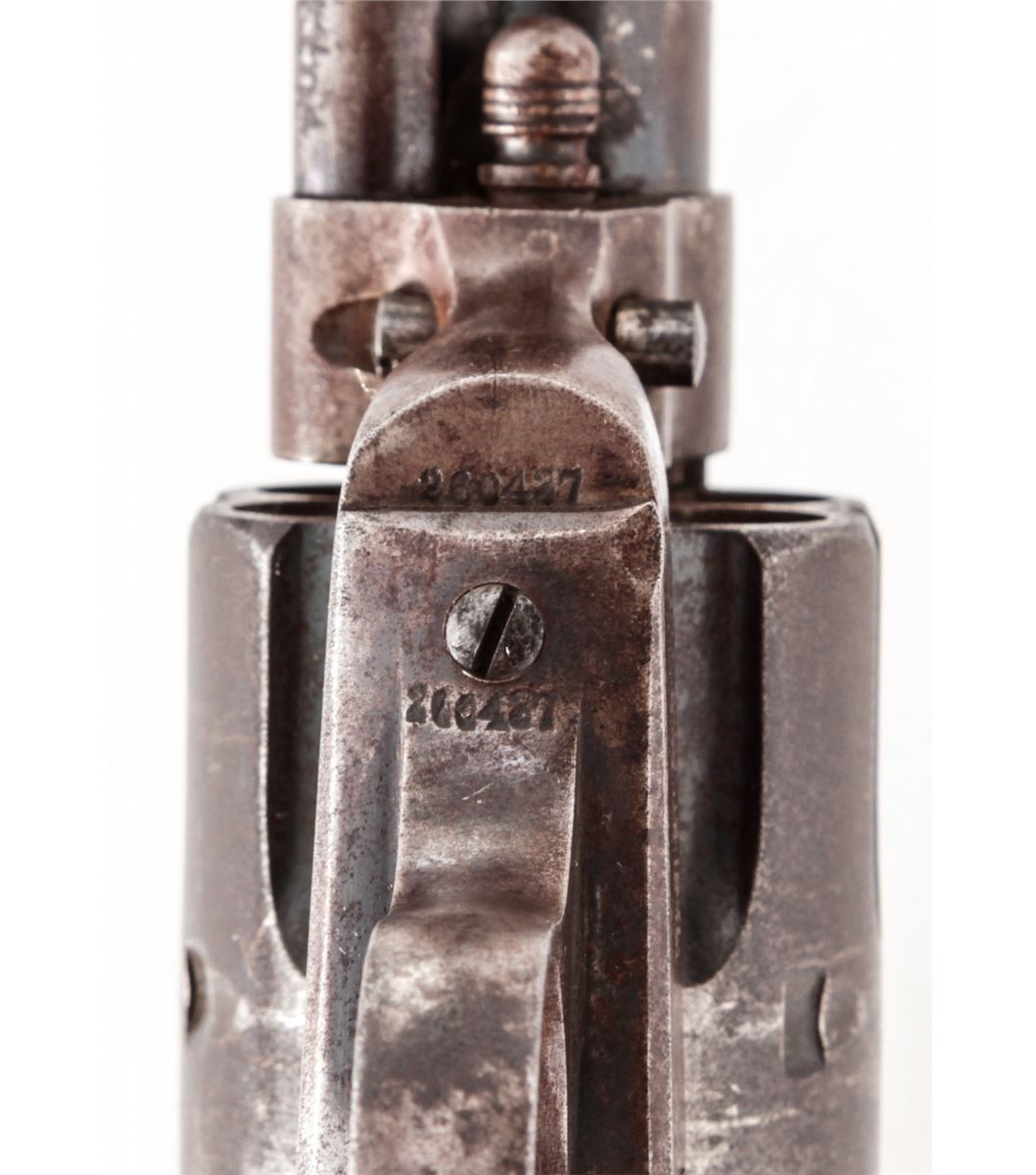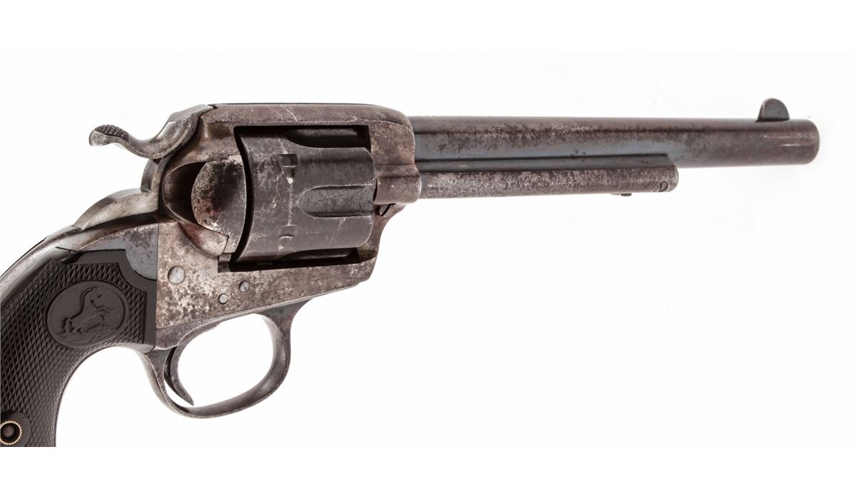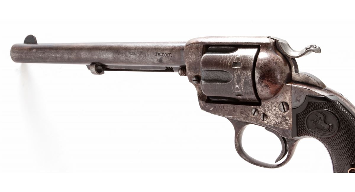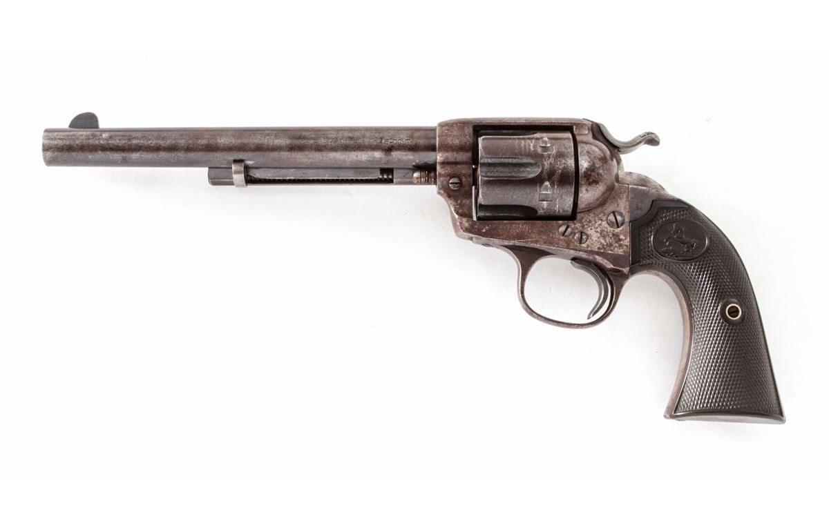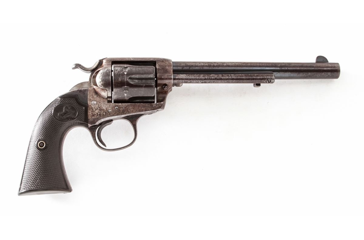 Colt Bisley Single Action Revolver, #260437, .45 Colt cal., 7-1/2'' barrel, blue and case hardened finish, factory checkered hard rubber grips. Mfg'd 1904. Condition is good to very good retaining approx. 40% blue. Case colors have toned a grayish brown. Grips with moderate flattening. Good action and fine bore. Est.: $1,000-$1,500. (C&R/PPT)