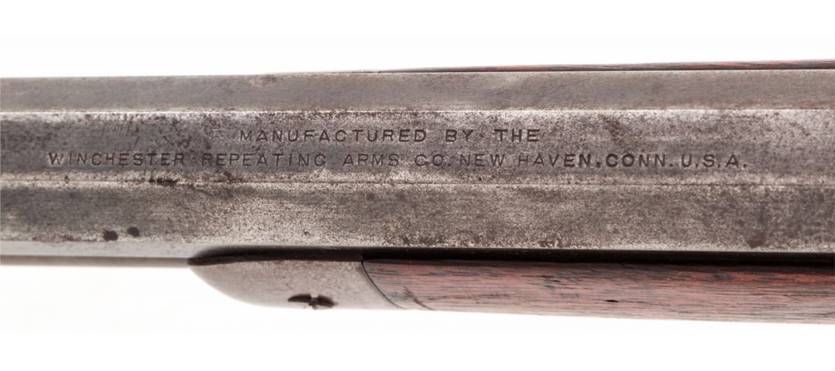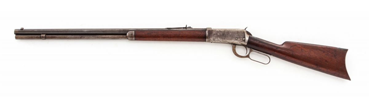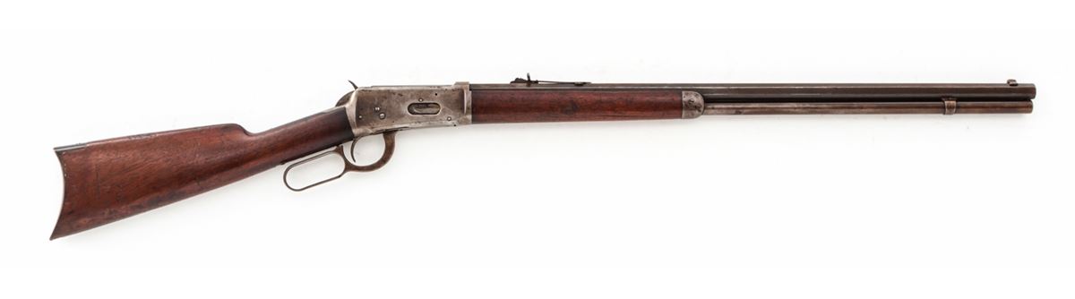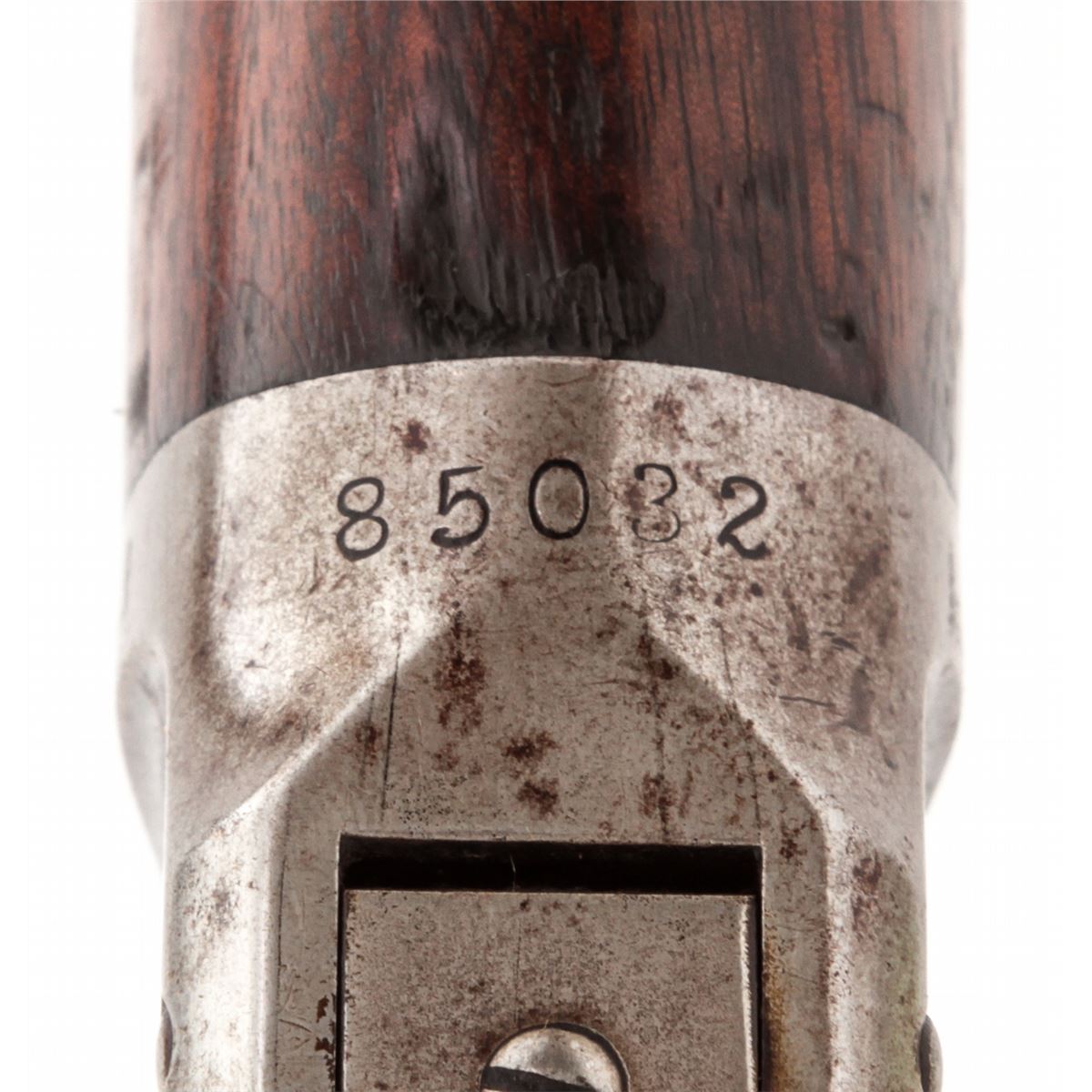 Antique Winchester Model 94 Lever Action Rifle, #85032, .30-30 cal., 26'' octagonal barrel, blue finish, walnut stock, with standard sights. Mfg'd 1897. Condition is good to very good retaining approx. 75% blue. Stock with moderate scuffs, scratches and oil darkening. Rear sight elevator is a replacement. Good action and bore. Est.: $500-$750. (Antique)