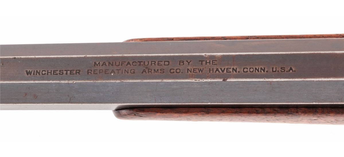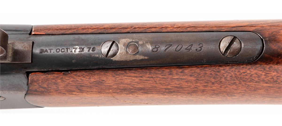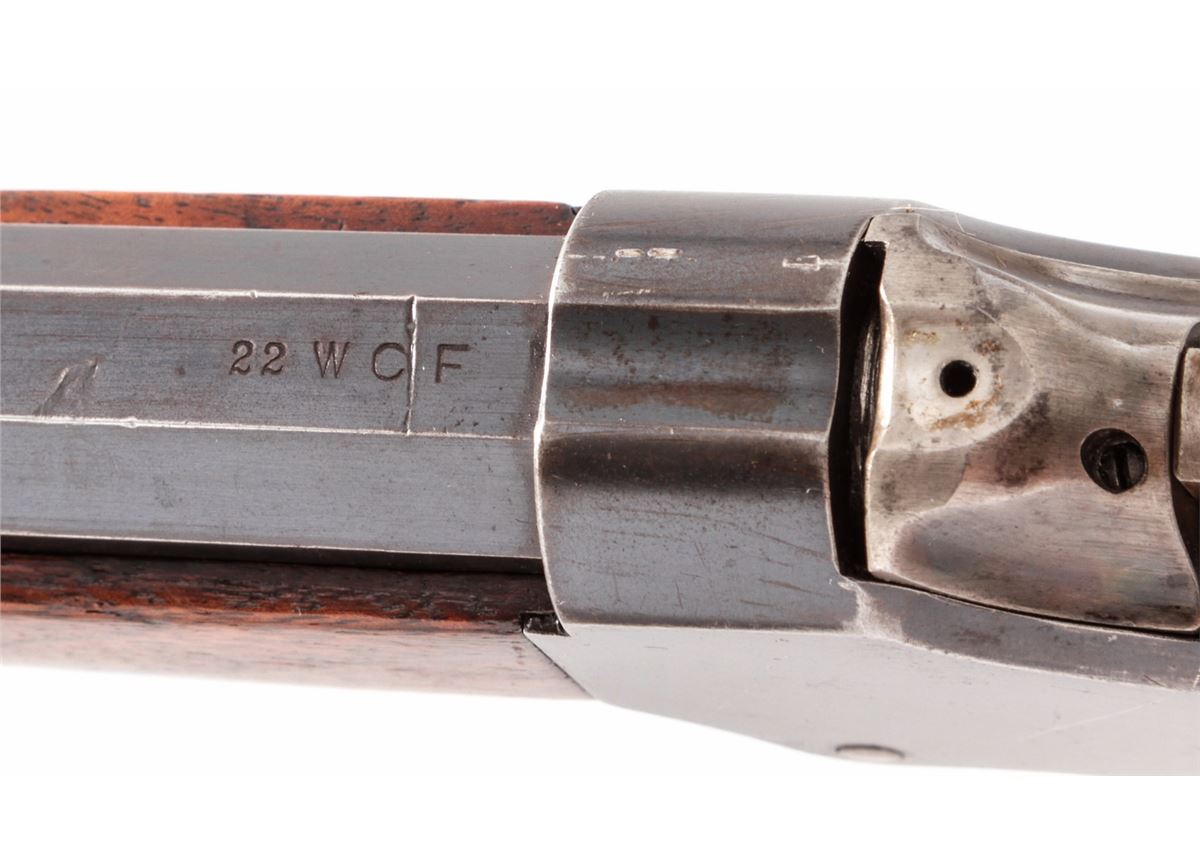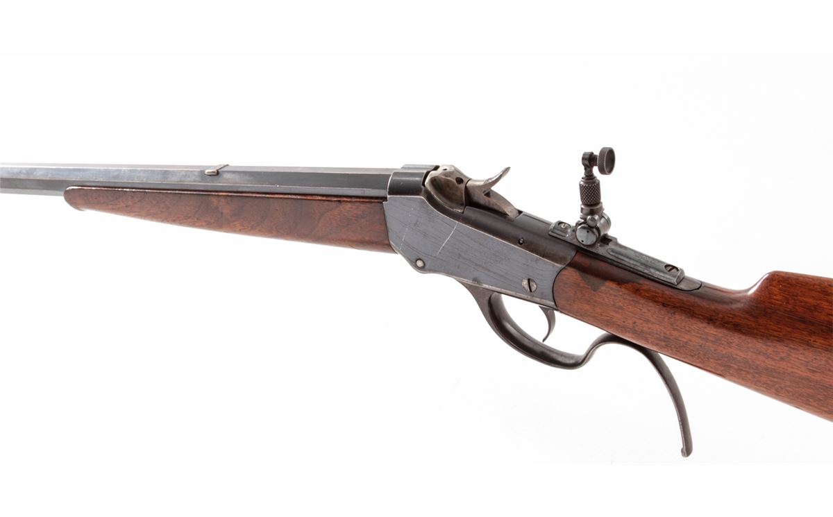 Winchester Model 1885 Low-Wall Single Shot Rifle, #87043, .22 WCF cal., 25'' octagonal barrel of No. 1 weight, blue finish, walnut stock, with hooded front sight and Lyman tang rear. Mfg'd 1900. Condition is near fine retaining approx. 80%-85% blue. Stock shows scuffs and scratches, repair at upper tang, and small fracture emanating from apex of upper tang, and additional varnish. Crescent buttplate is missing. Lever has been modified for ease of use. Action is crisp, bore is very good. Est.: $500-$750. (C&R)