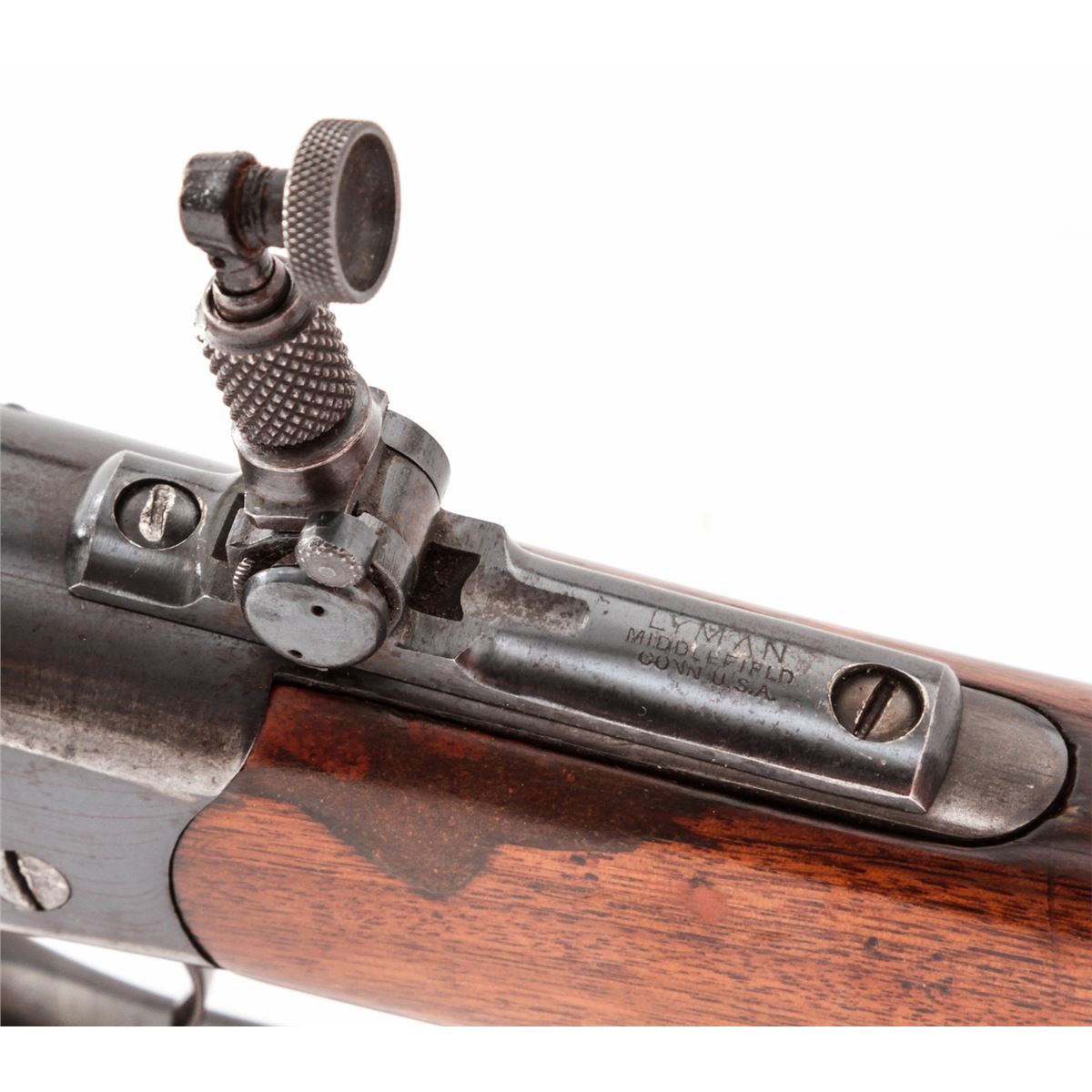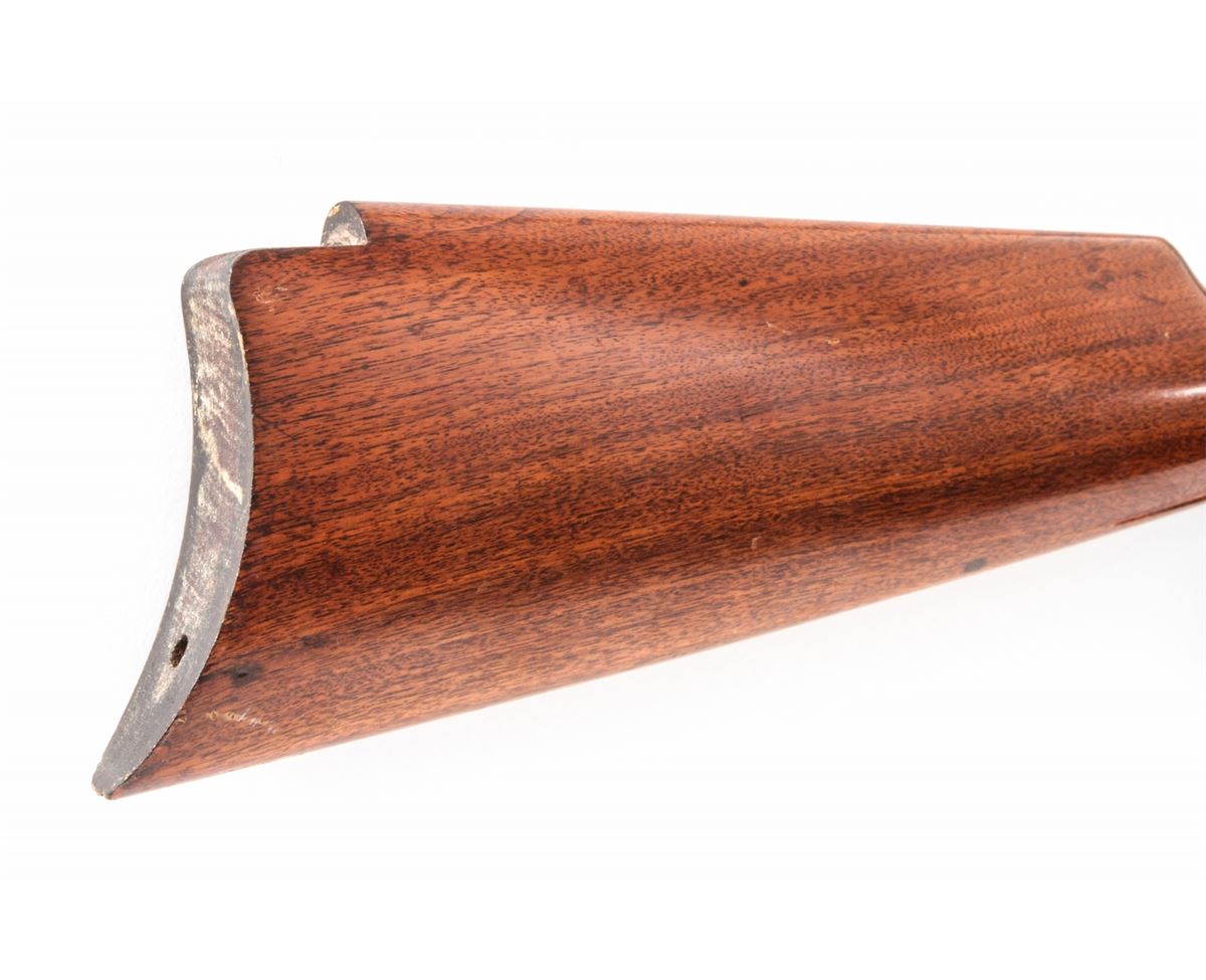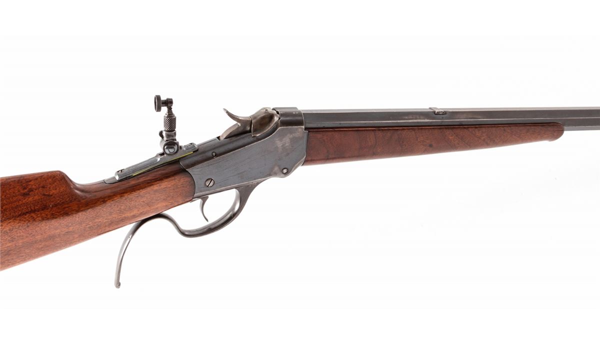Winchester Model 1885 Low-Wall Single Shot Rifle, #87043, .22 WCF cal., 25'' octagonal barrel of No. 1 weight, blue finish, walnut stock, with hooded front sight and Lyman tang rear. Mfg'd 1900. Condition is near fine retaining approx. 80%-85% blue. Stock shows scuffs and scratches, repair at upper tang, and small fracture emanating from apex of upper tang, and additional varnish. Crescent buttplate is missing. Lever has been modified for ease of use. Action is crisp, bore is very good. Est.: $500-$750. (C&R)