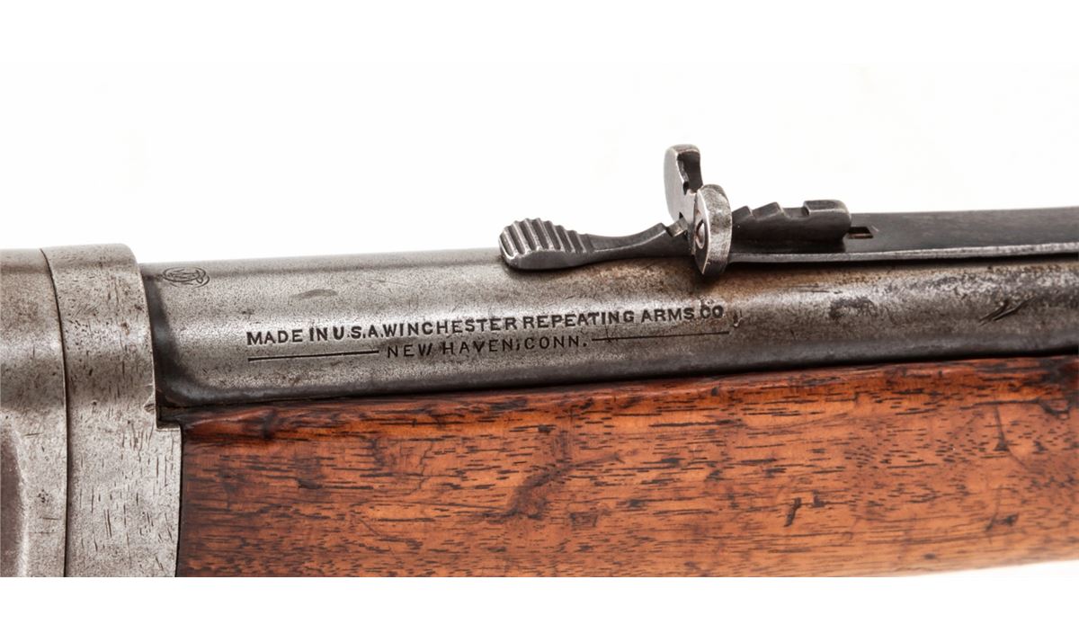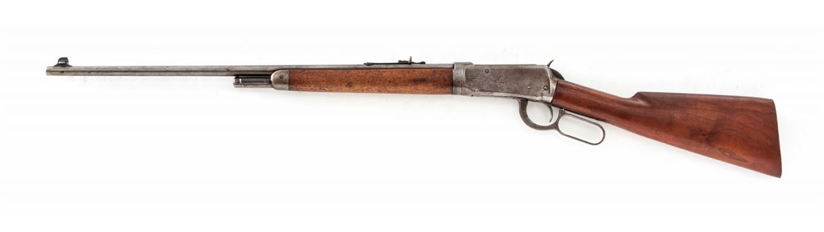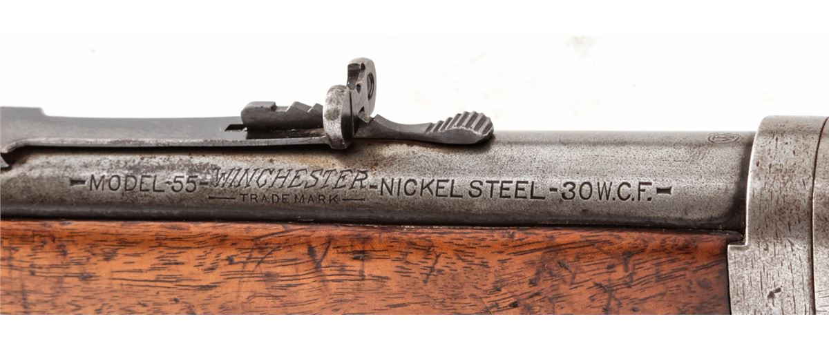 Winchester Model 55 Lever Action Takedown Rifle, #8965, .30-30 cal., 24'' tapered round barrel with half mag, blue finish, walnut stock and forend. Mfg'd 1928. Condition is good retaining approx. 10%-20% original finish, with scuffs and scratches to metal surfaces and finish in only the most protected areas. Stock is fine and shows evidence of good quality rework. Forend remains in original condition with moderate scuffs, scratches and oil darkening. Action is good, bore is fair. Est.: $600-$800. (C&R)