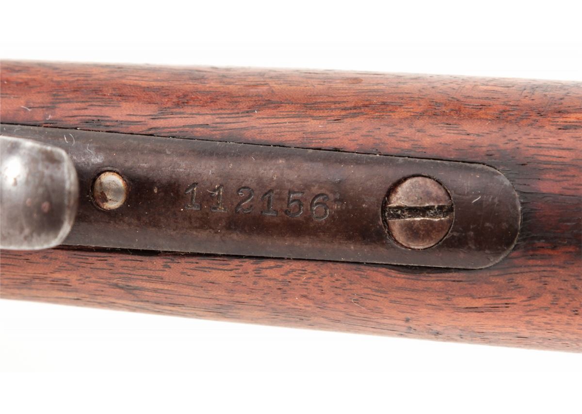 Winchester Low-Wall Single Shot Rifle, #112156, .25-20 SS cal., 27'' octagonal barrel of No. 1 weight, walnut stock and forend, with period scope and rings. Mfg'd 1919. Condition is very good retaining approx. 85% blue. Stock with moderate scuffs and scratches. Good action, bore and optics. Exterior of scope with flaking to finish, yet still retaining approx. 80%. Est.: $500-$750. (C&R)
