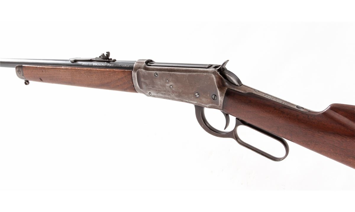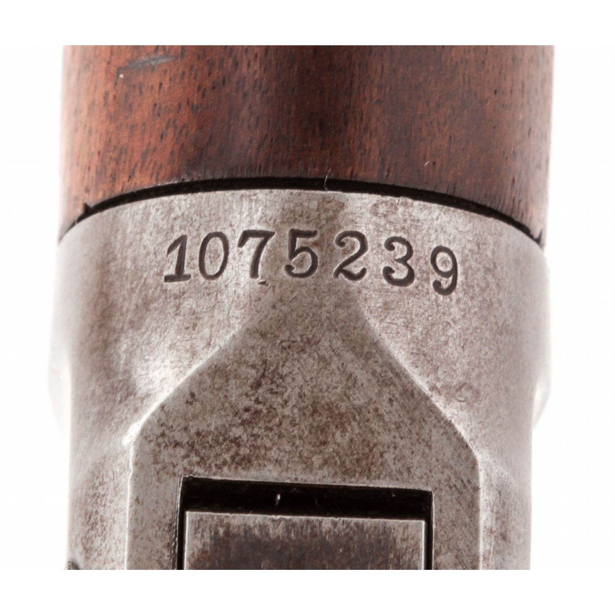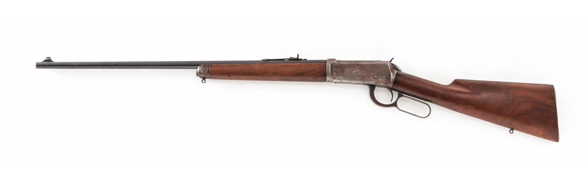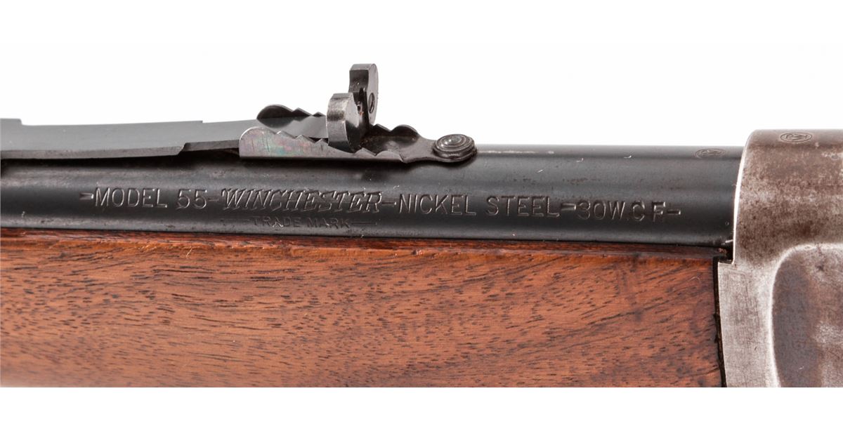 Winchester Model 55 Lever Action Rifle, #1075239, .30-30 cal., 24'' tapered round barrel, button mag, blue finish, walnut stock with fluted comb and steel buttplate. Mfg'd 1929. Condition is fine. Barrel assembly retains approx. 92% blue; frame with approx. 30% with most of the blue in protected areas. Stock with light scuffs and general smoothing, and added swivel eyelets. Good action, bright bore. Est.: $500-$750. (C&R)