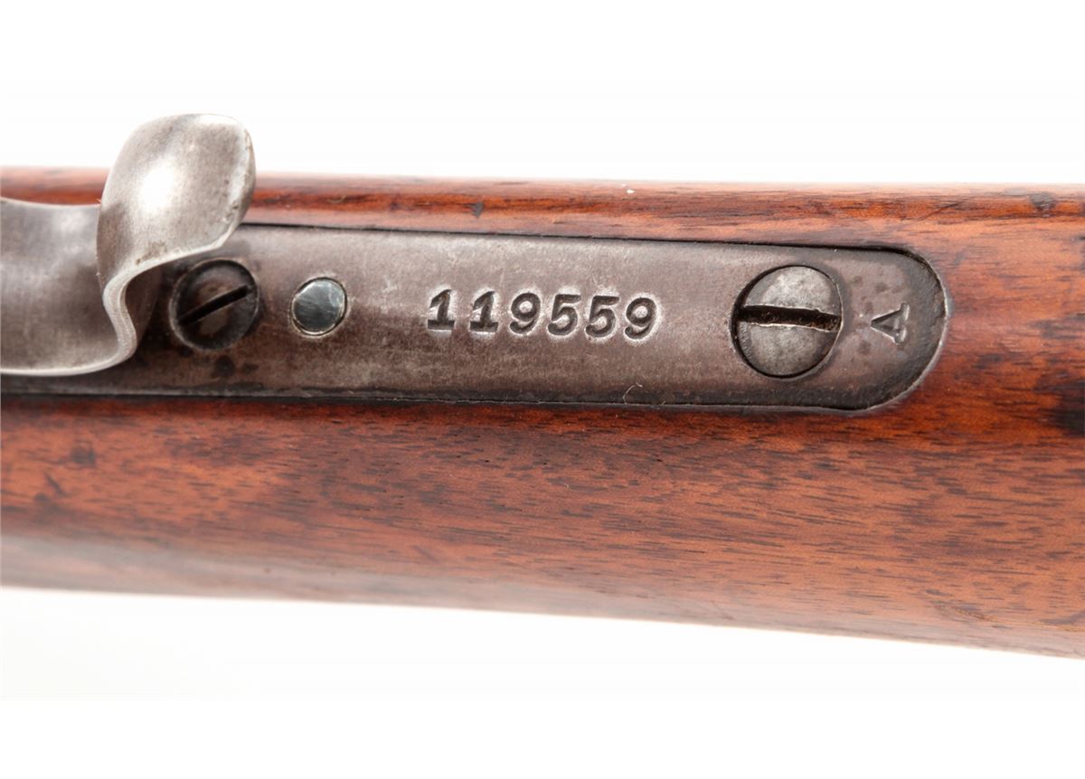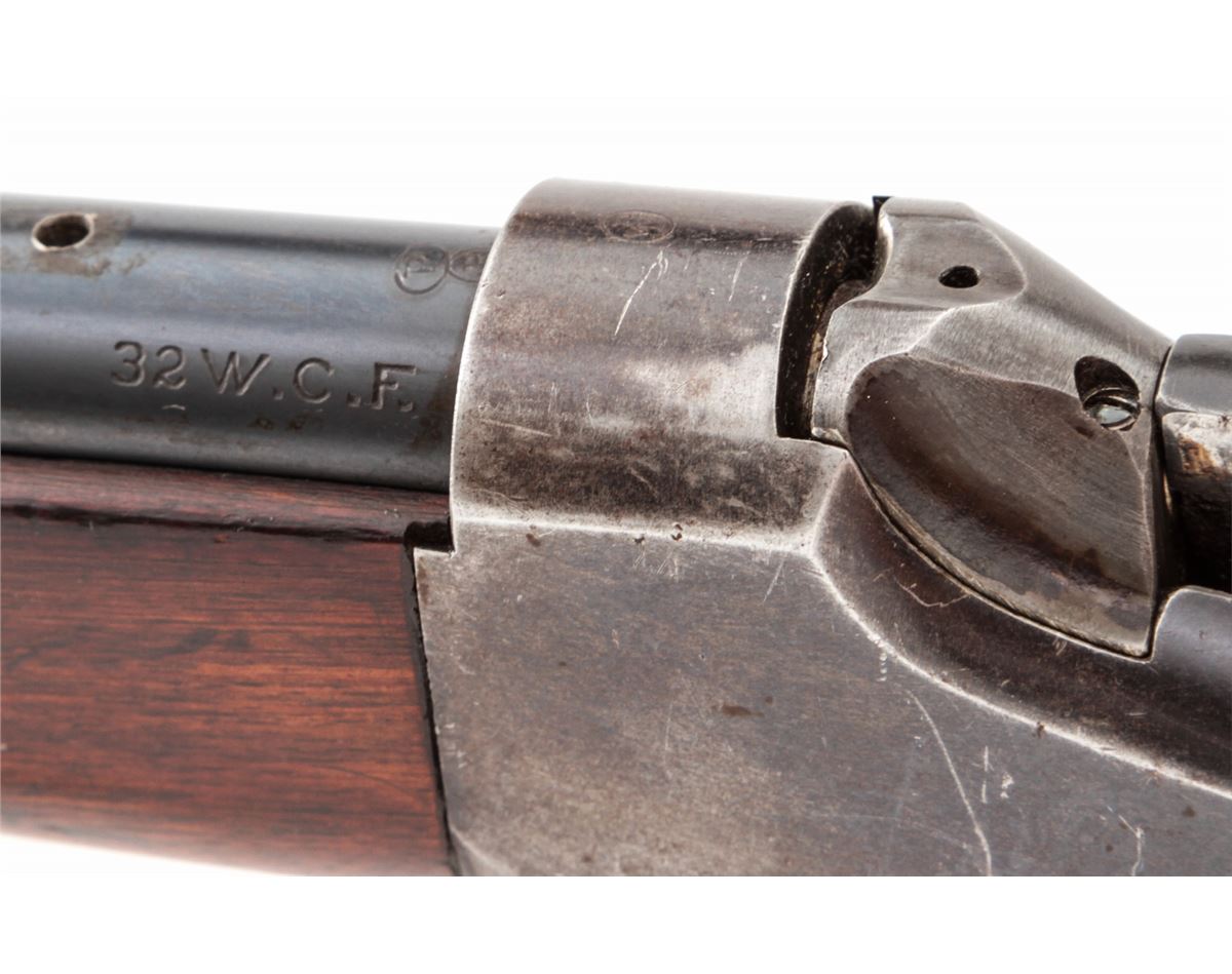 Winchester Low-Wall Single Shot Rifle, #119559, .32 WCF cal., 28'' round barrel of No. 1 weight, drilled and tapped for dovetail scope blocks, original rear sight has been replaced in favor of a Lyman two-leaf rear sight, front sight is a blue white bead Beech's combination sight; blue finish, walnut stock, factory single set trigger. Mfg'd 1919. Condition is very good with additional holes in barrel, retaining approx. 80%+ blue finish. Upper tang area shows evidence of now-removed tang sight; plug and tang screw are not original. Shotgun buttstock with light to just moderate scuffs and oil darkening. Factory hard rubber buttplate with small purpose-made pinpricks to backside. Good working set trigger, crisp action, fine bore. Est.: $450-$650. (C&R)