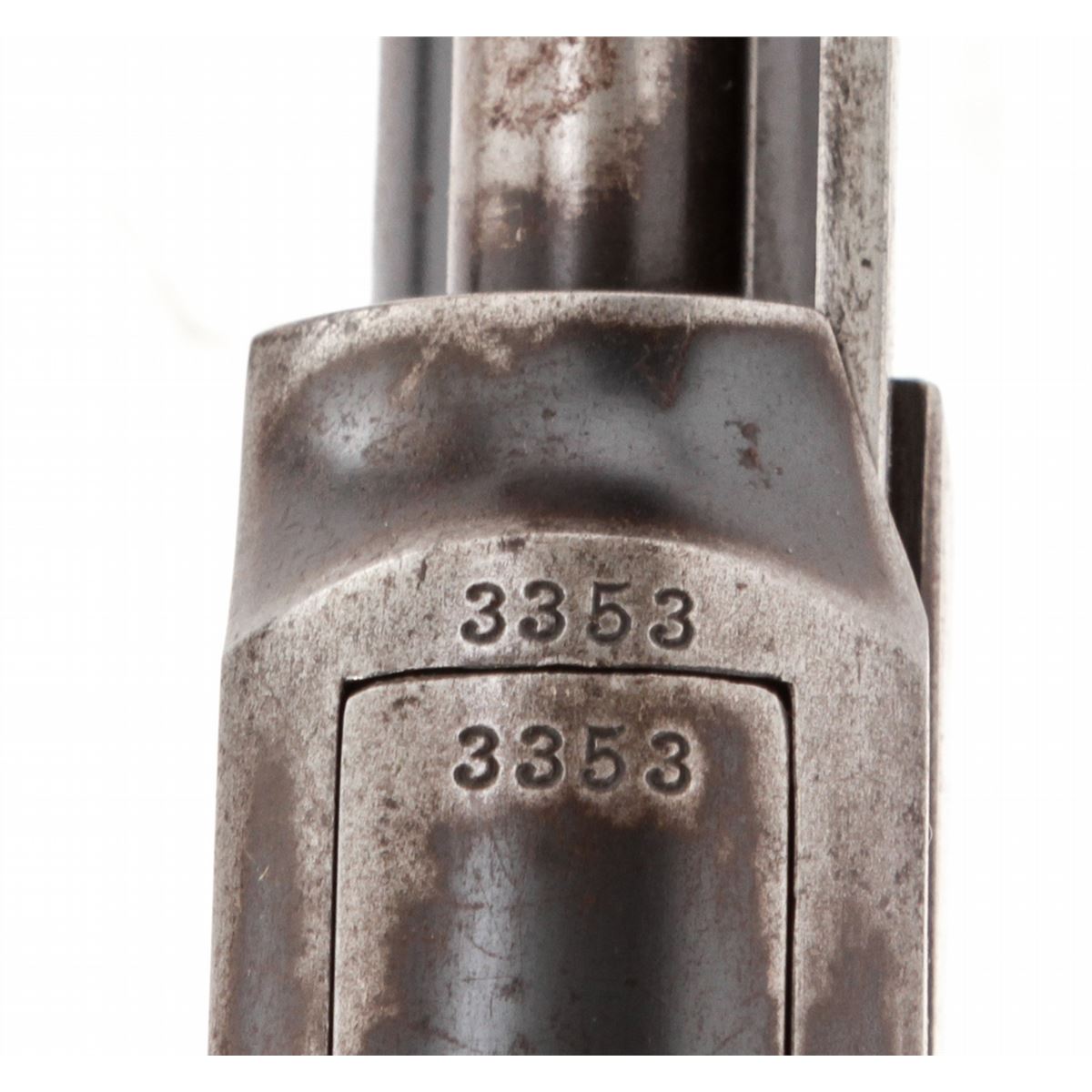 Early Winchester Model 61 Slide-Action Rifle, #3353, .22 S,L&LR cal., 24'' barrel, blue finish, walnut stock with small 11-groove handguard. Standard front sight, rear sight with dovetail blank, and Marbles type peep sight at upper tang. Mfg'd 1932. Condition is very good to near fine. Barrel and mag tube retain approx. 85%-90% thinning blue, as does frame. Stock with light scuffs and scratches and thru-wear to varnish. Good action, bright bore. Est.: $500-$750. (C&R)