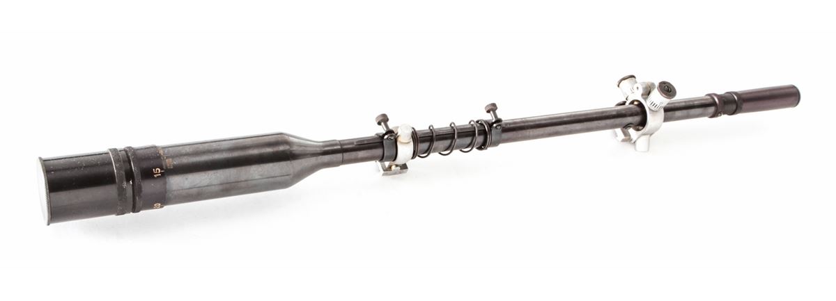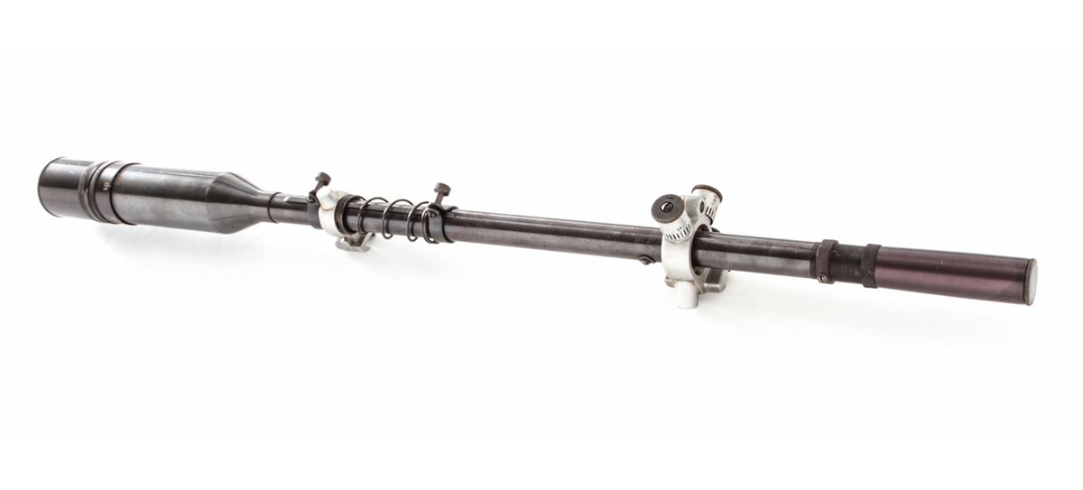 Davis Spot-Shot Rifle Scope, 20 power, 26'' in length, 1.5'' diameter, with forward objective area measuring 1-3/4''. Complete with field scope covers and recoil spring. Standard fine crosshair reticule. Condition is fine retaining approx. 92% thinning blue with light runner marks in actioning area. Optics are clear with very minor aberration to vertical crosshair which detracts little. Eyepiece may have been re-colored at one point. Est.: $250-$400.