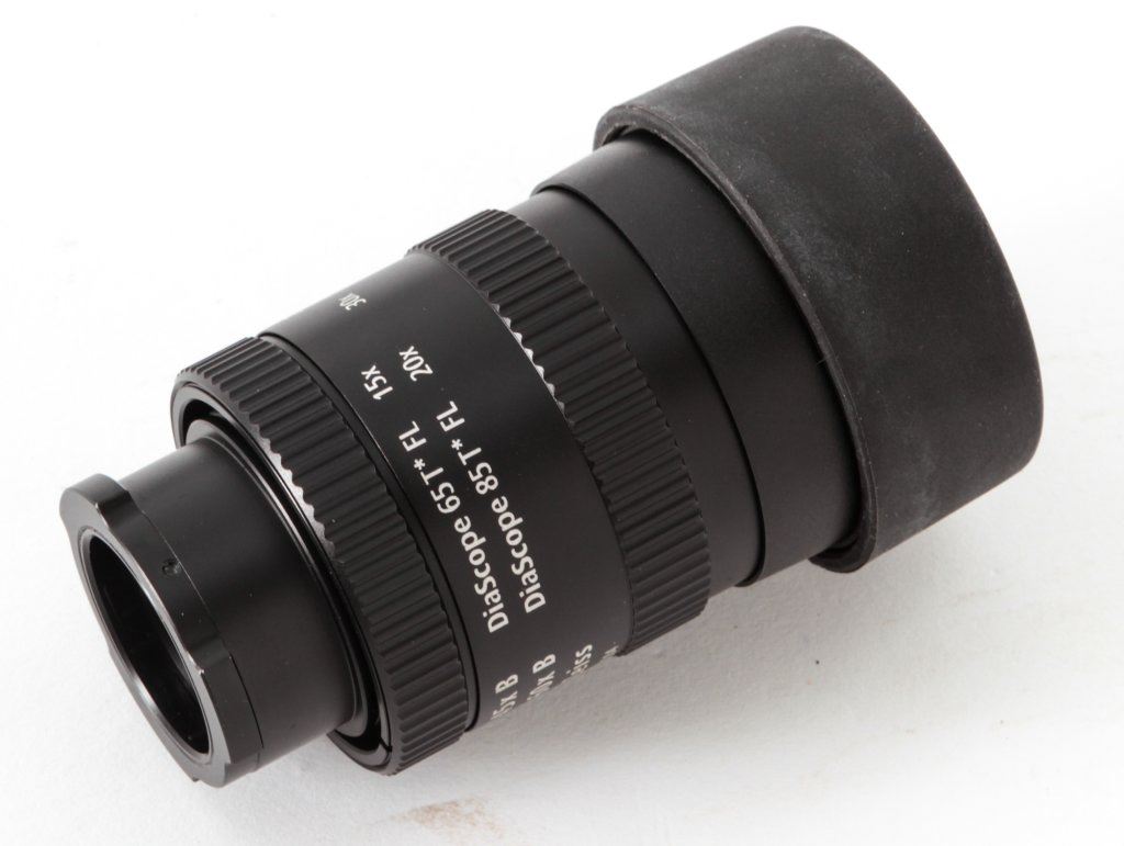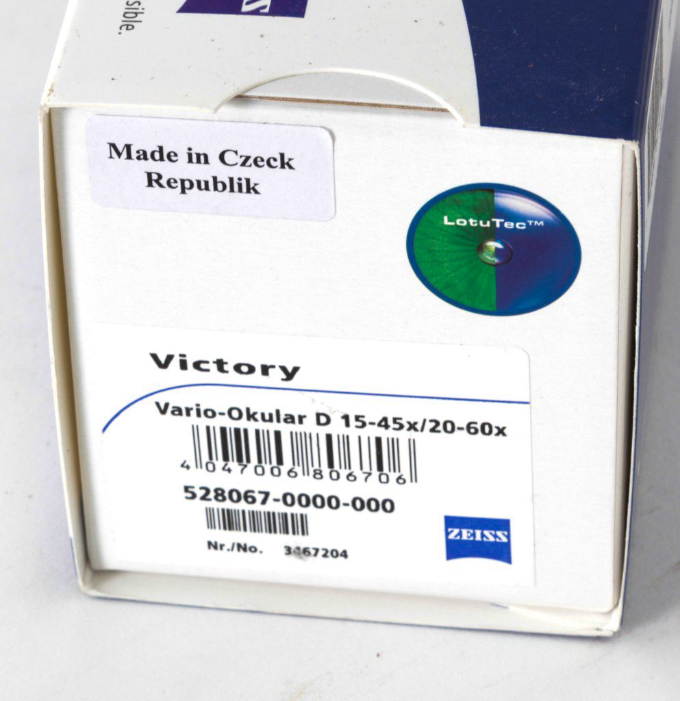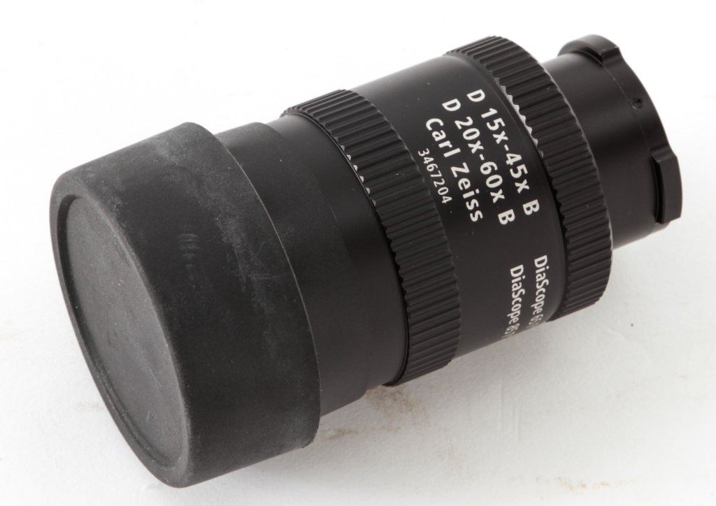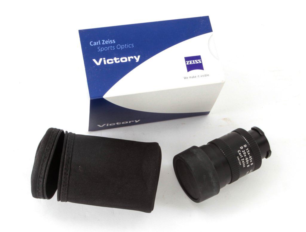 Zeiss Vario-Okular D 15-45x/20-60X Eyepiece, with pouch, with adjustable magnification. A vital spotting scope accessory. Condition is excellent, in original box with instructions. Retails @ $629.95. Est.: $350-$450. (Field Time)